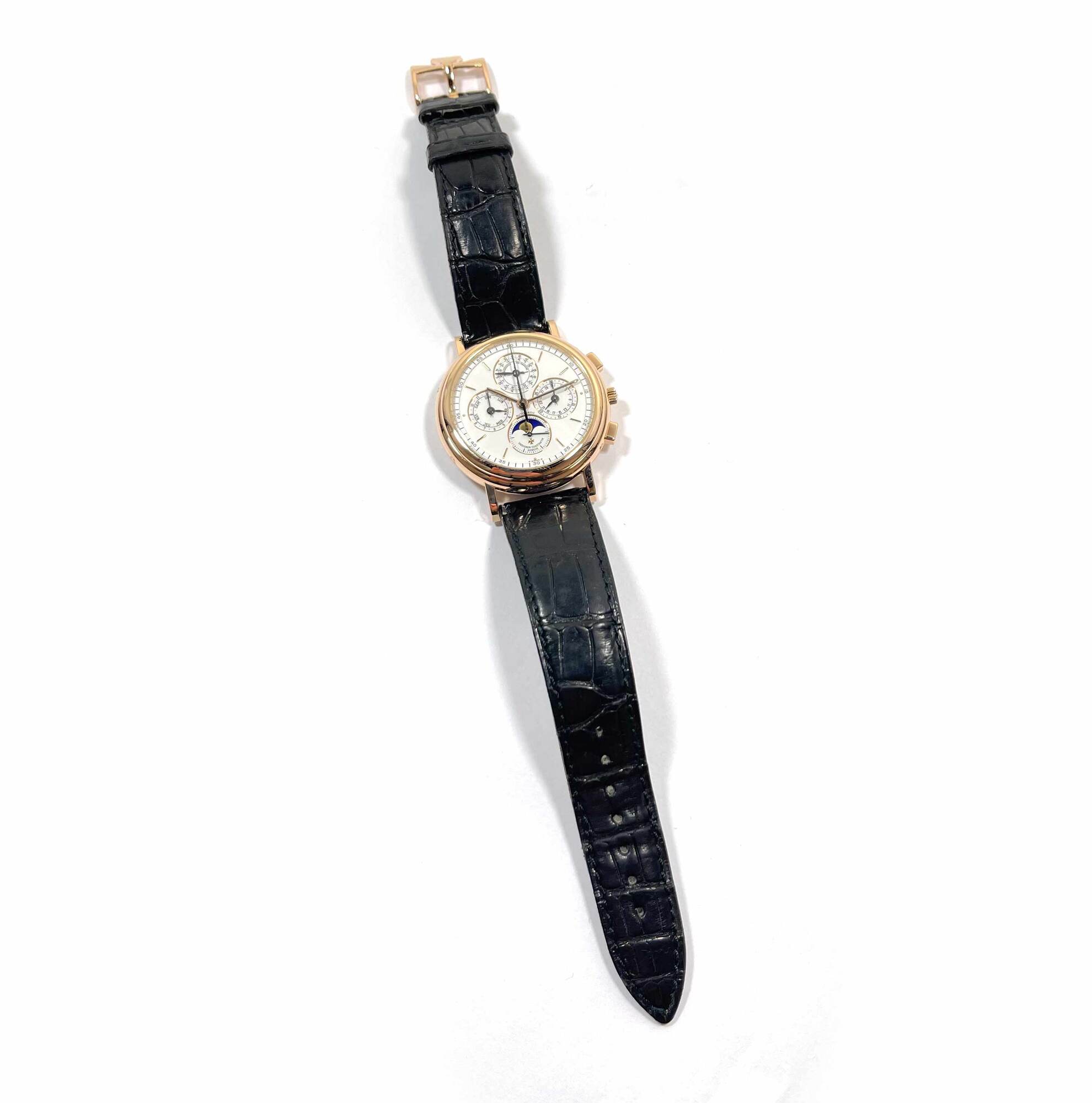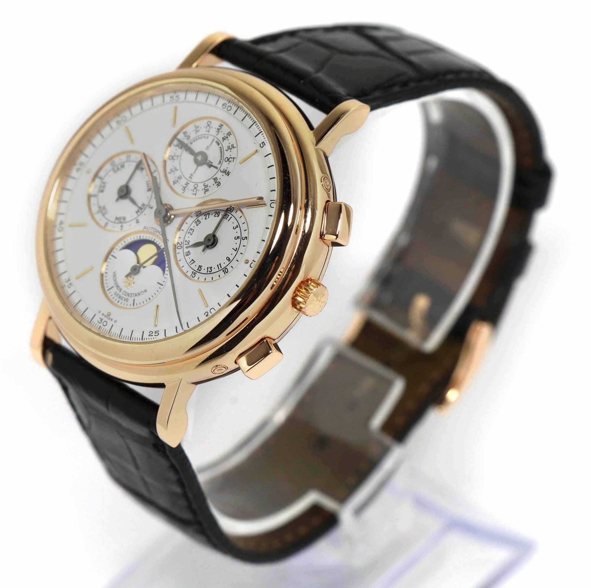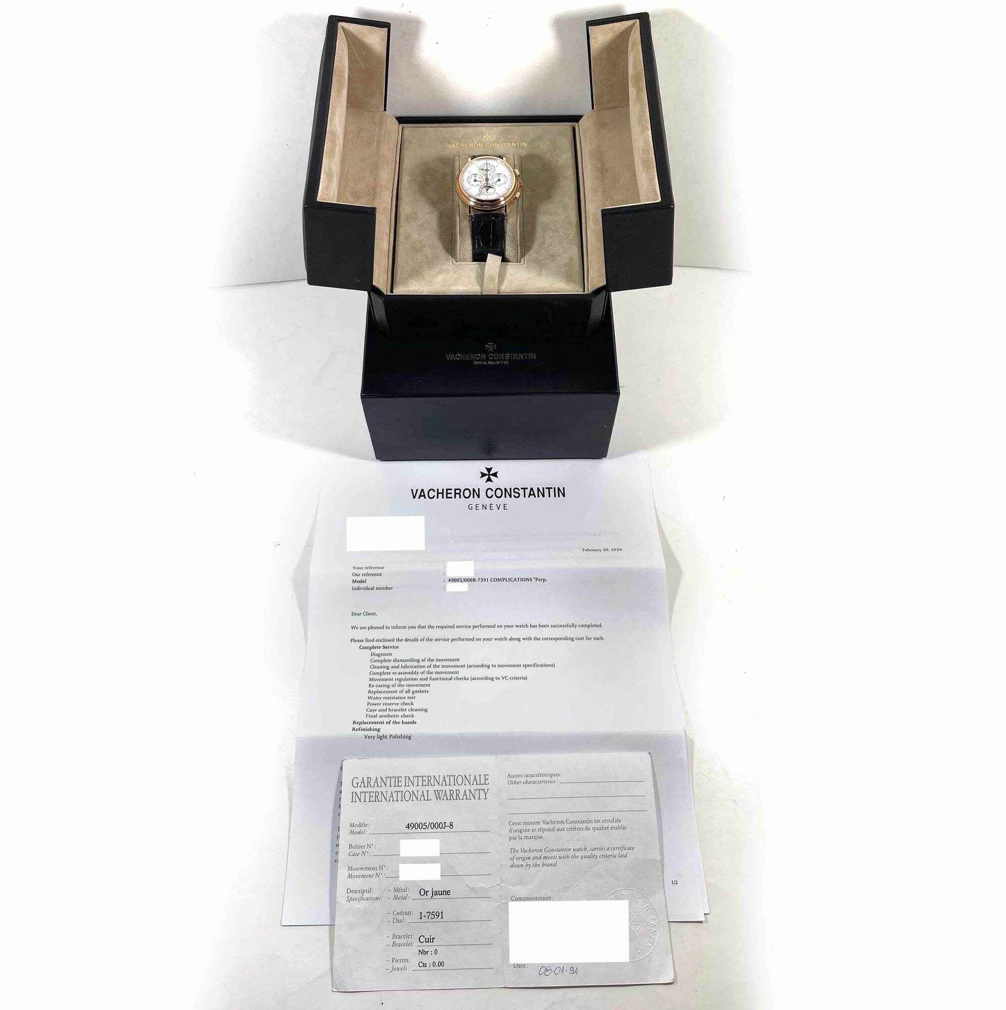 Read Morethis vacheron constantin is in excellent condition and comes with its box, service papers, and warranty card dated august 1st, 1994 as shown in the pictures attached. This watch was completely serviced by vacheron constantin in february, 2024. The black leather strap does show some signs of use but has plenty of wear left in it. The day and months are written in french. Please note the following: the original papers state that the watch is yellow gold, however the watch appears rose gold in person and also the warranty papers show the rose gold reference number. I asked vacheron about this, and they did say that their original records are recorded as yellow gold, but it must have been a typo when the papers were first printed. The serial numbers are matching across the original papers as well as the service papers.