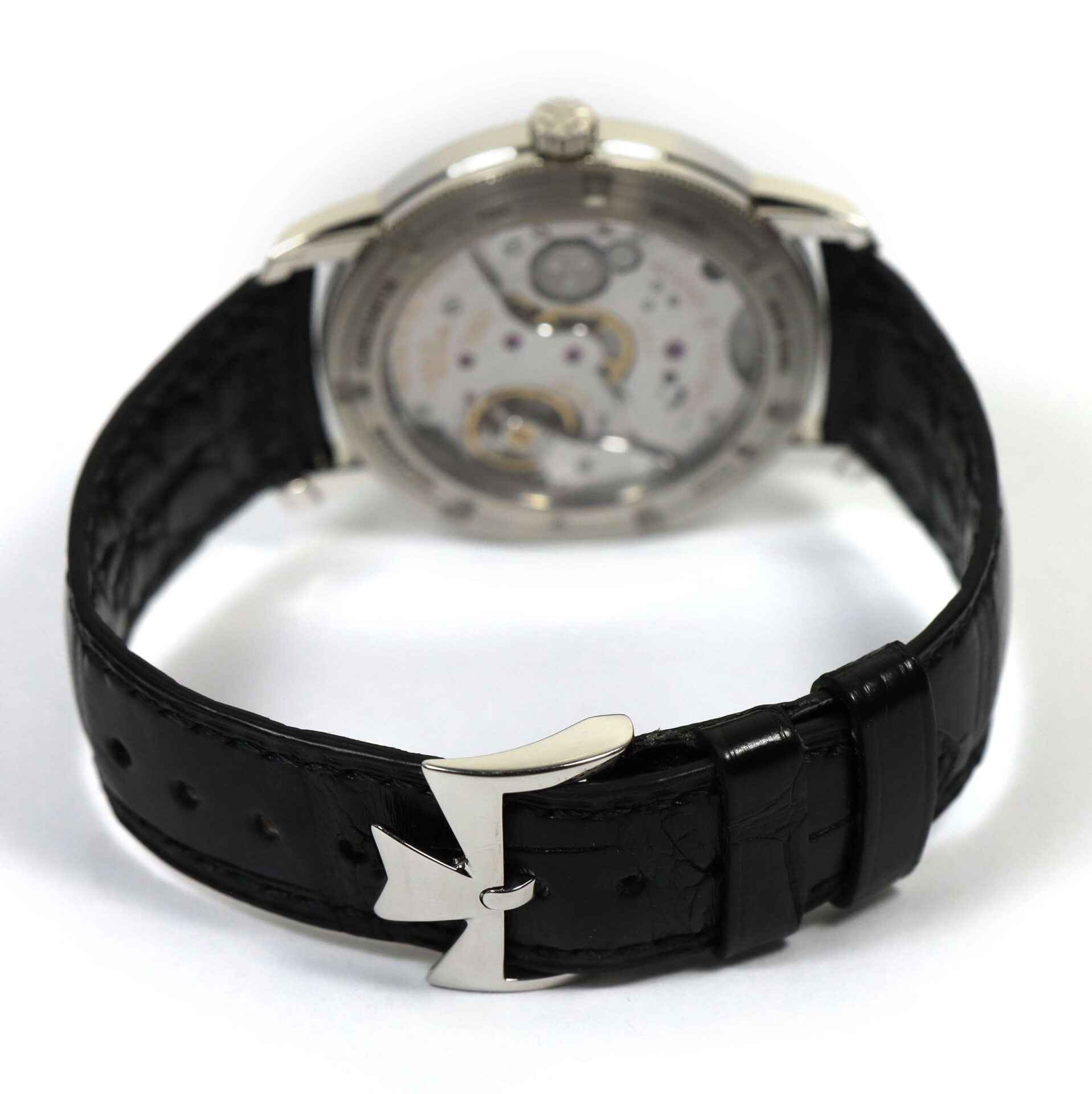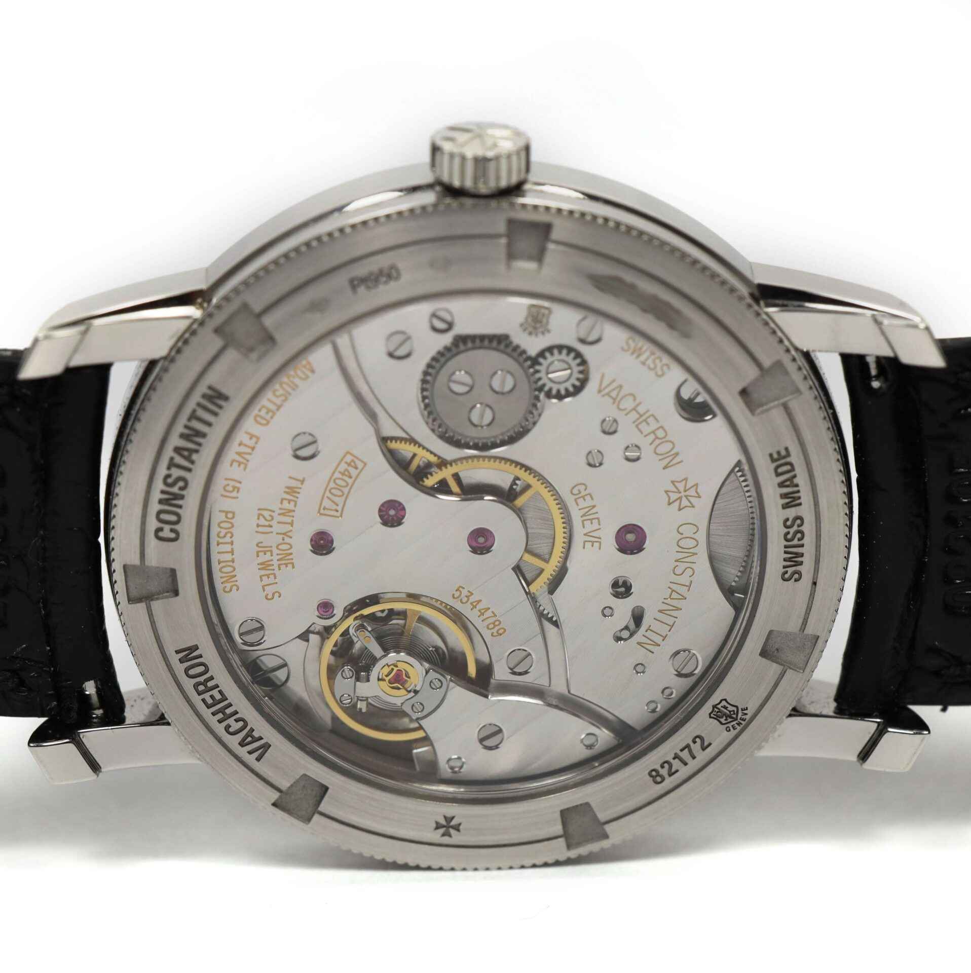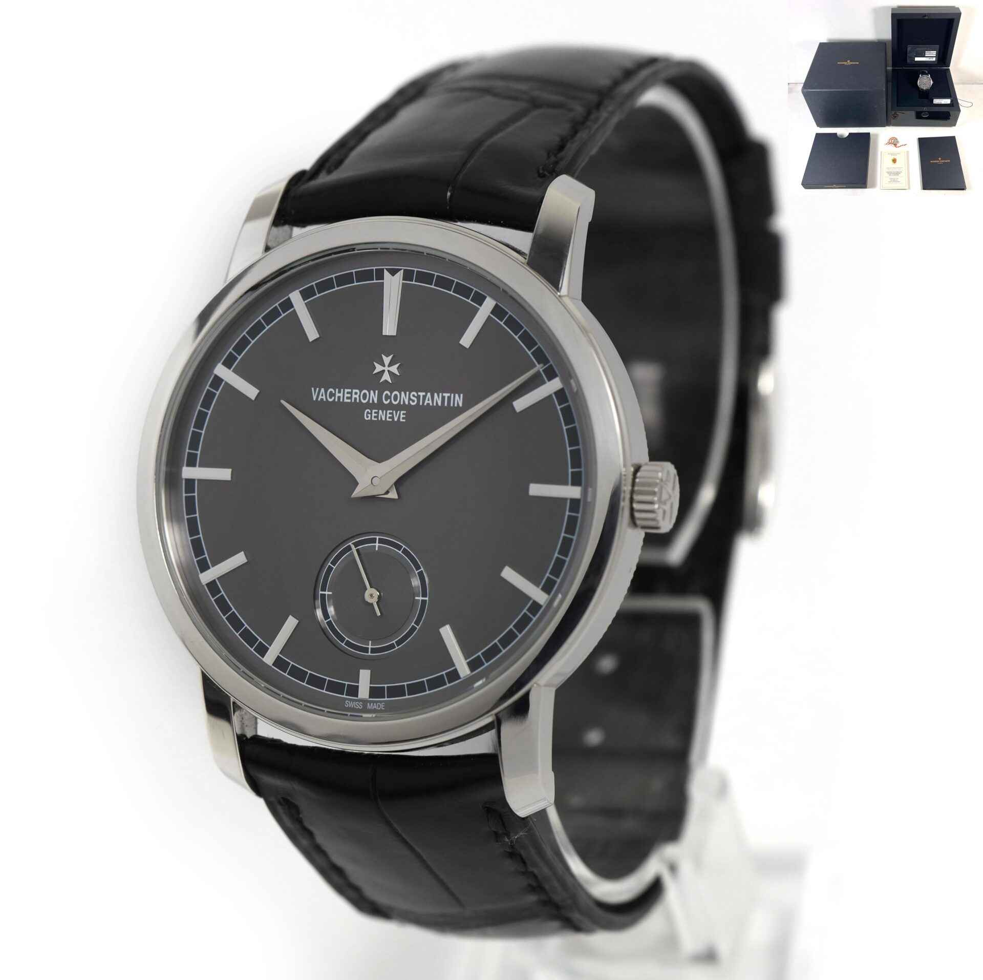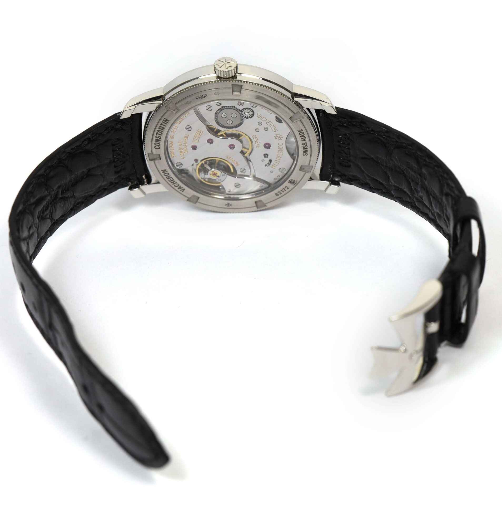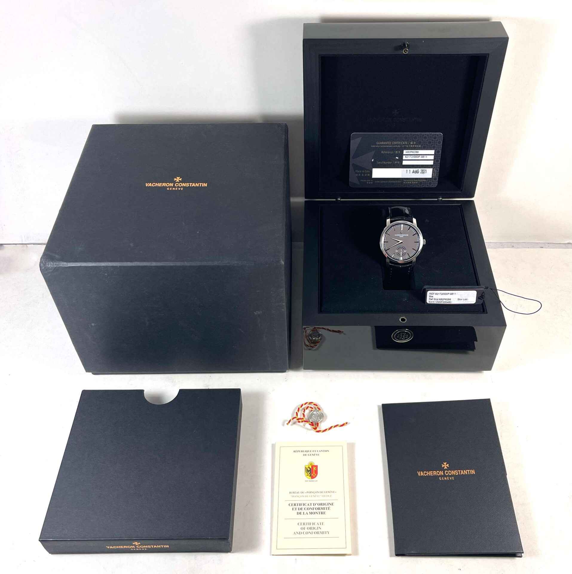 Read Morethis vacheron constantin watch is in excellent condition showing some minor surface wear consistent with preowned watches. This vc comes with its box, booklets, hang tag, and warranty card dated august 11th, 2021. This watch features a 38mm platinum case surrounding a grey dial and comes on a black leather strap. this watch is in stock and available to ship immediately!