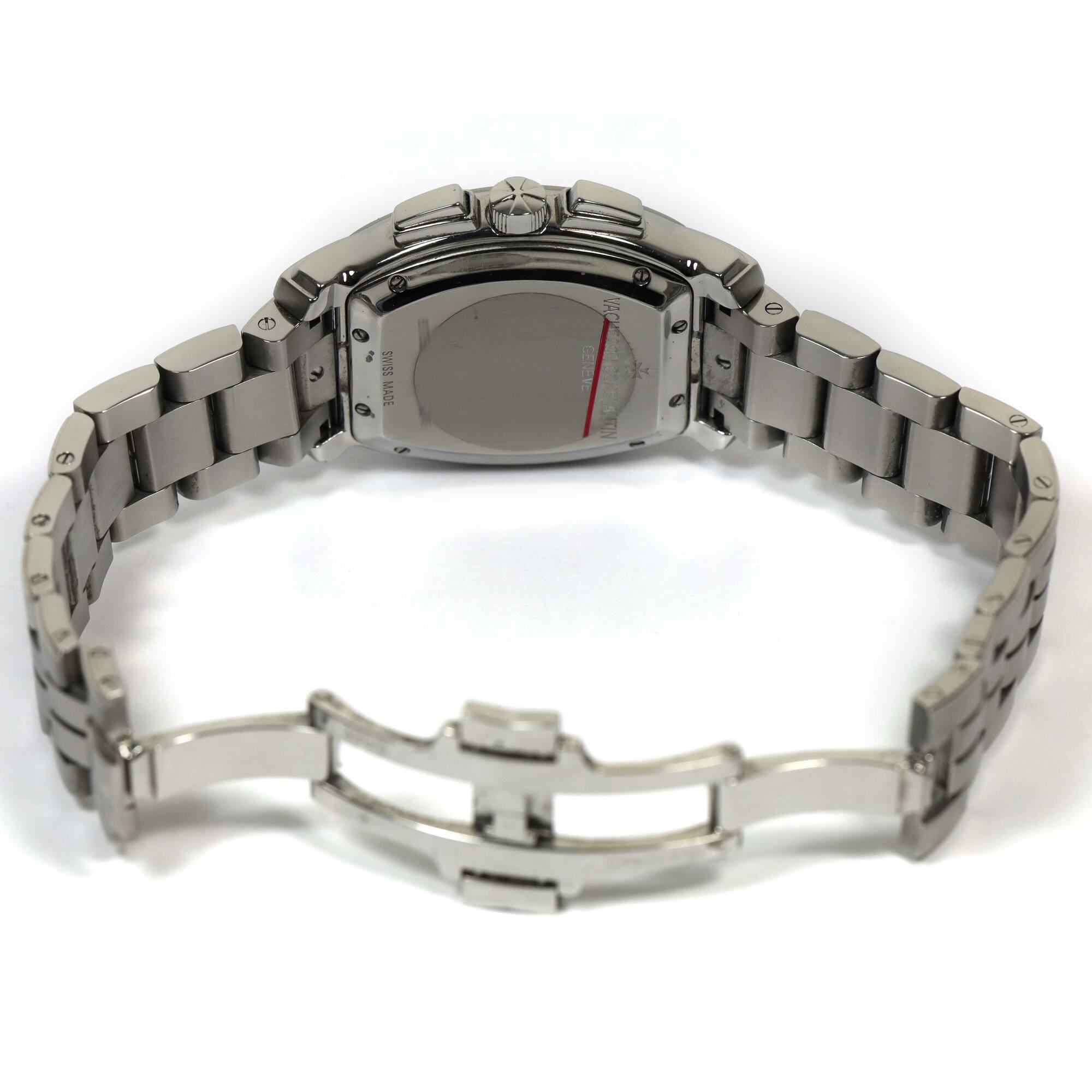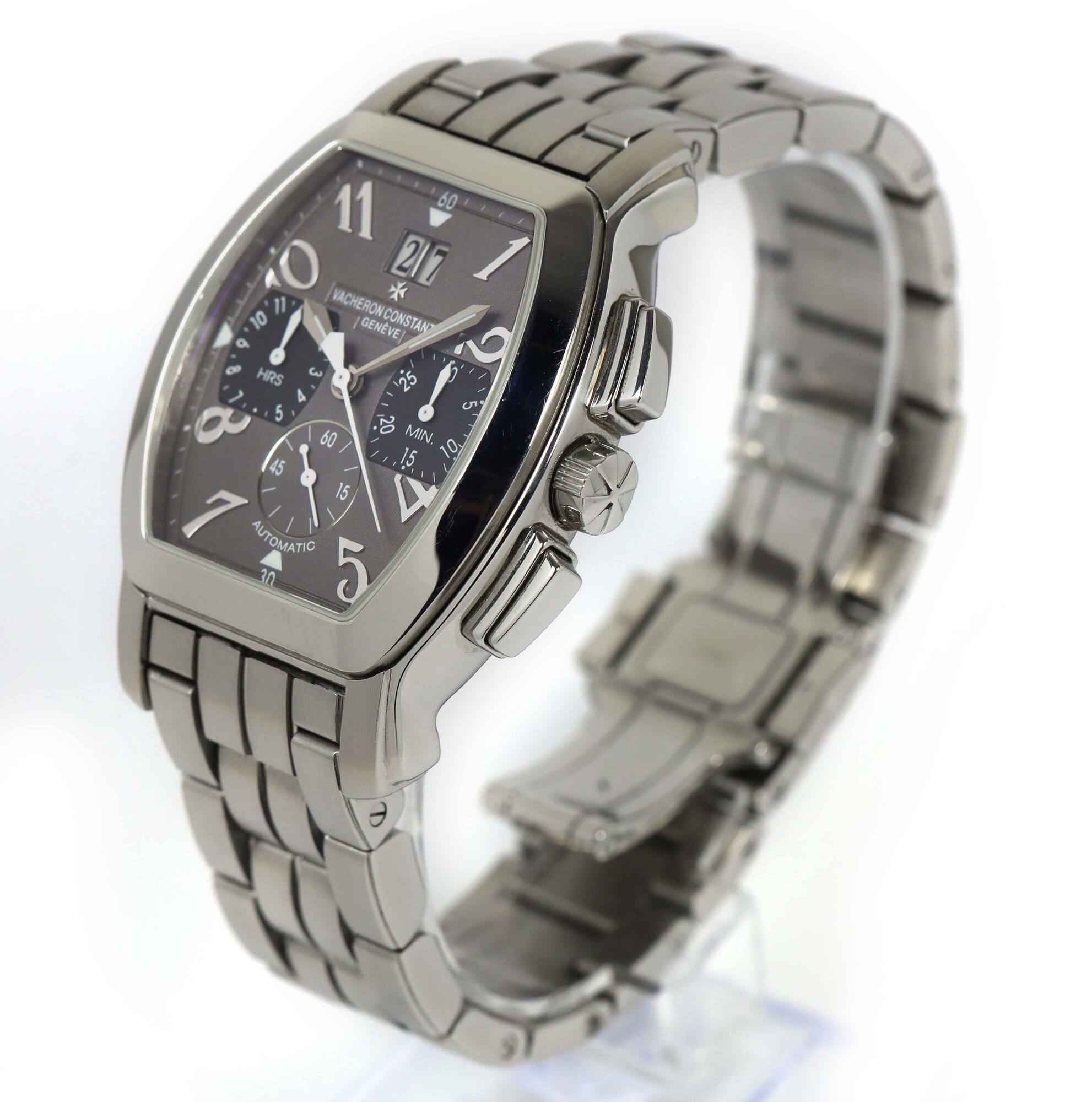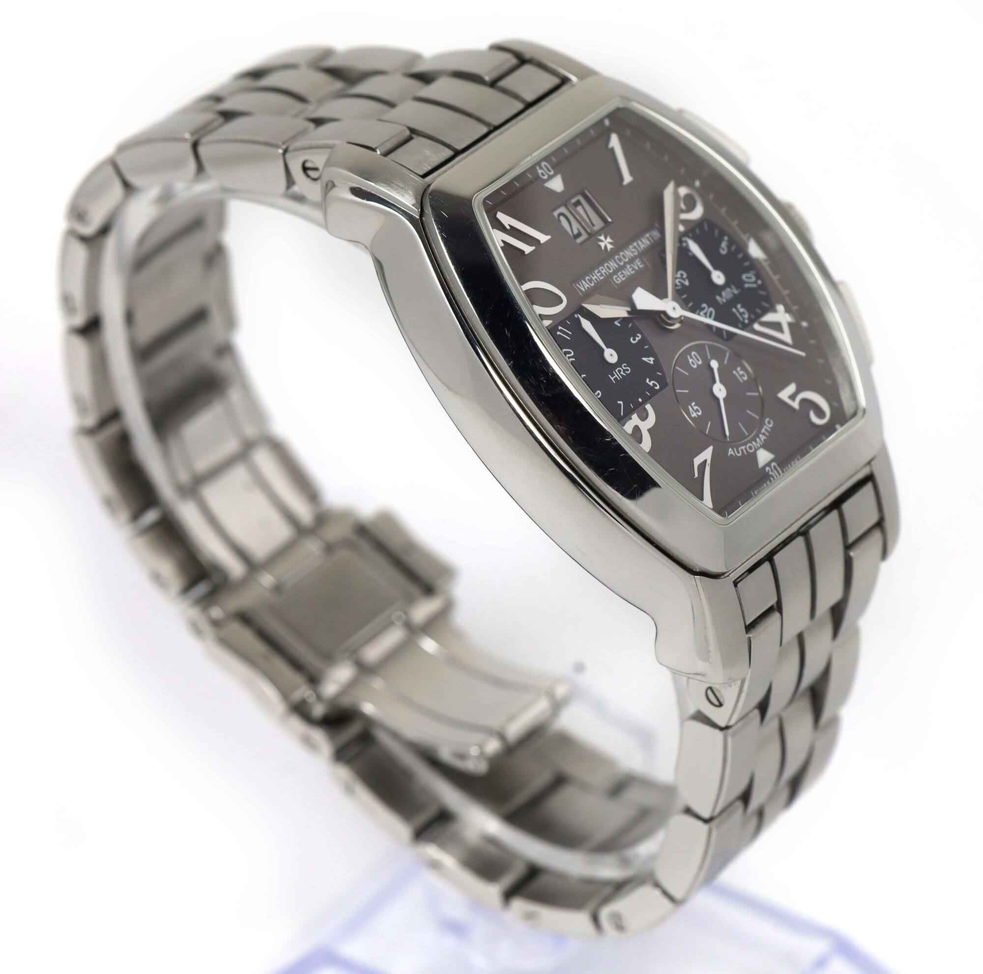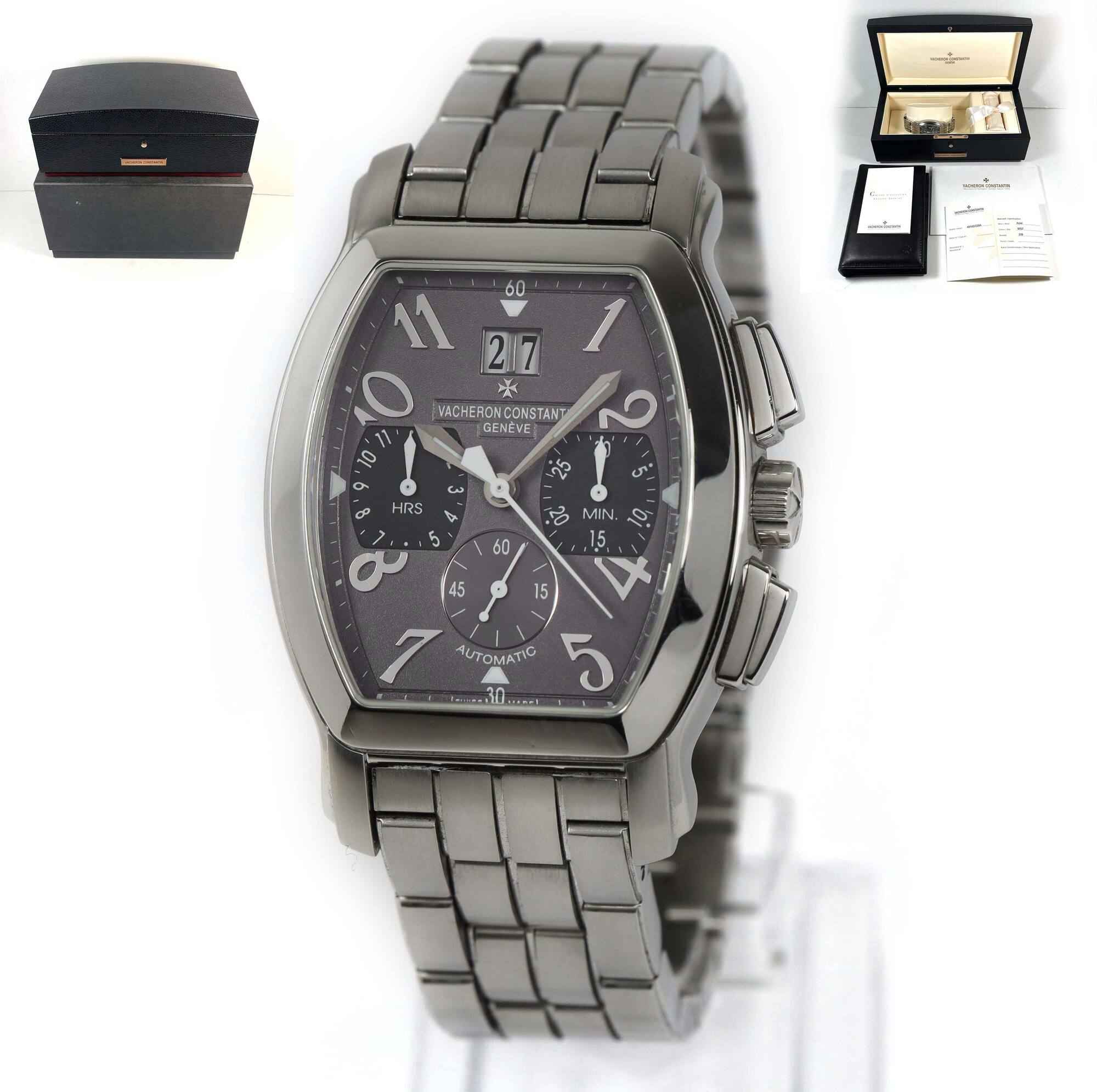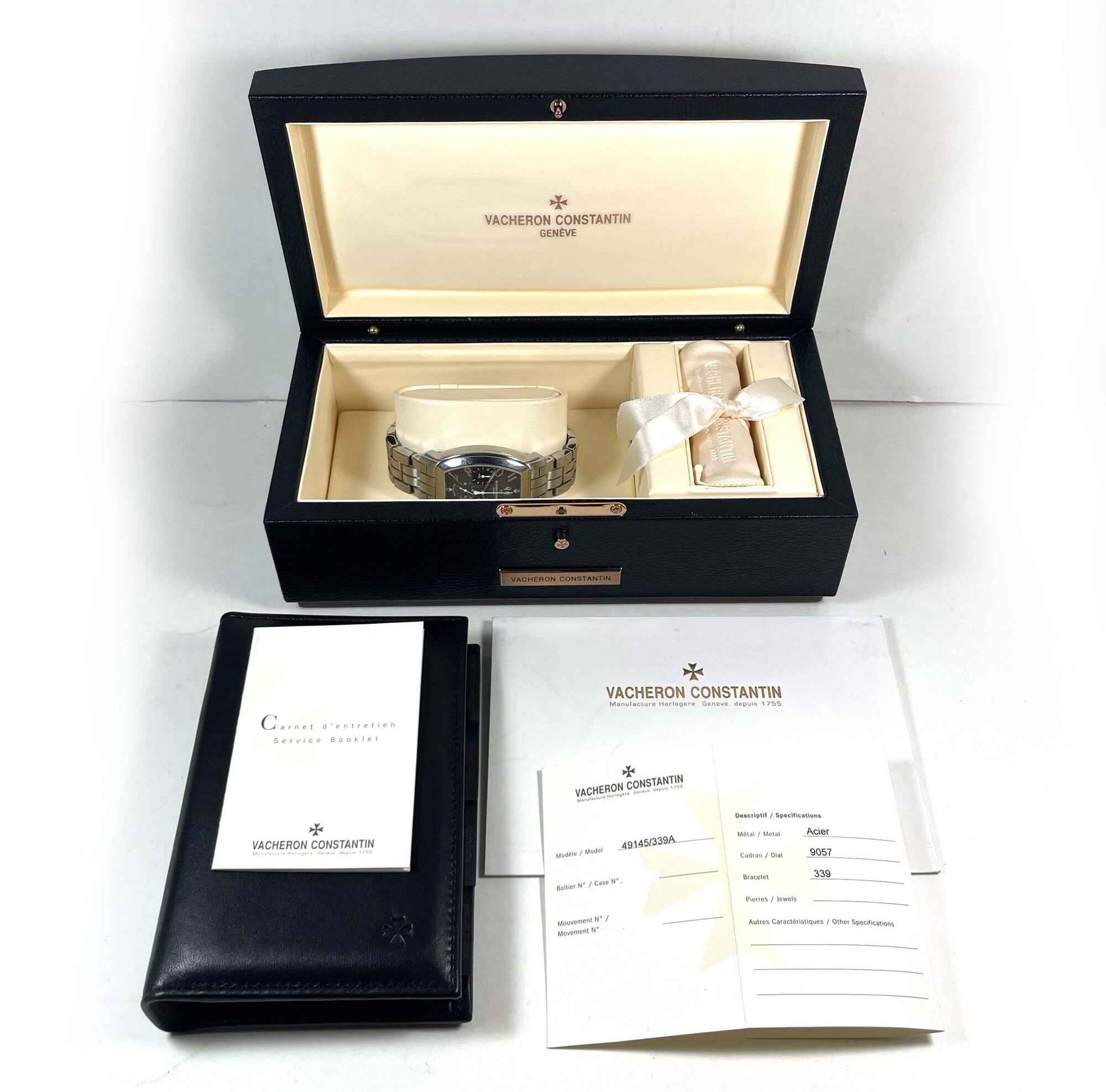 THIS VACHERON WATCH IS IN EXCELLENT OVERALL CONDITION AND COMES WITH ITS BOX, BOOKLETS, AND WARRANTY CARD AS SHOWN IN THE PICTURES ATTACHED. THIS WATCH FEATURES A 37MM X 40MM STAINLESS STEEL CASE THAT SURROUNDS A GREY DIAL AND COMES ON A STAINLESS STEEL BRA...
