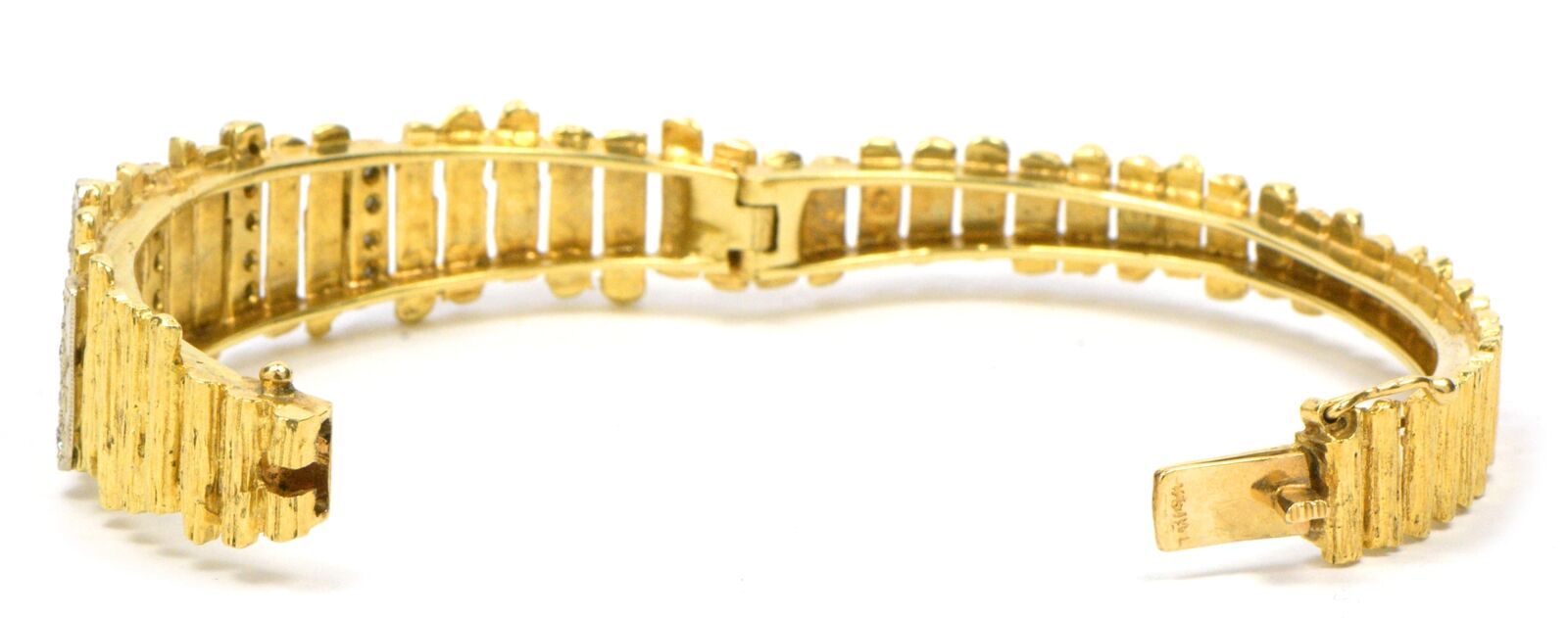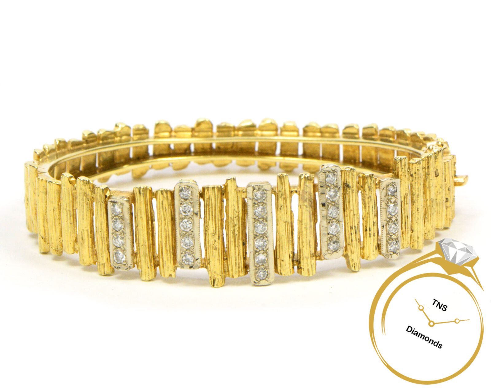 this awesome bracelet is crafted in 14k yellow gold and has a gorgeous bark finish. It features .84 carats, si1 clarity, and f color. The widest part of this bracelet is is 16mm.