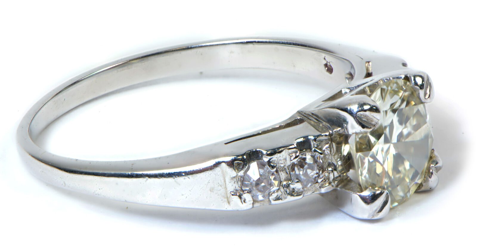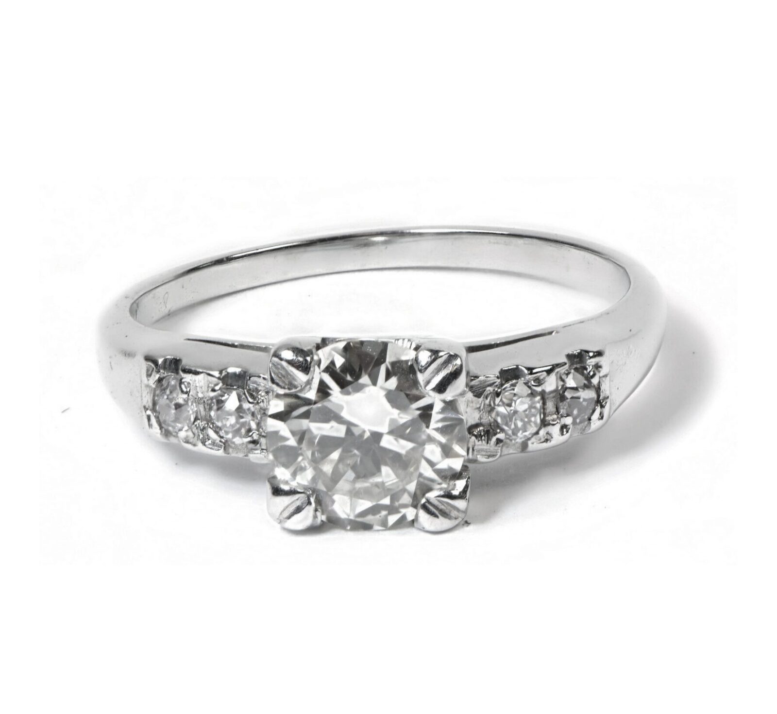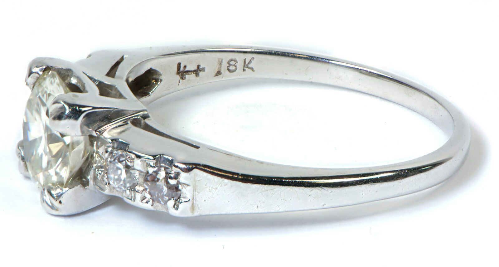 condition: very good gender: women’s jewelry brand: fine jewelry jewelry type: ring weight (grams): 2.5 material: 18k white gold ring main stone: diamond ring main stone carat: 0.85 ring main stone clarity: vs2 ring main stone color: k ring main stone cut: early round ring surrounding stone approximate total carat weight: 0.1 ring surrounding stone clarity: si ring surrounding stone color: g ring surrounding stone material: diamond