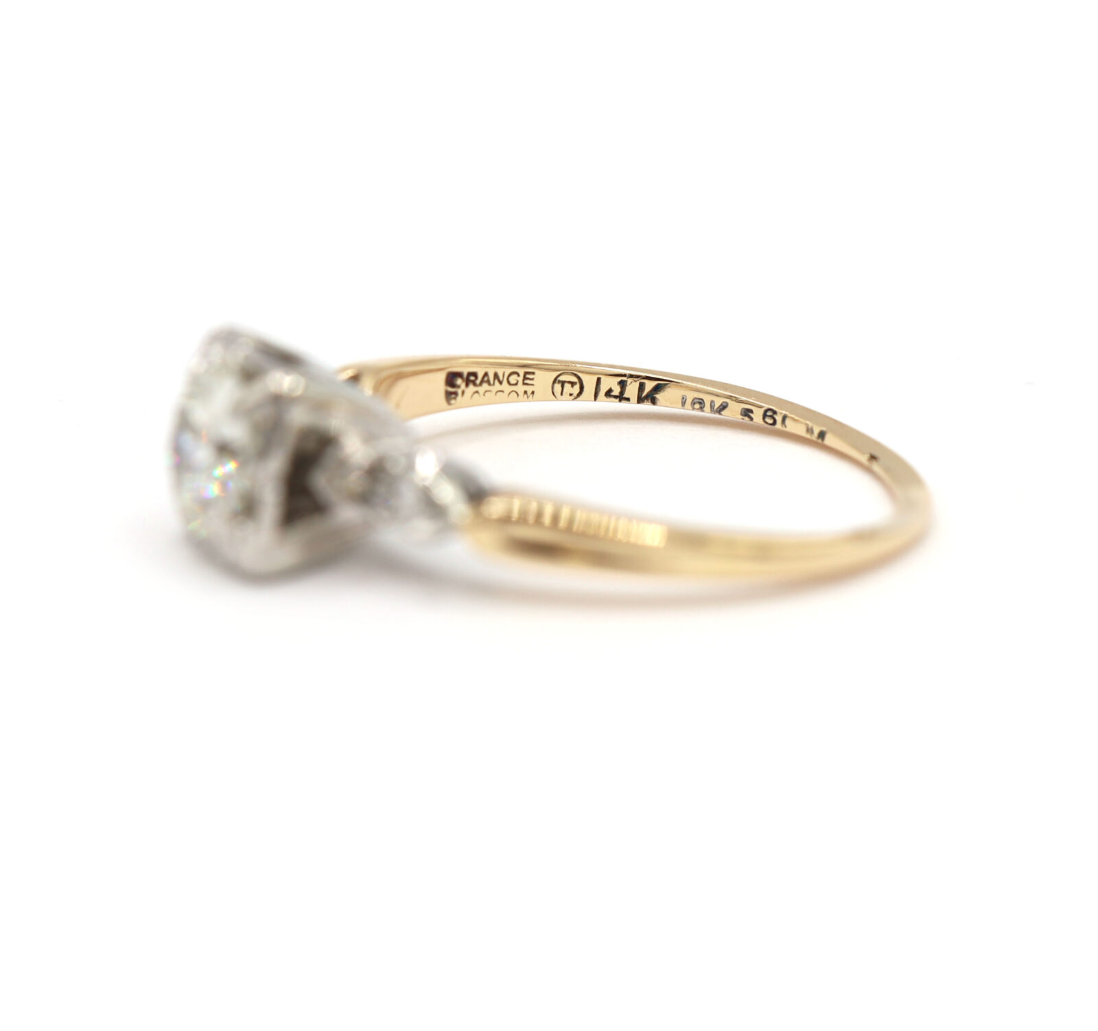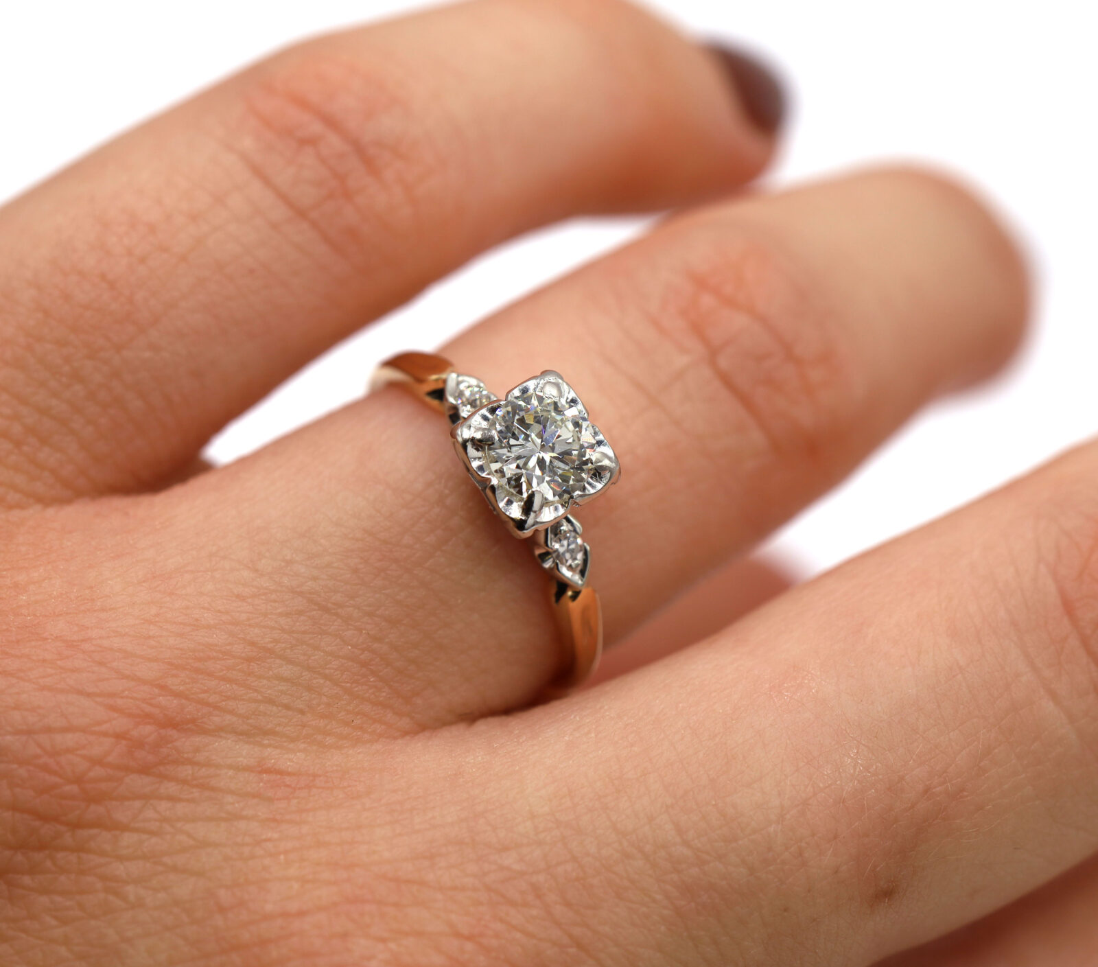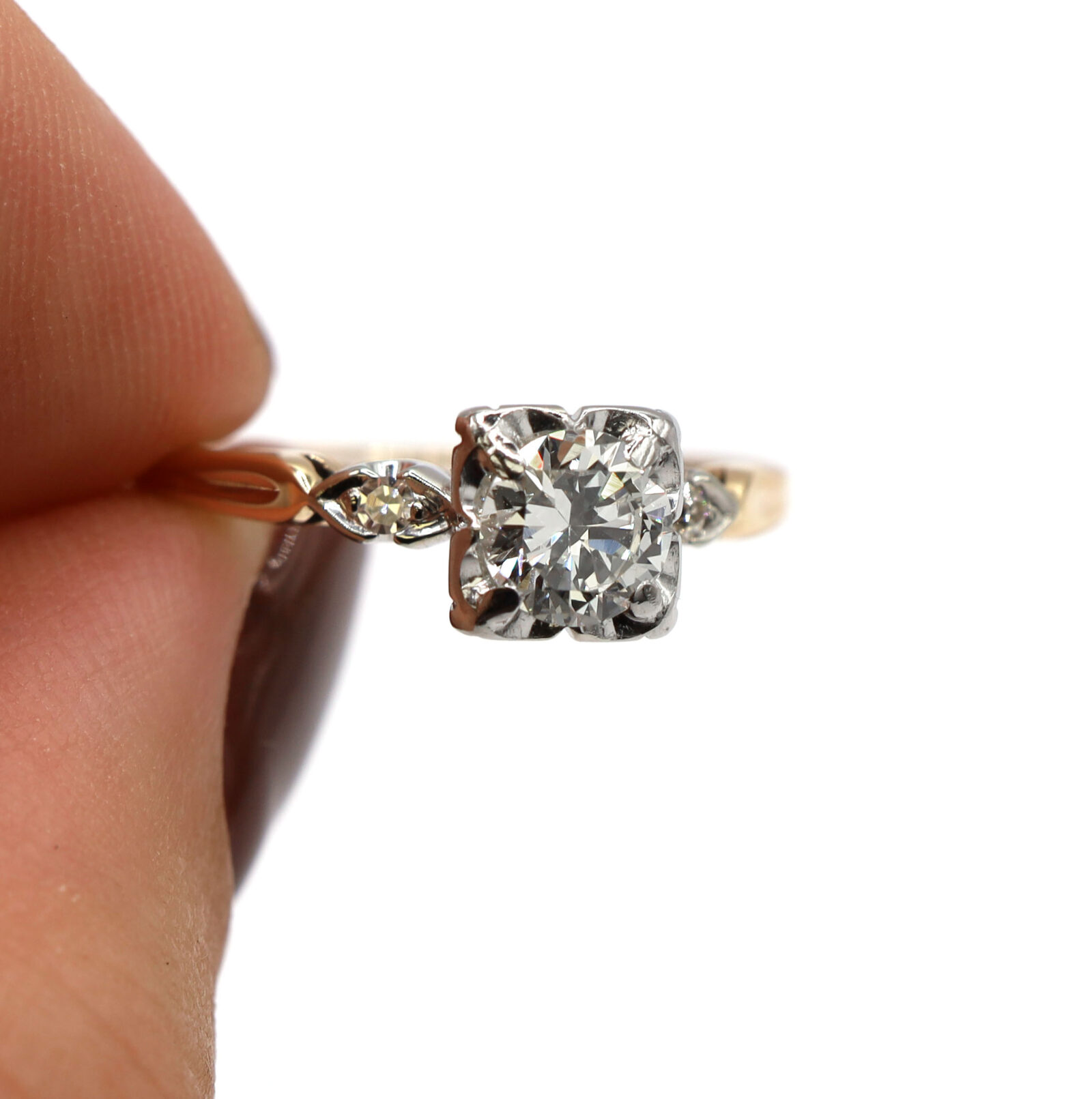 Material: 14k Yellow Gold Ring Size: 5.75 Width of Back: .6mm Weight: 2.2 Grams Center Stone: Natural Diamond Side Stone: Natural Diamond Carat Weight: 0.55 Carat Clarity: VS2 Color: G Cut: Round Brilliant