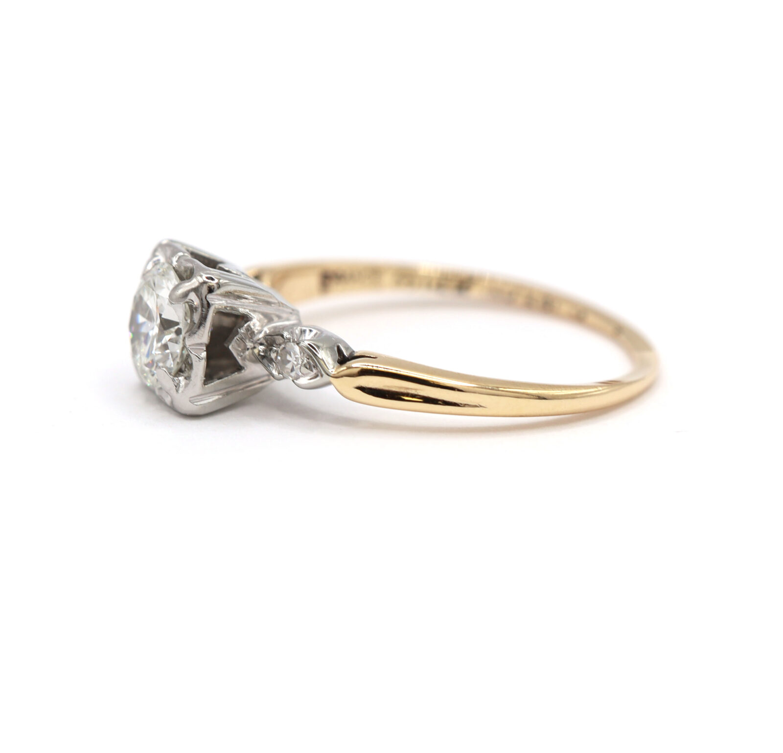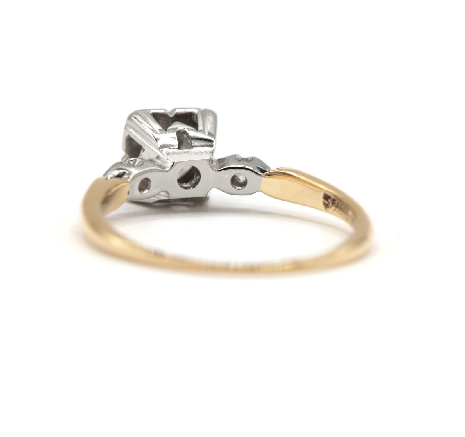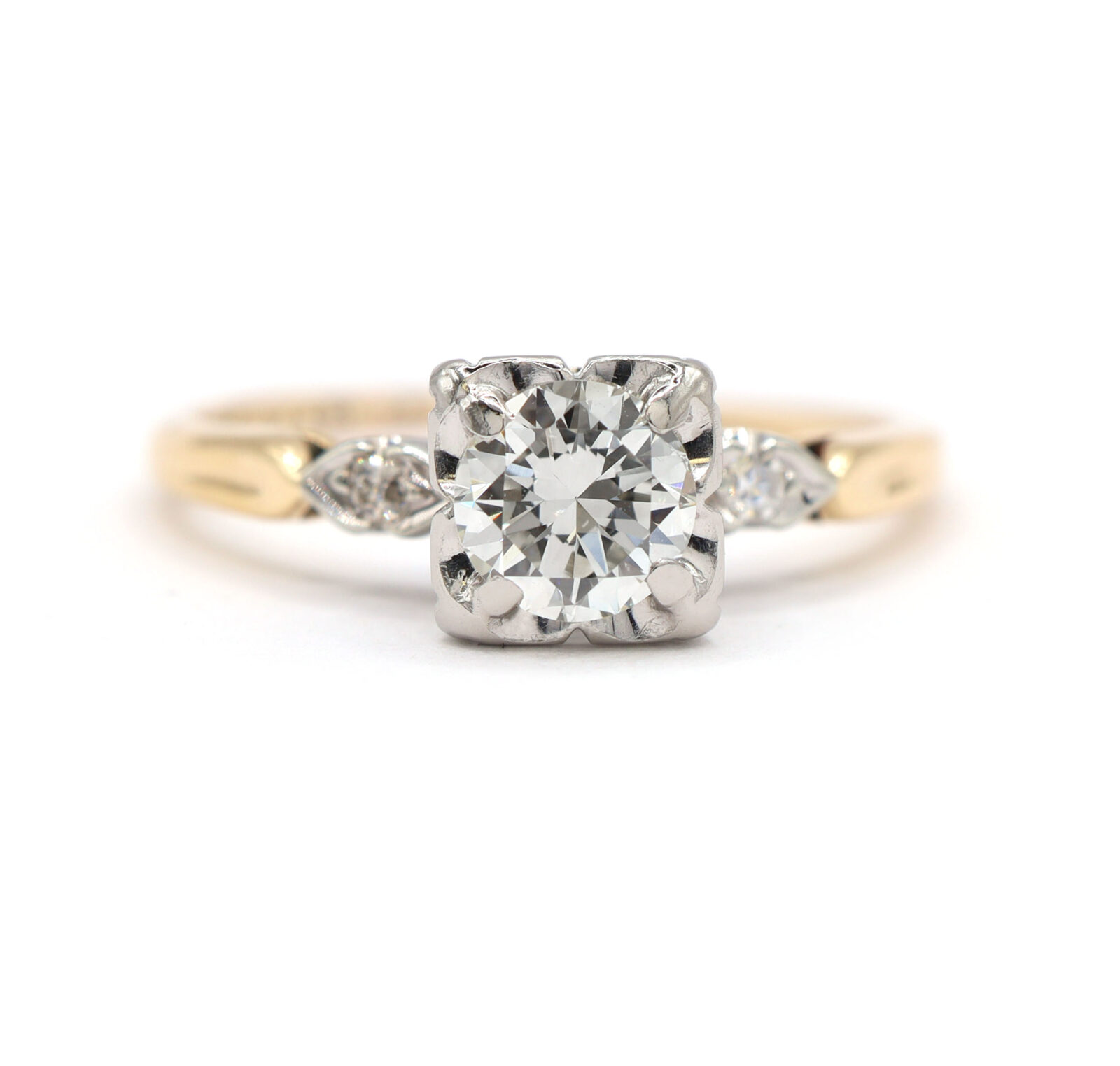 Material: 14k Yellow Gold Ring Size: 5.75 Width of Back: .6mm Weight: 2.2 Grams Center Stone: Natural Diamond Side Stone: Natural Diamond Carat Weight: 0.55 Carat Clarity: VS2 Color: G Cut: Round Brilliant