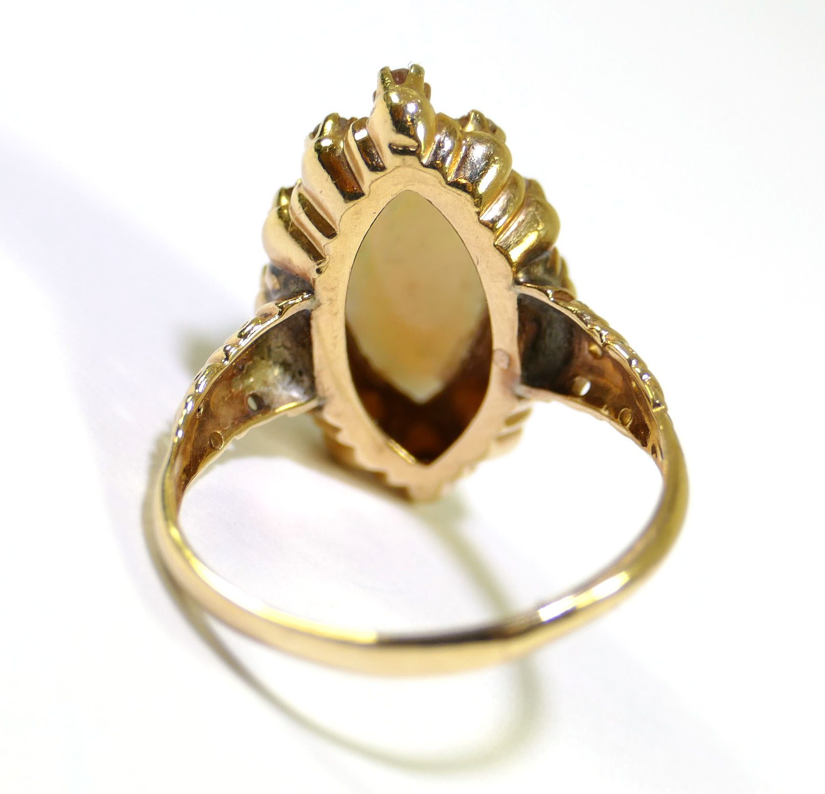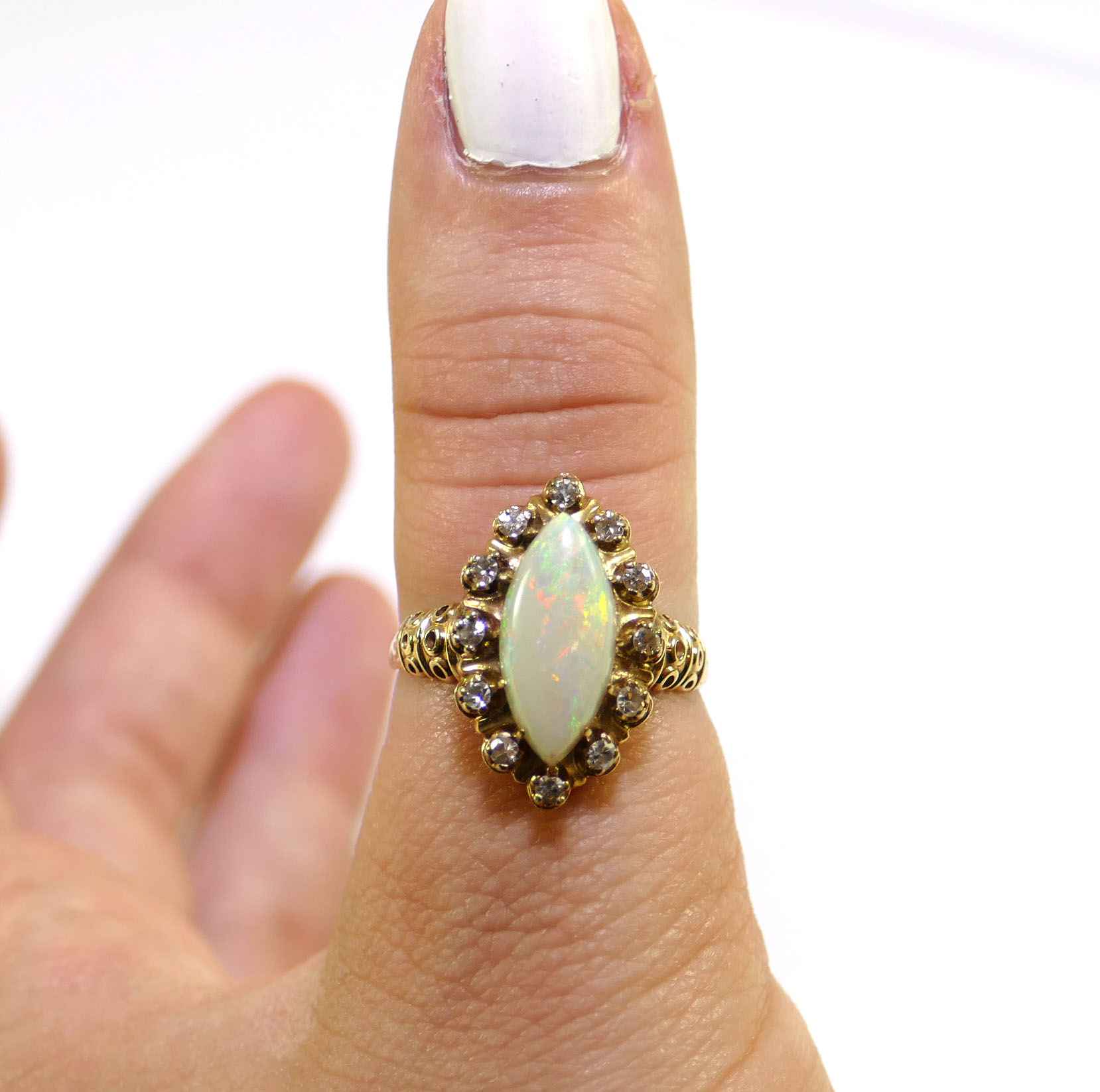Product Description: This ring is a solid 14k yellow gold, and a flashy bright colored opal right as the centerpiece. There's natural diamonds surrounding the whole shape of the opal, that accents it perfectly! <...