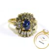 this ring is a solid 14k yellow gold, and a flashy bright colored opal right as the centerpiece. There’s natural diamonds surrounding the whole shape of the opal, that accents it perfectly!