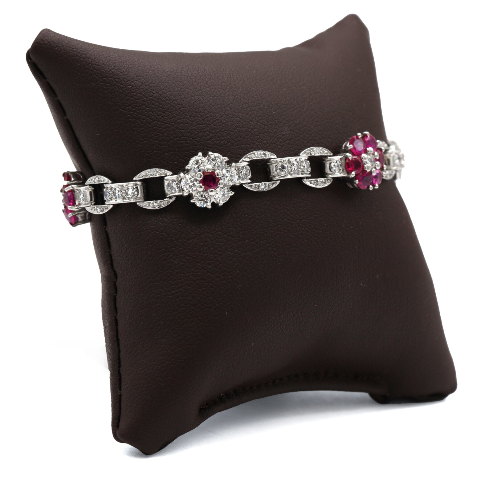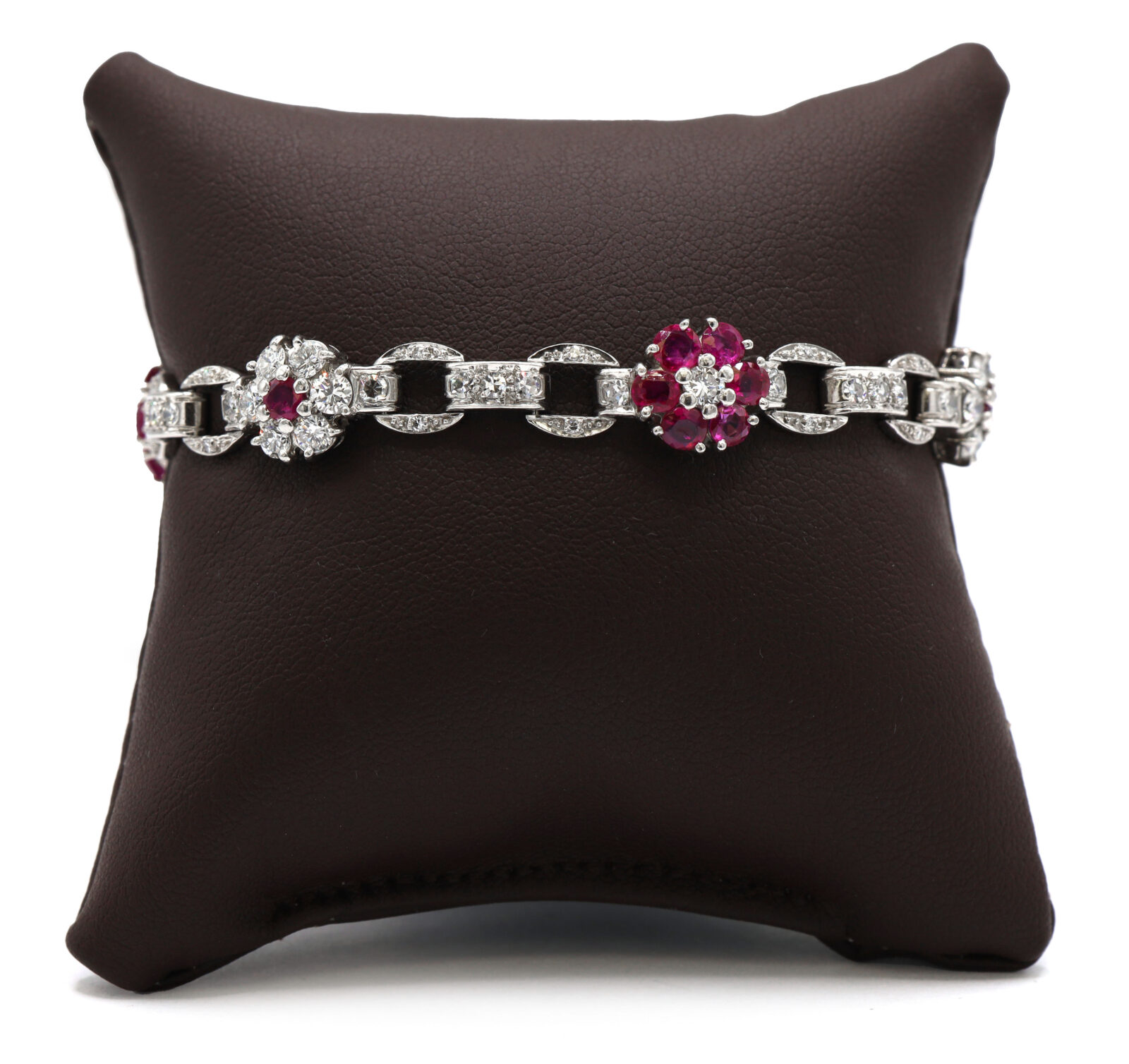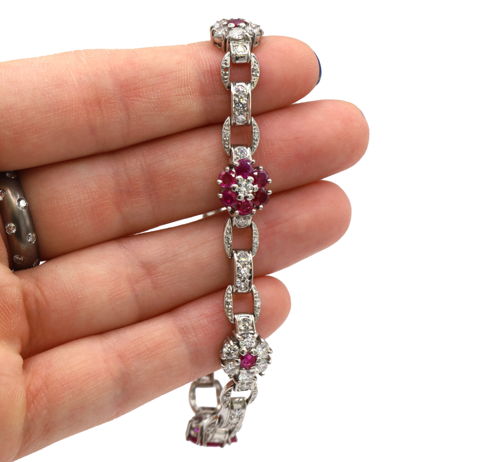 Vintage Natural Diamond Ruby Flower Cluster Platinum Women’s Statement Bracelet