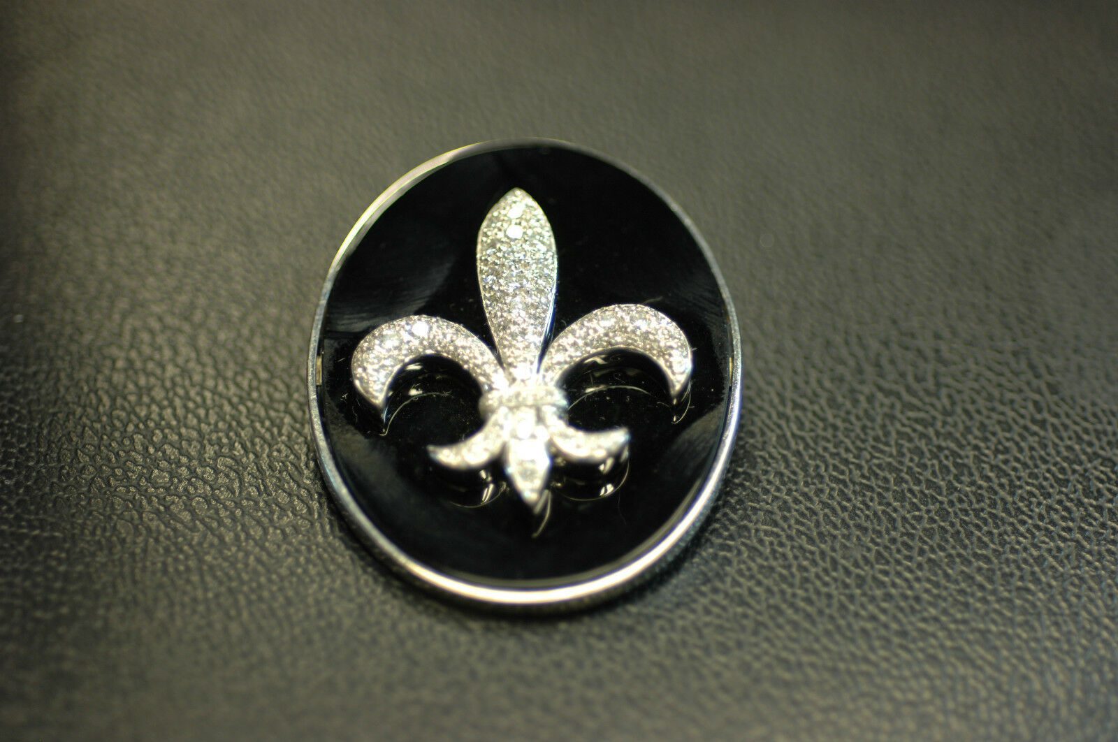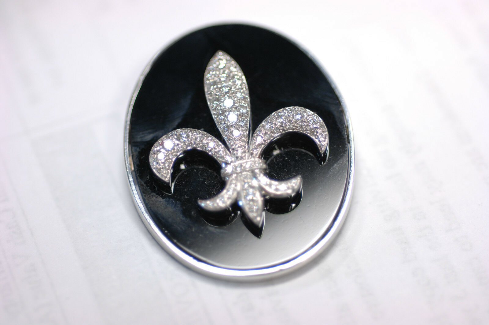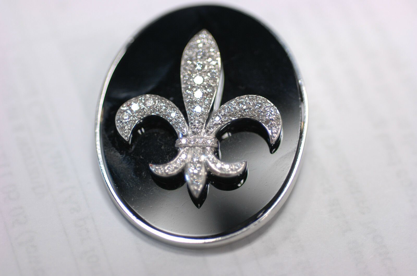 vintage 14k white gold 1.50ct diamond fleur de lis pin / pendant on onyx