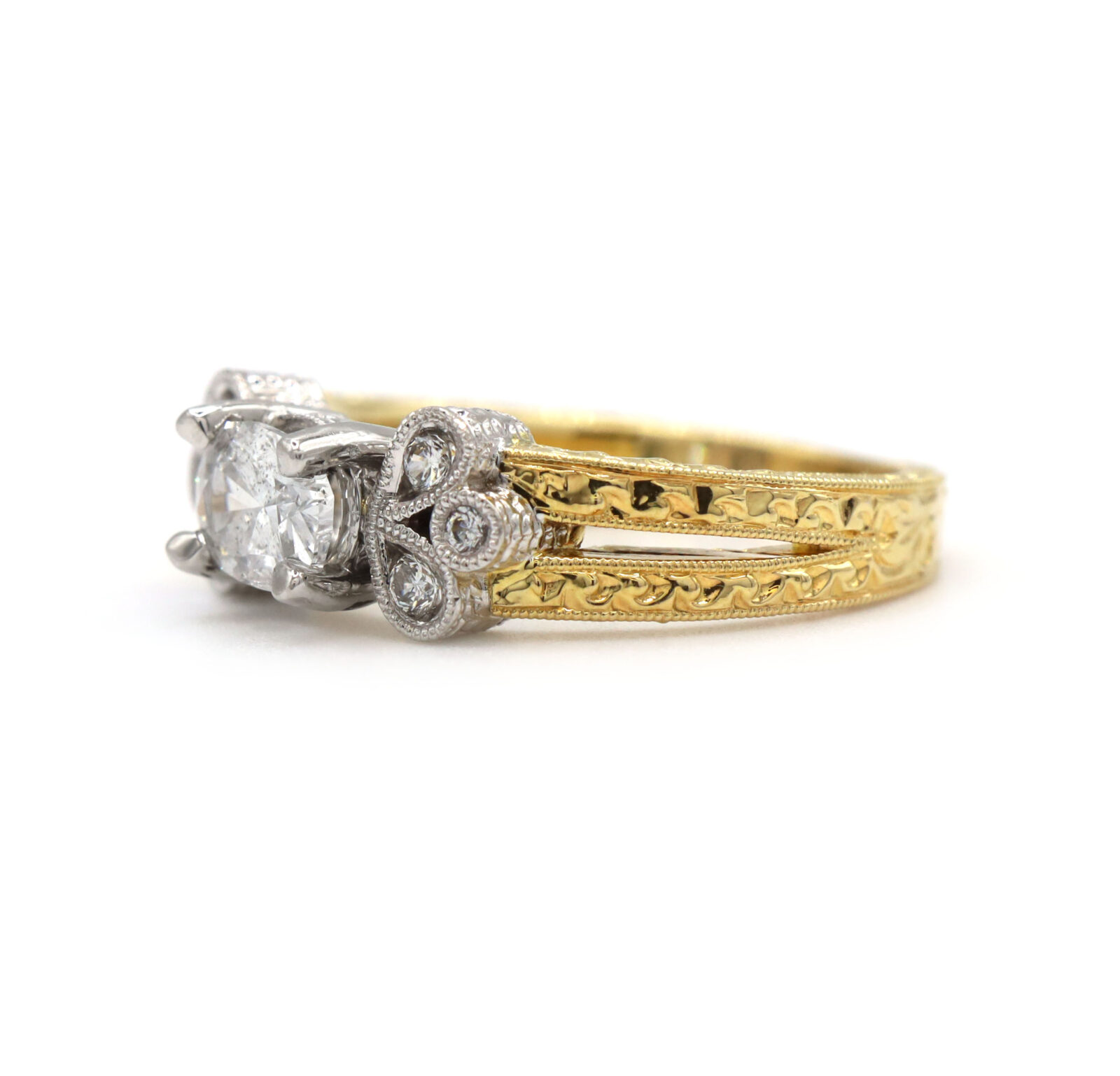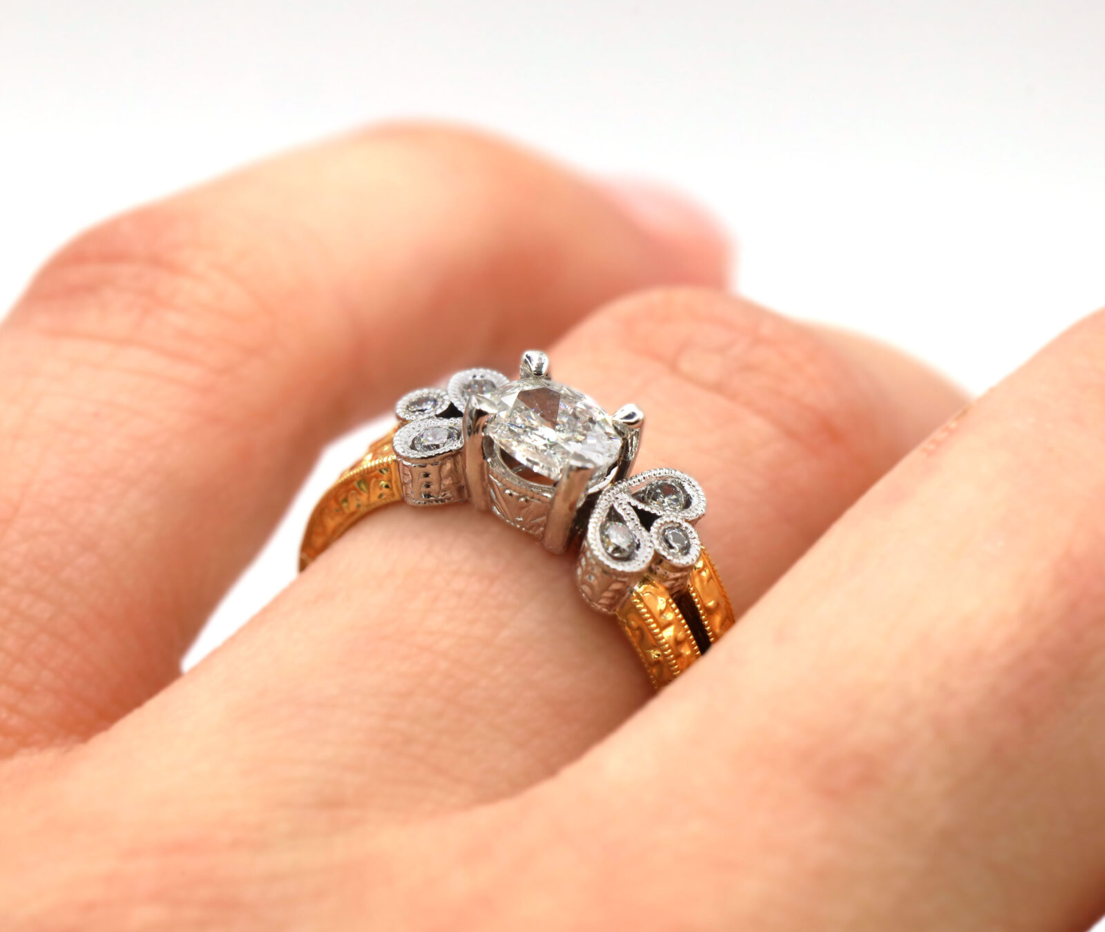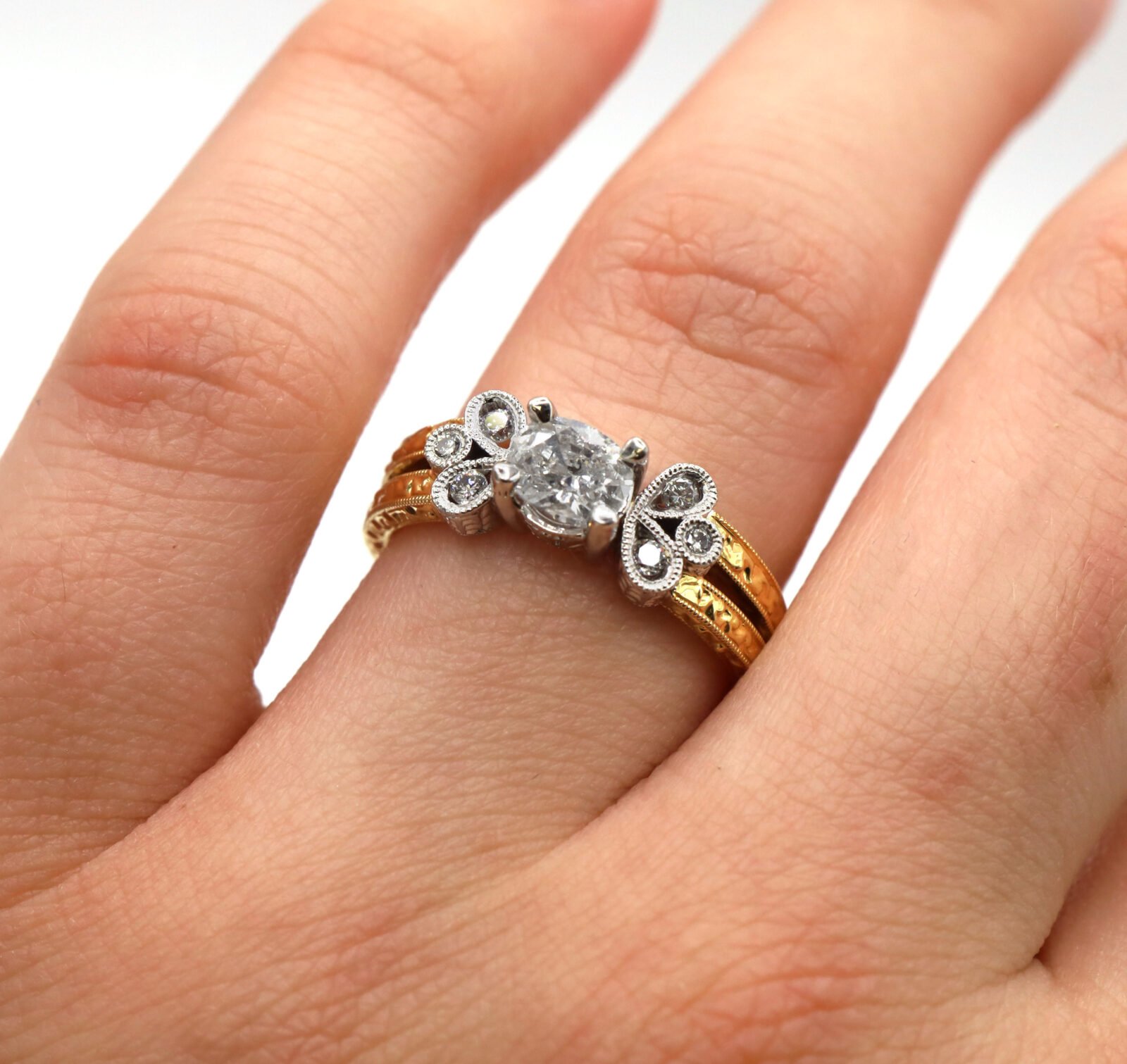 Vintage Oval Diamond Engraved 18K Two-Tone White Yellow Gold Engagement Ring