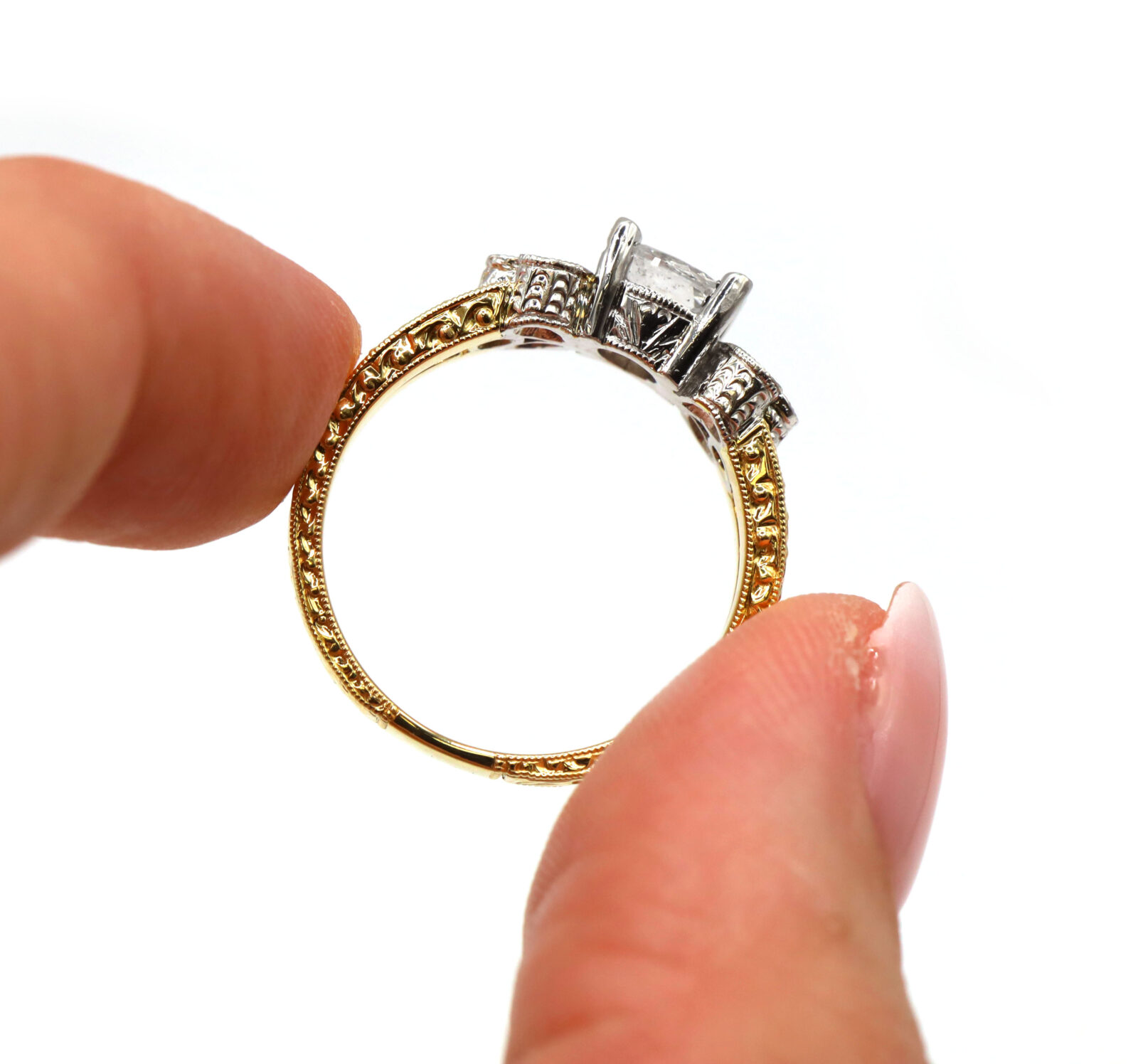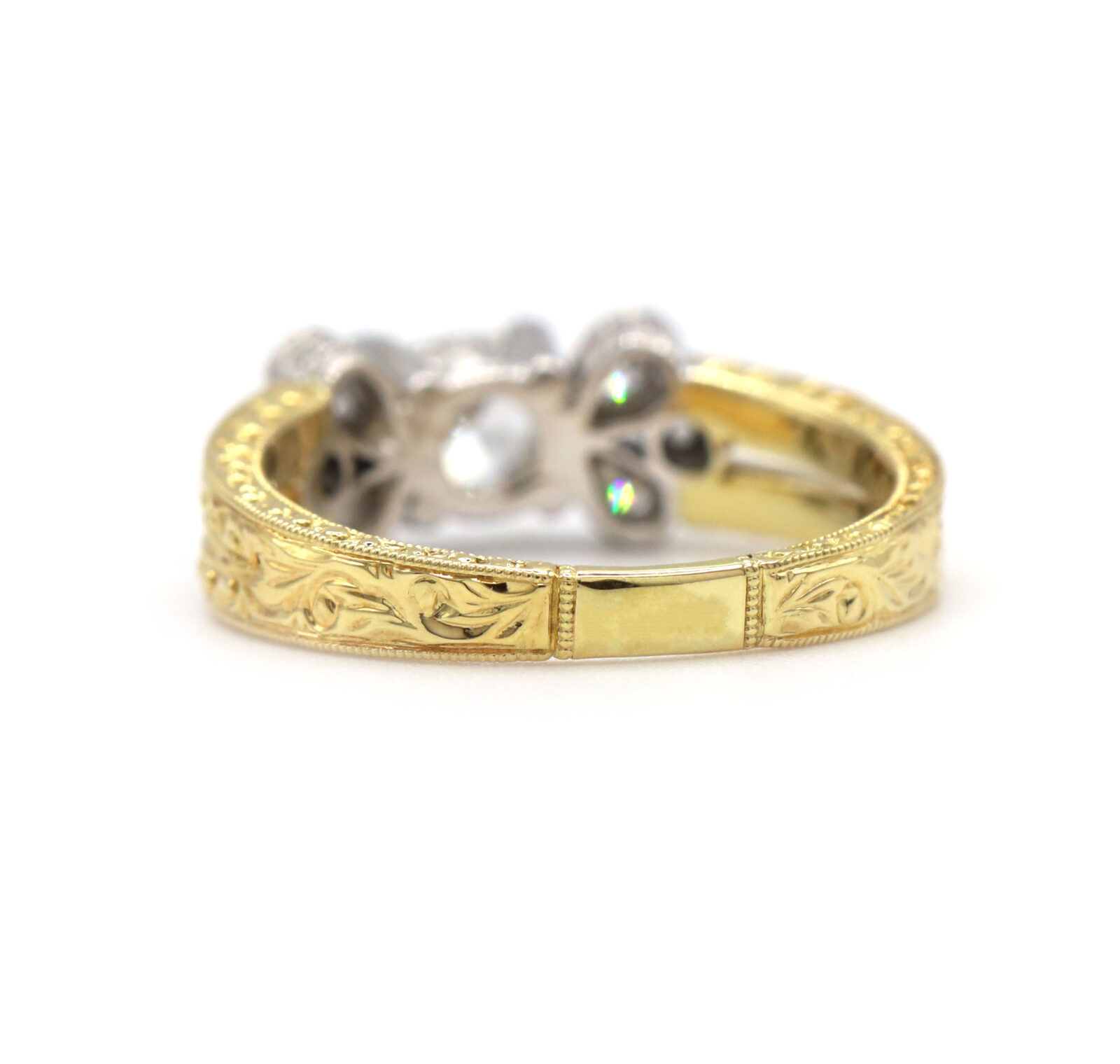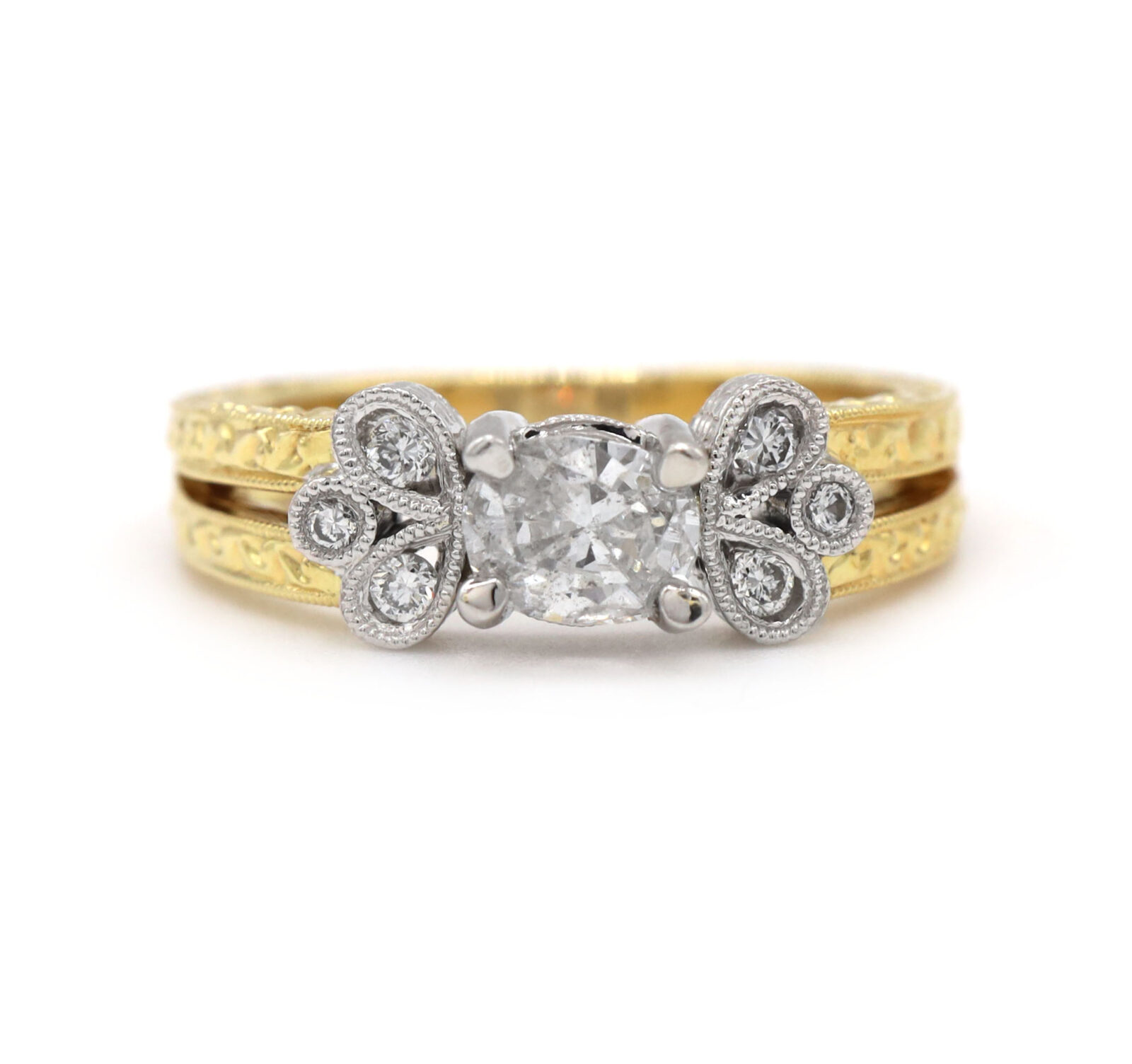 Vintage Oval Diamond Engraved 18K Two-Tone White Yellow Gold Engagement Ring