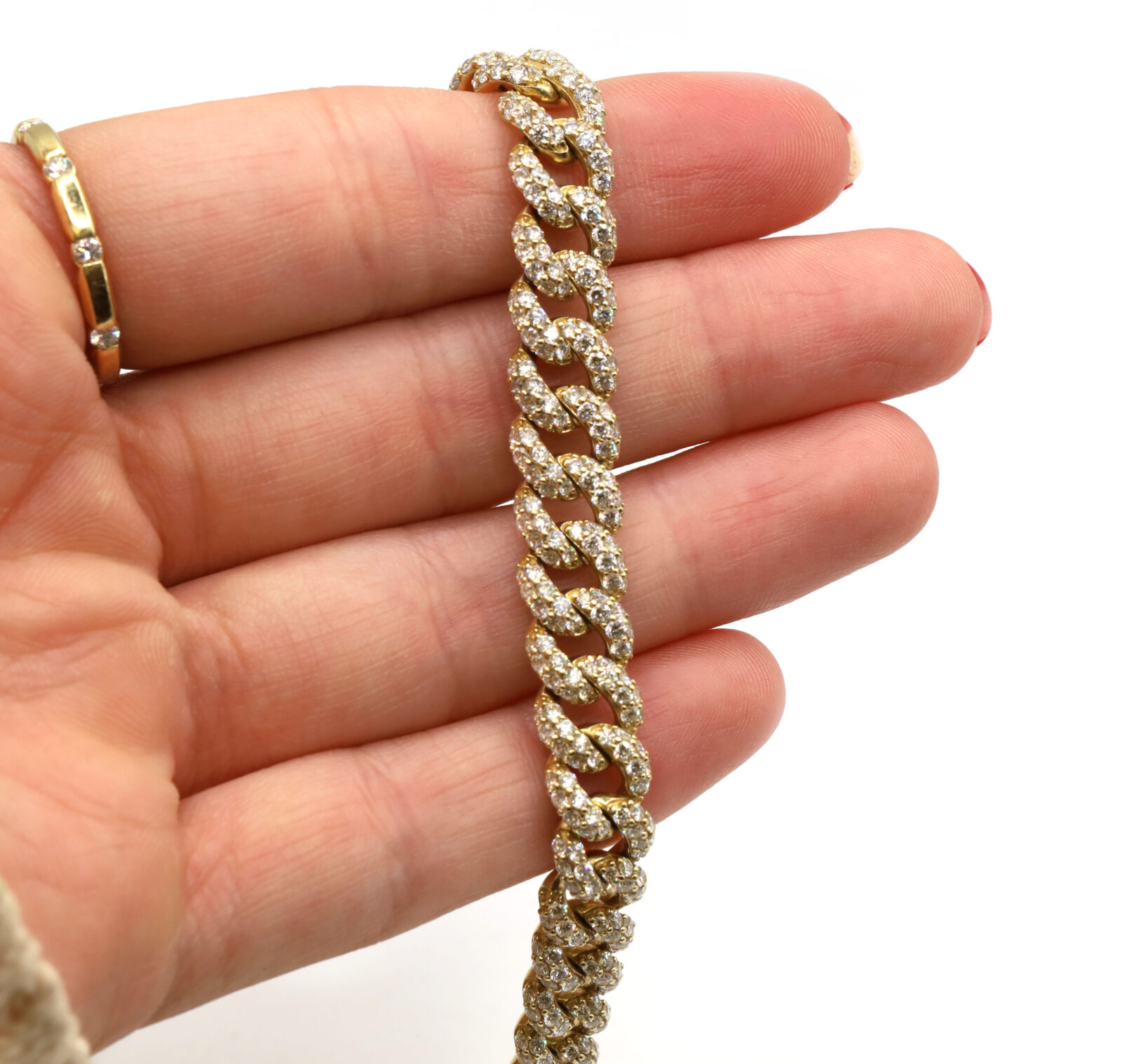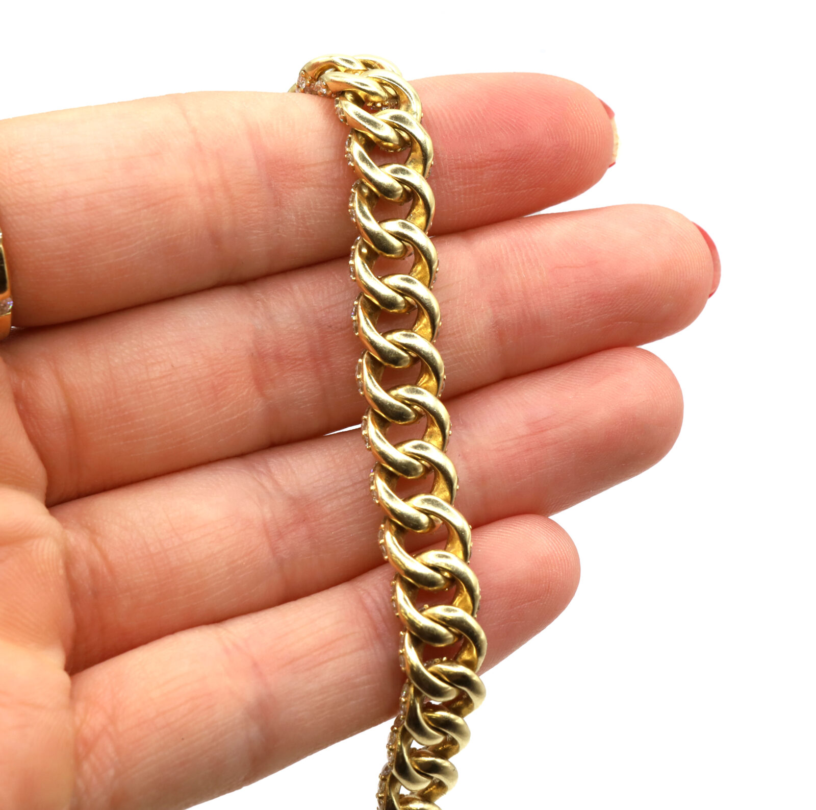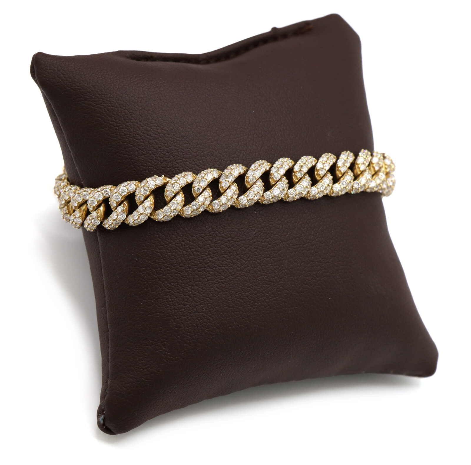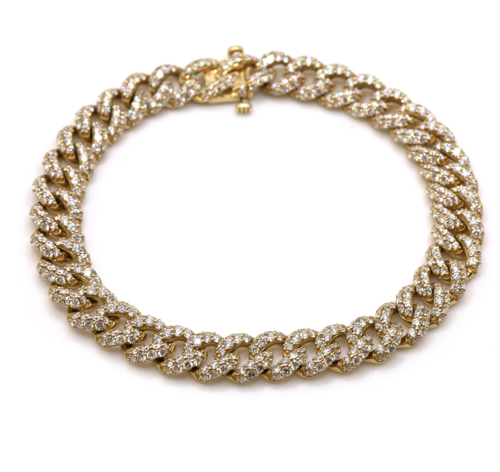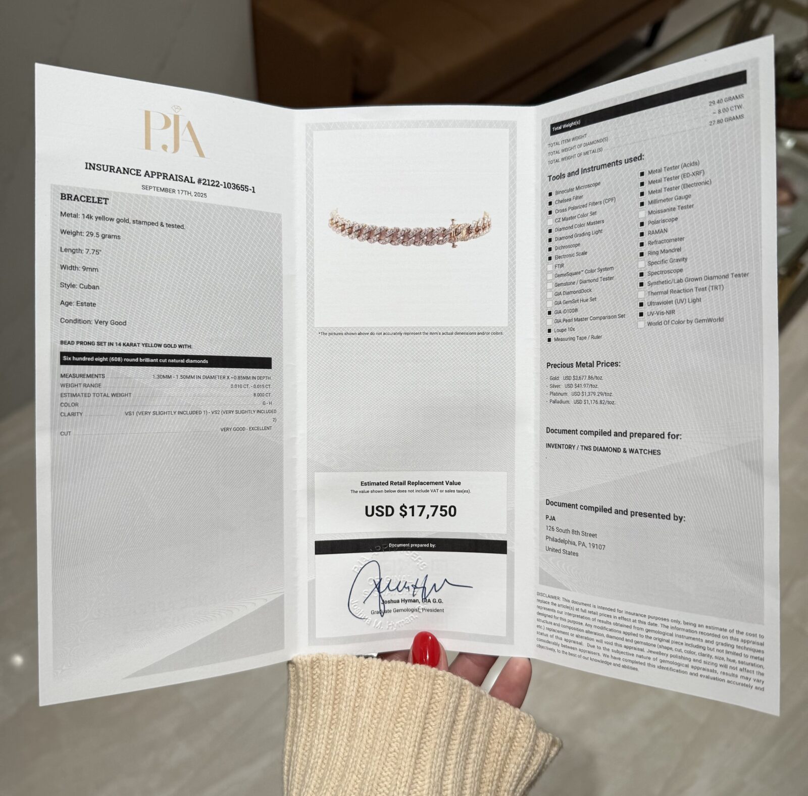 This bracelet is third-party appraised. Material: 14k Yellow Gold Gemstone: Diamond Carat Weight: Approximately 8.00 Carat Cut: Round Brilliant Color: G/H Clarity: VS1/VS2 Length: 7.75 Inches Setting: Prong Width: 9mm Weight: 29.5 Grams
