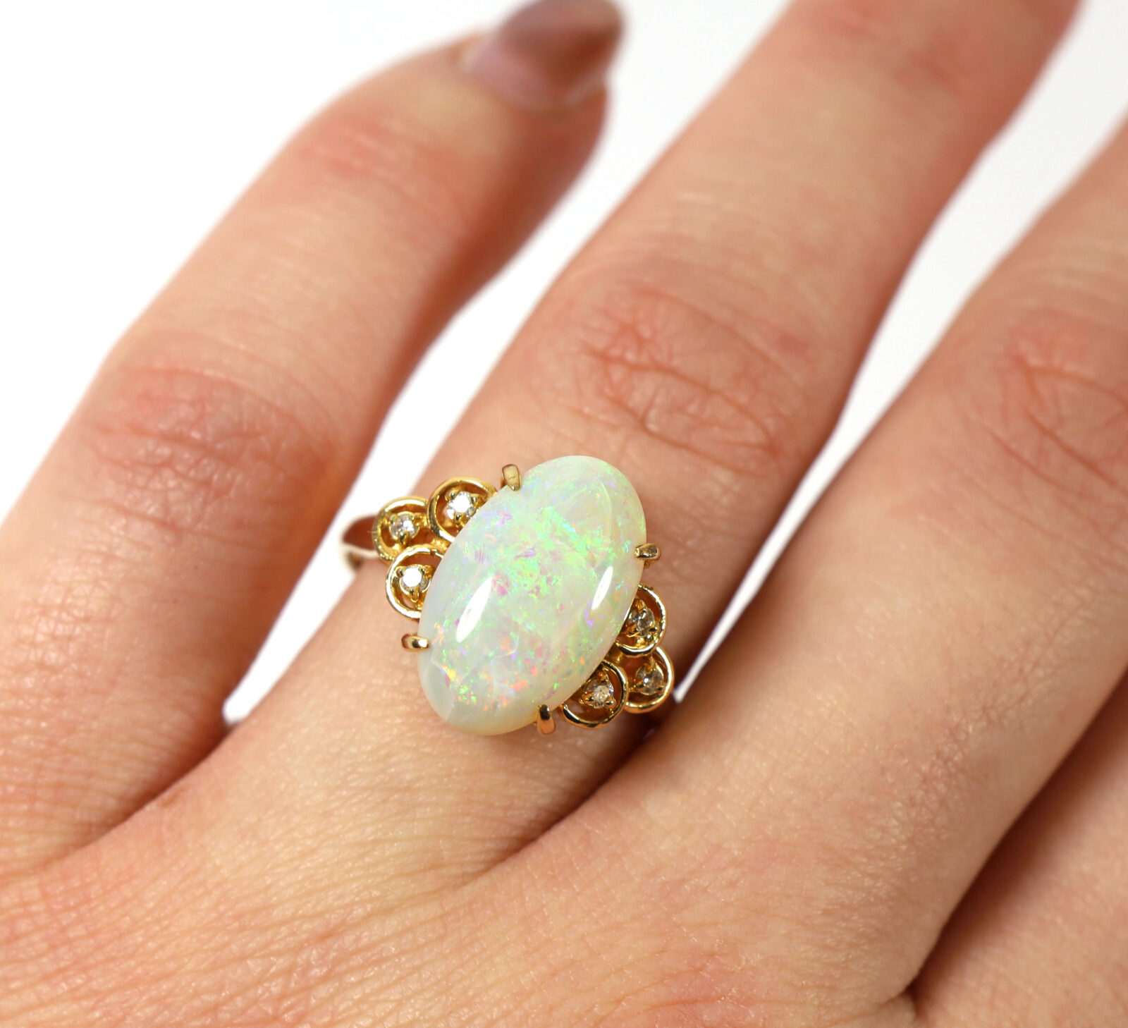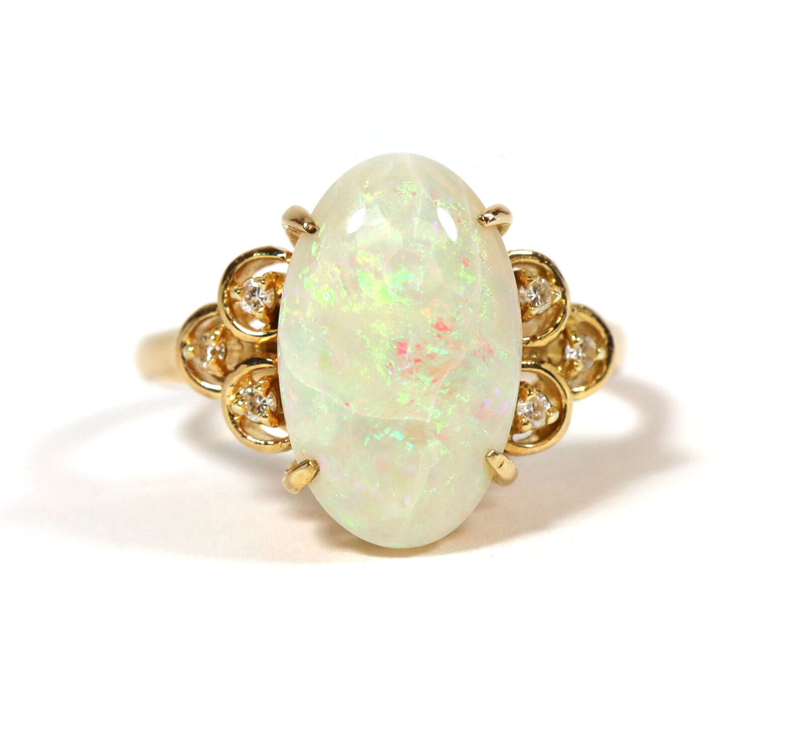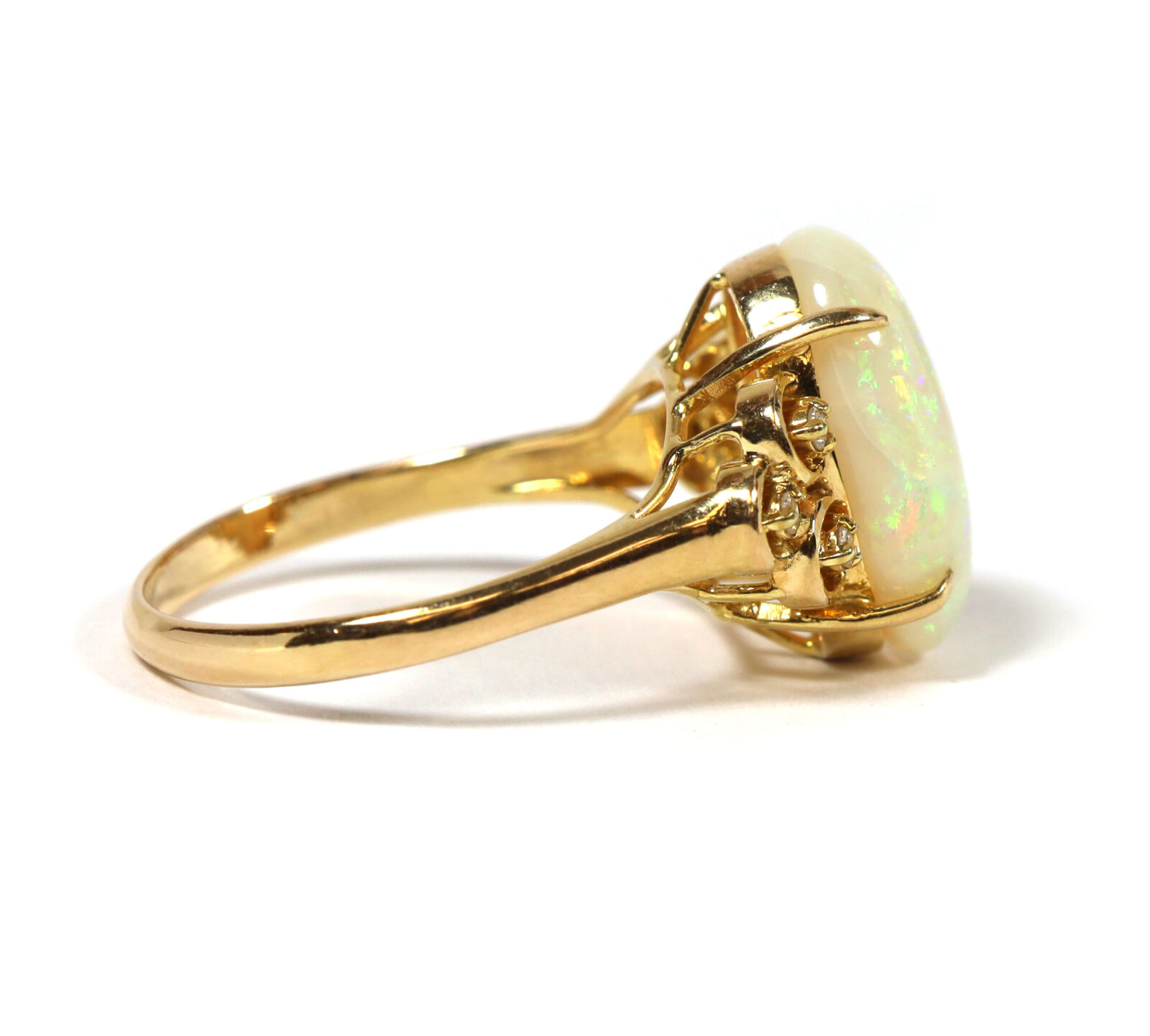 White Oval Opal And Diamond 14K Yellow Gold Statement Ring