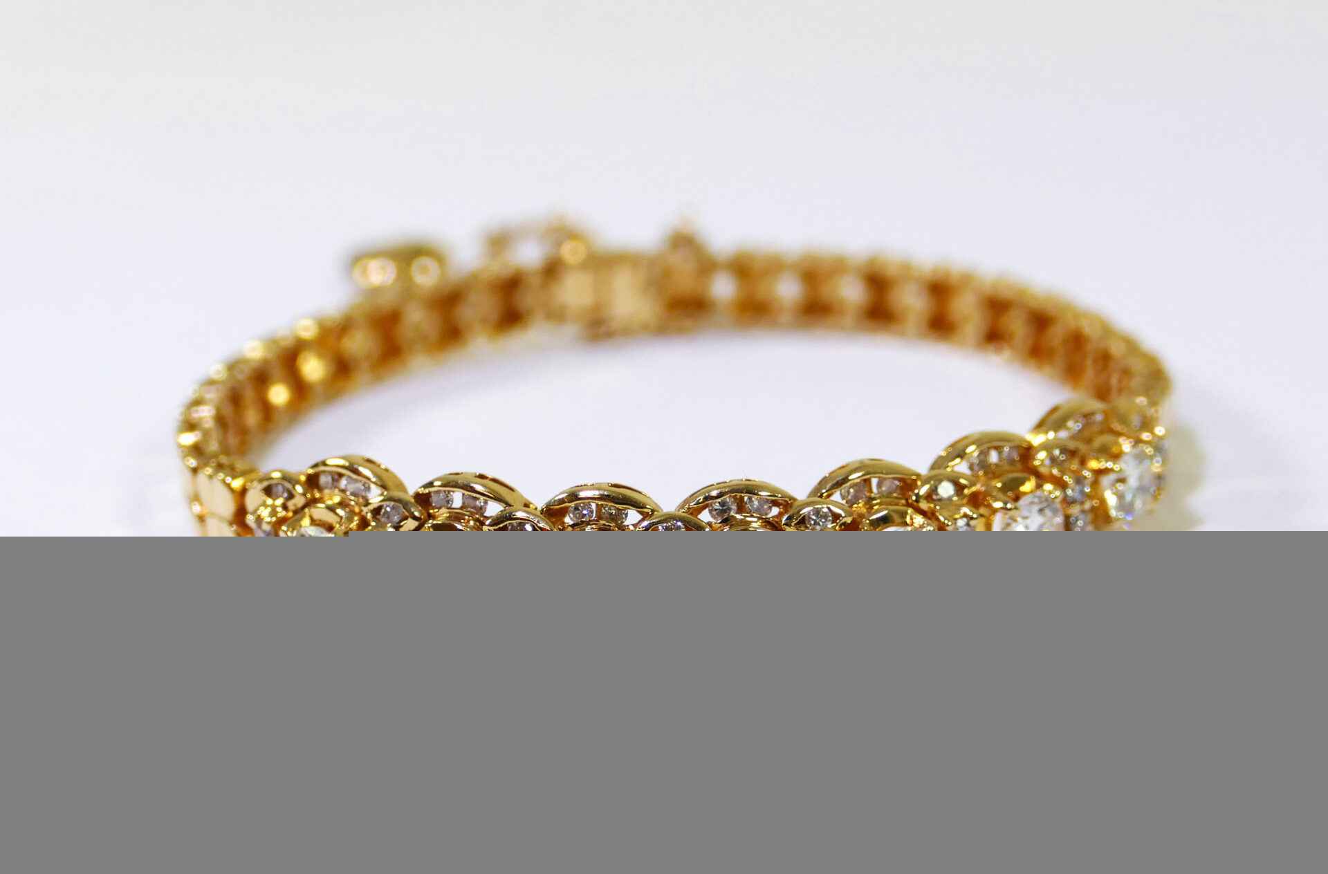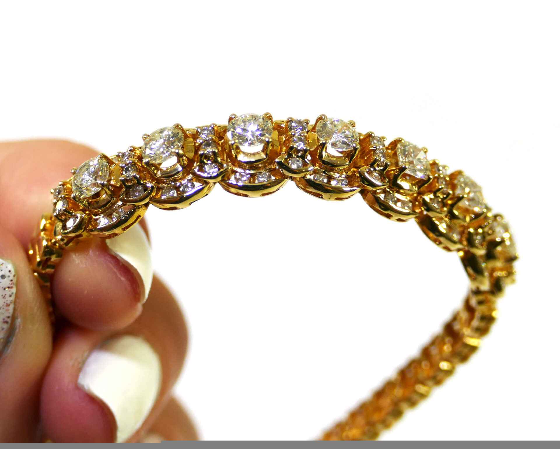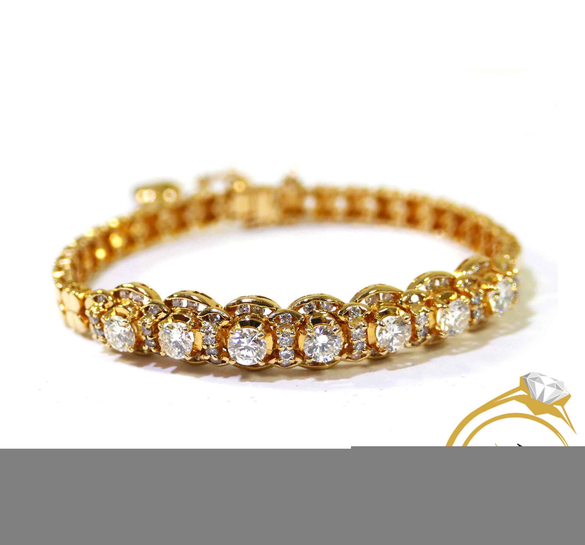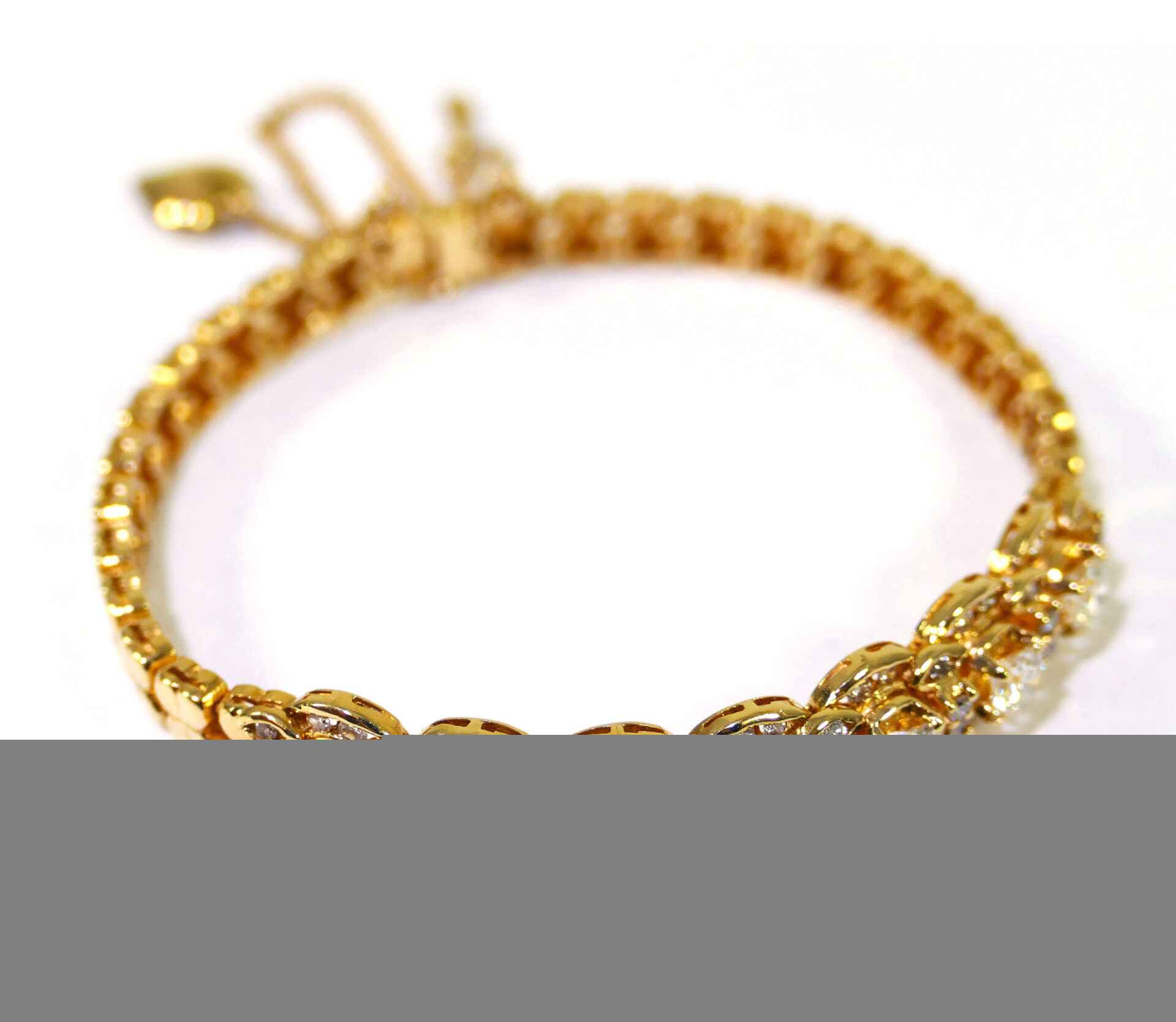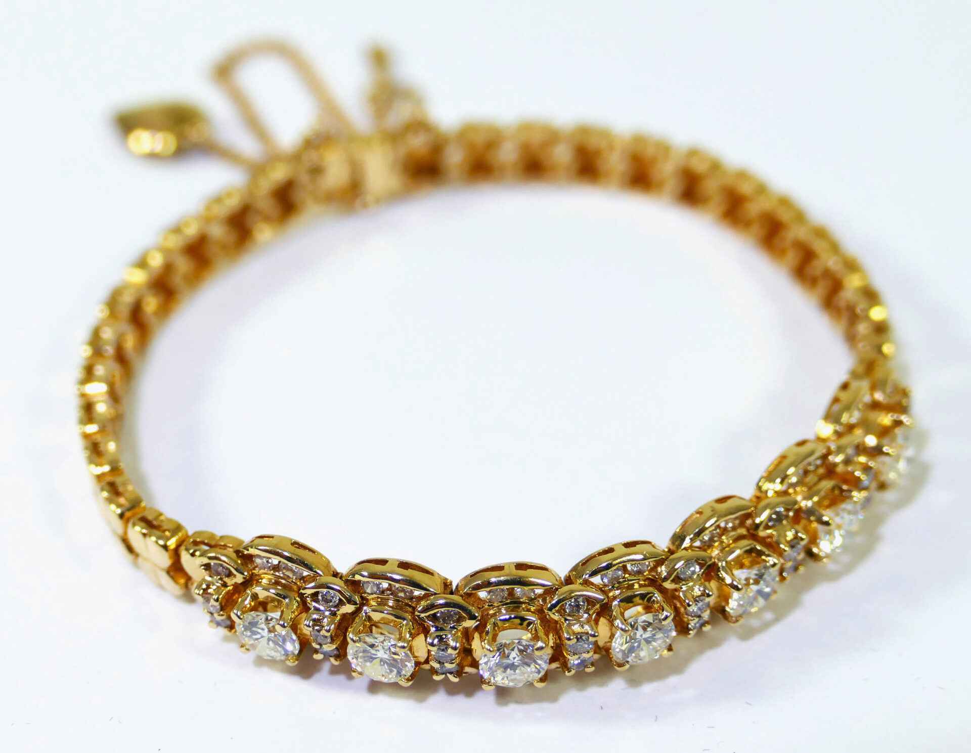 this bracelet is crafted in beautiful 18k gold and lays 2.5 carats of diamonds. There are lock & key charms on the back of the bracelet where the two ends meet.