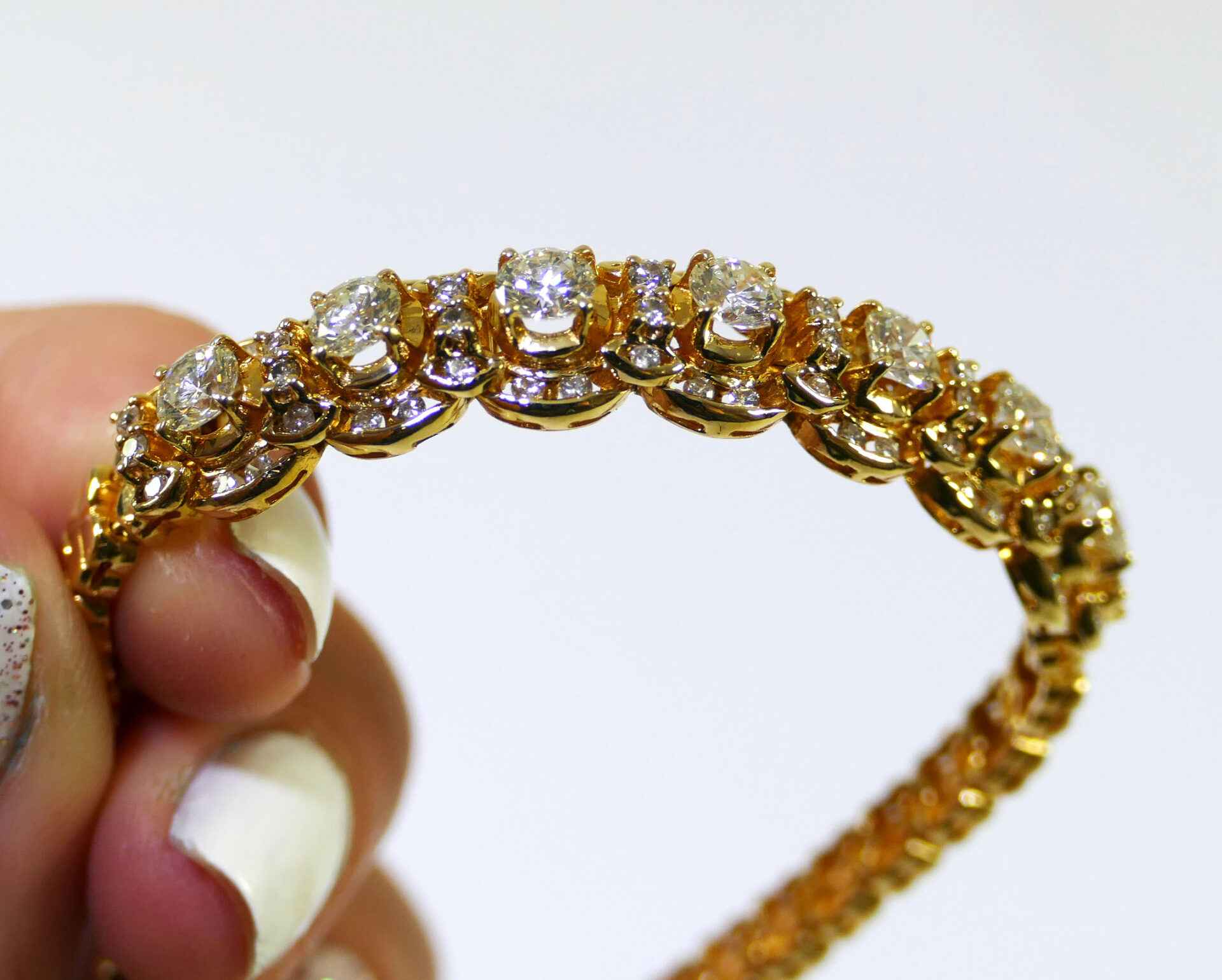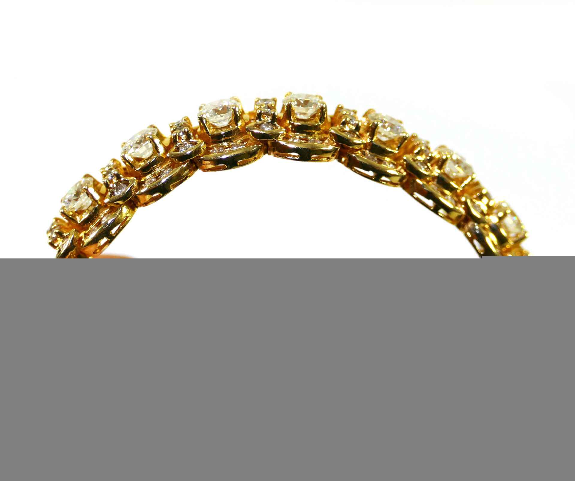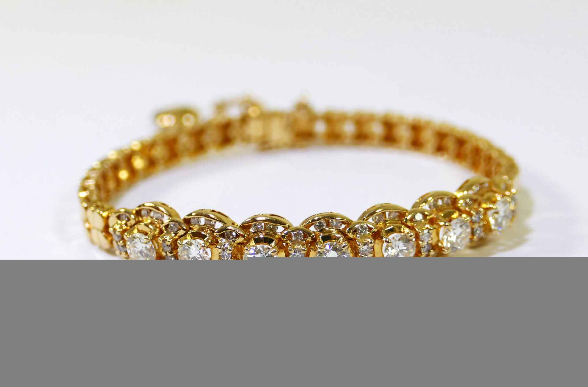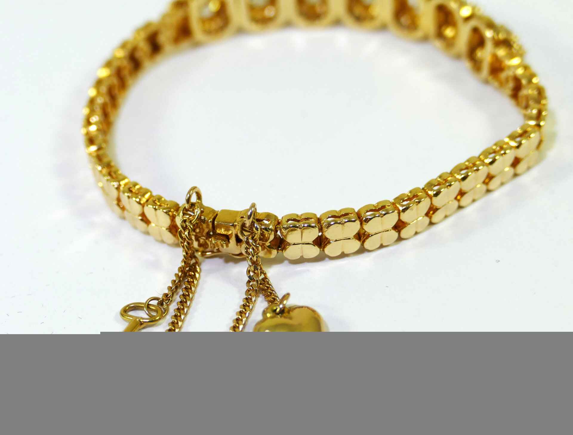 this bracelet is crafted in beautiful 18k gold and lays 2.5 carats of diamonds. There are lock & key charms on the back of the bracelet where the two ends meet.