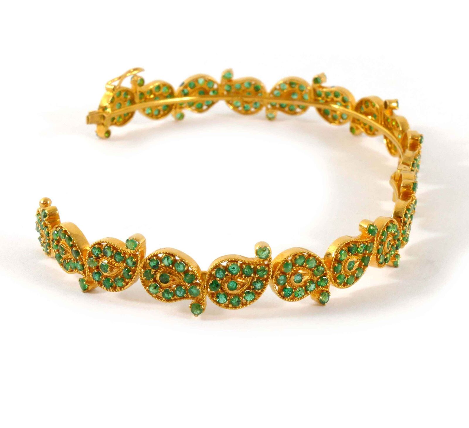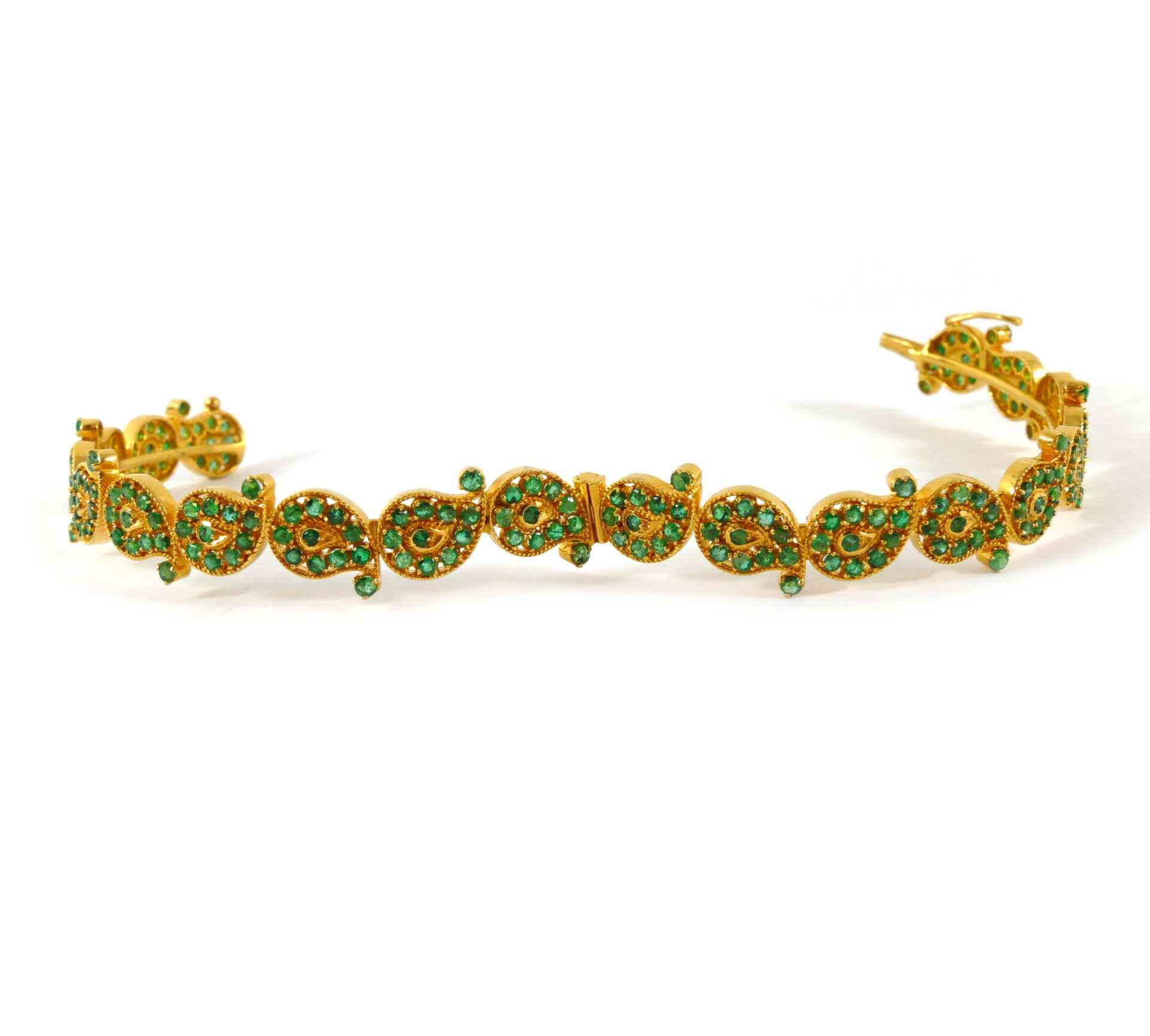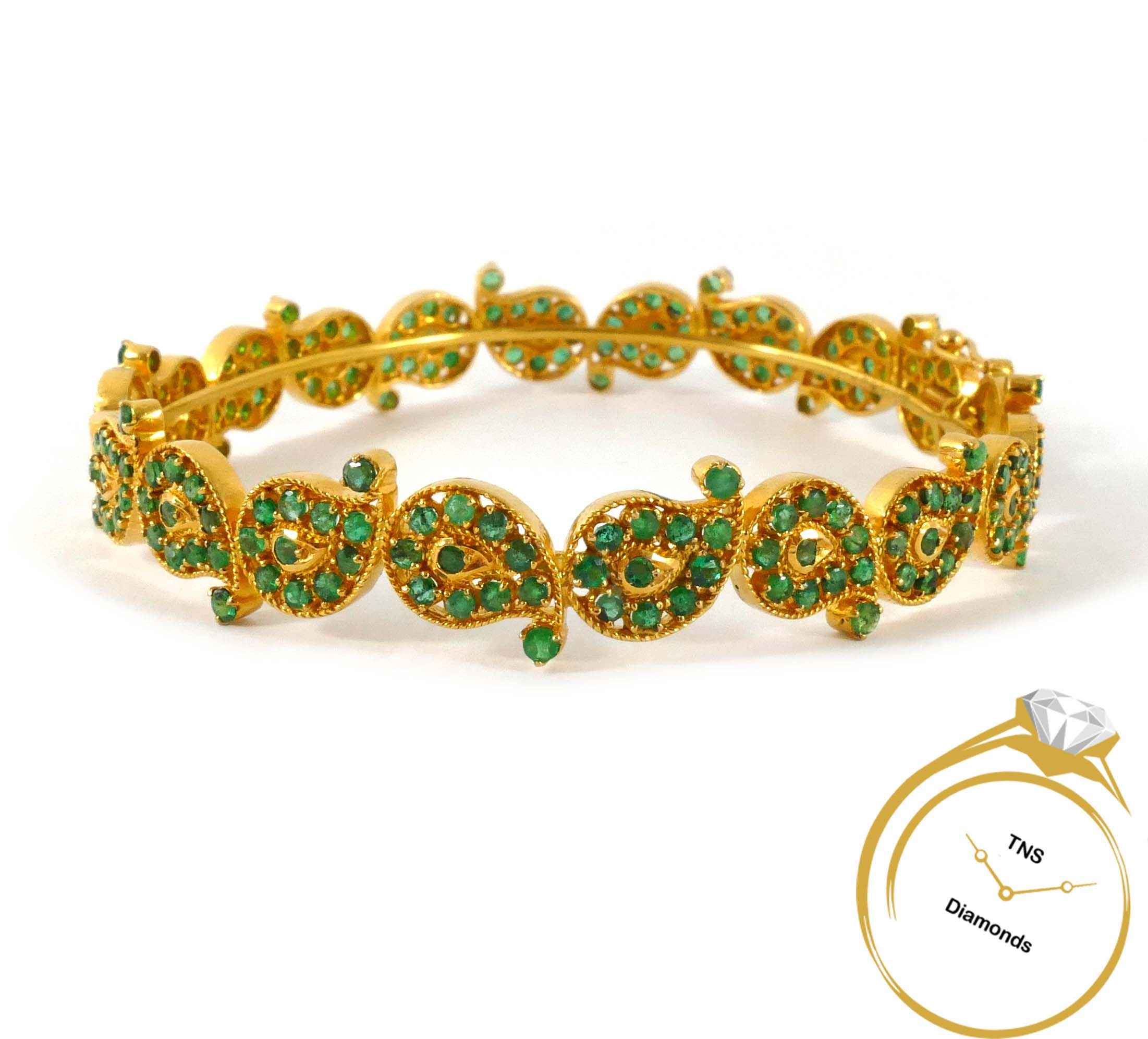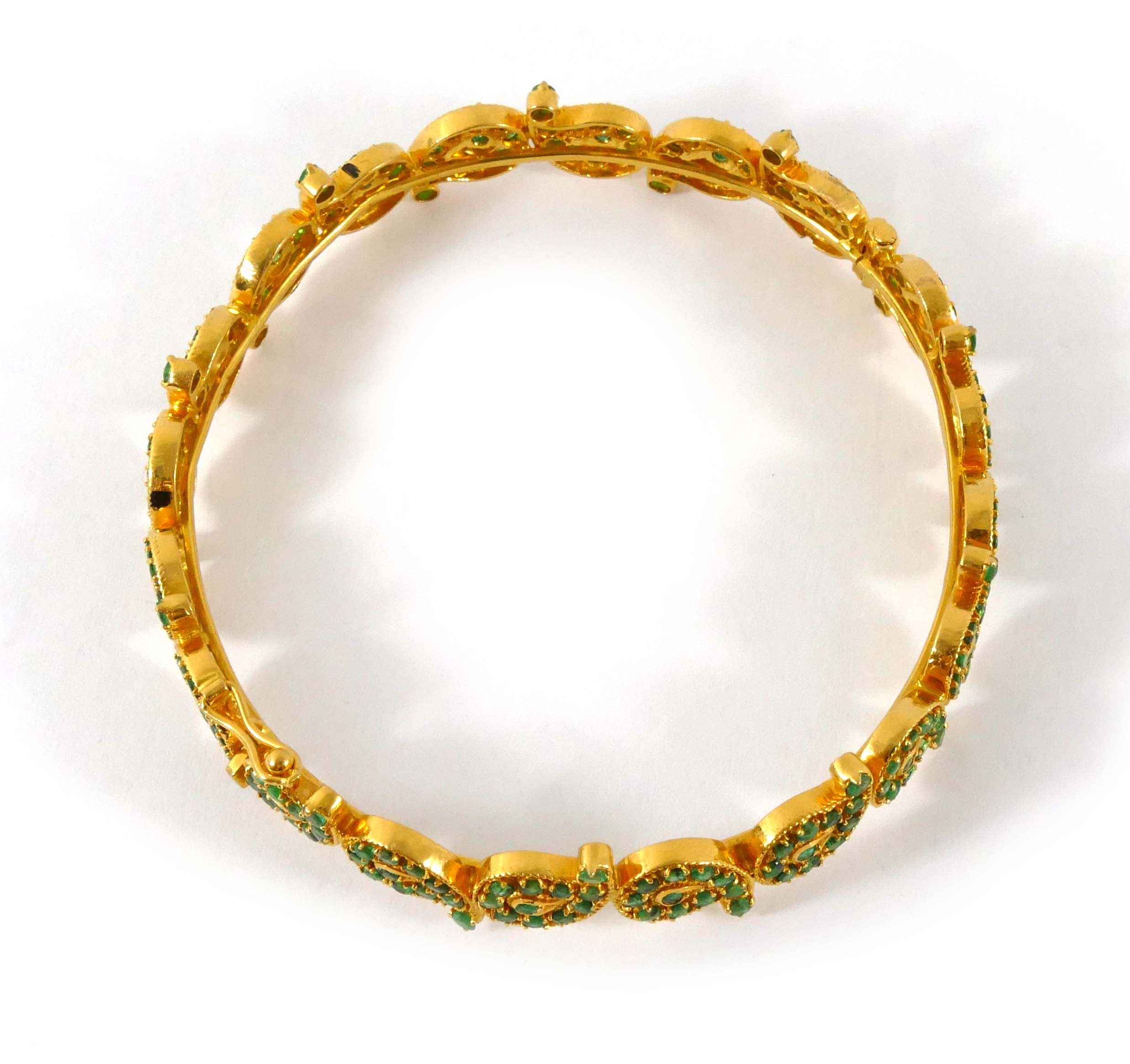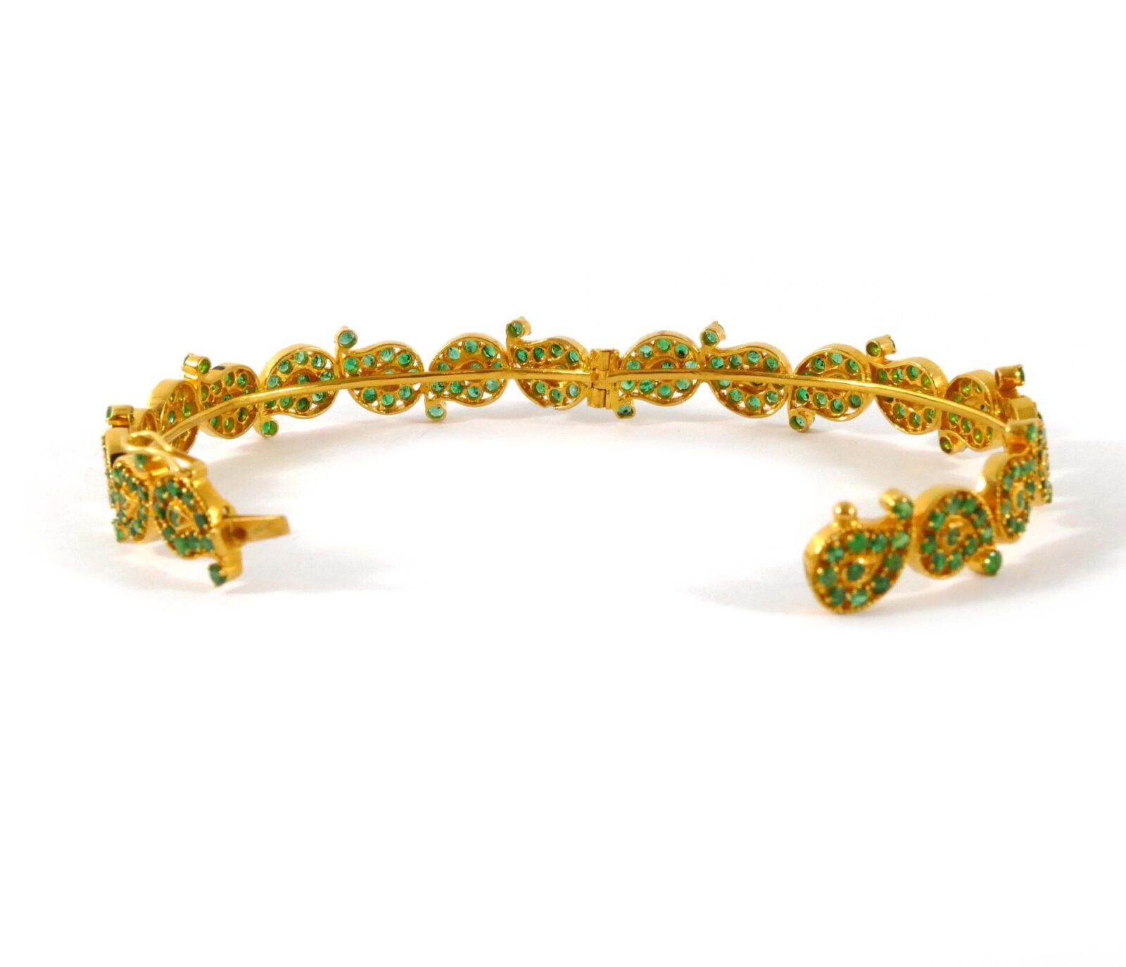 this bangle bracelet is crafted in a hefty 22k yellow gold, and encrusted with bright green emeralds surrounding the entire piece. The bangle is designed in a complete paisley look, giving it elegancy and uniqueness.