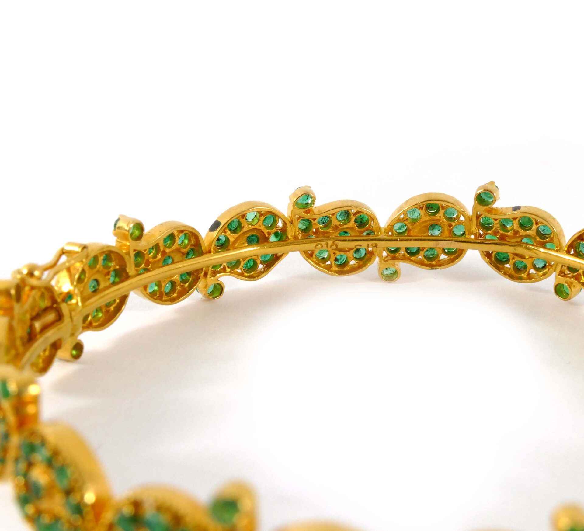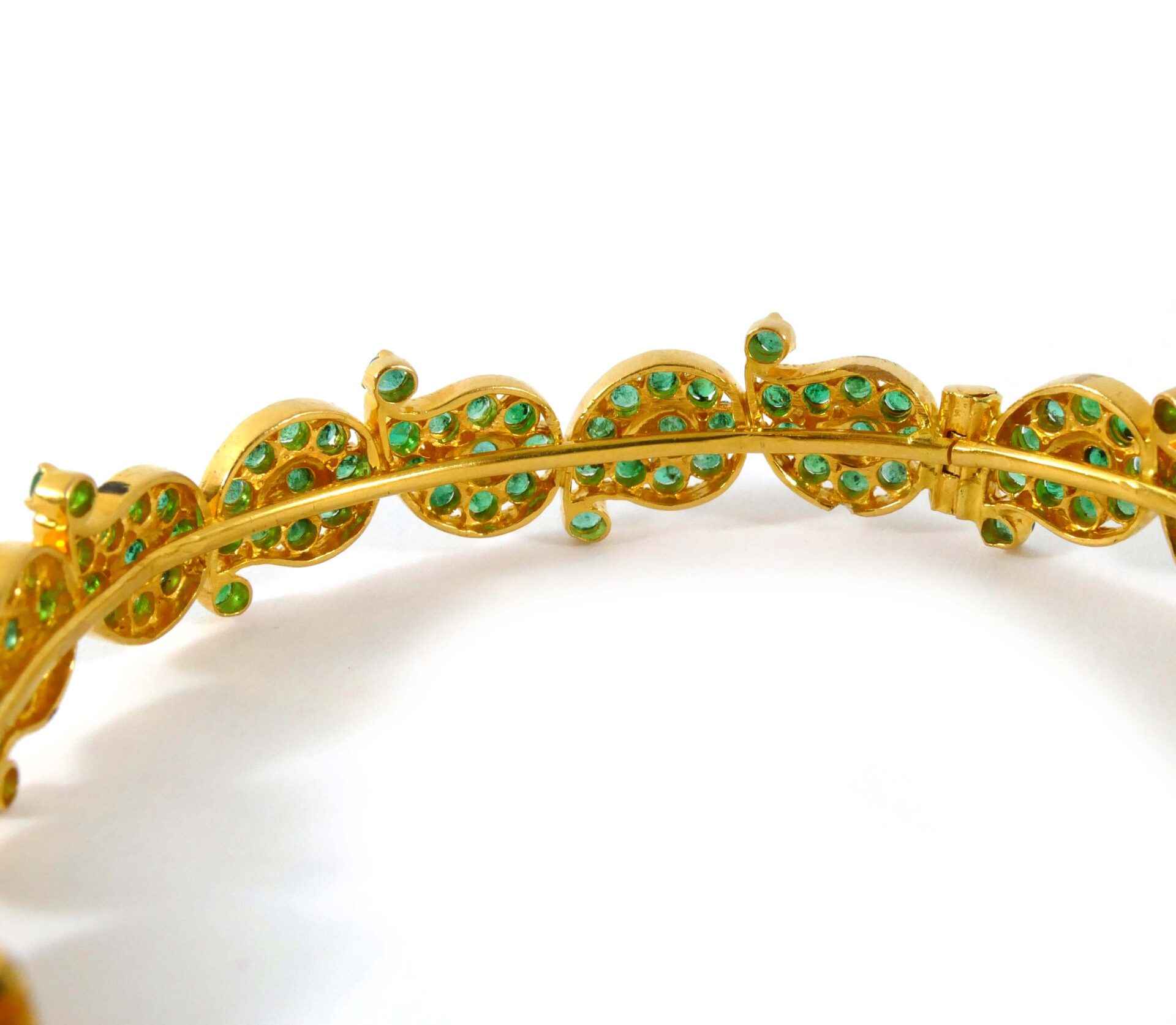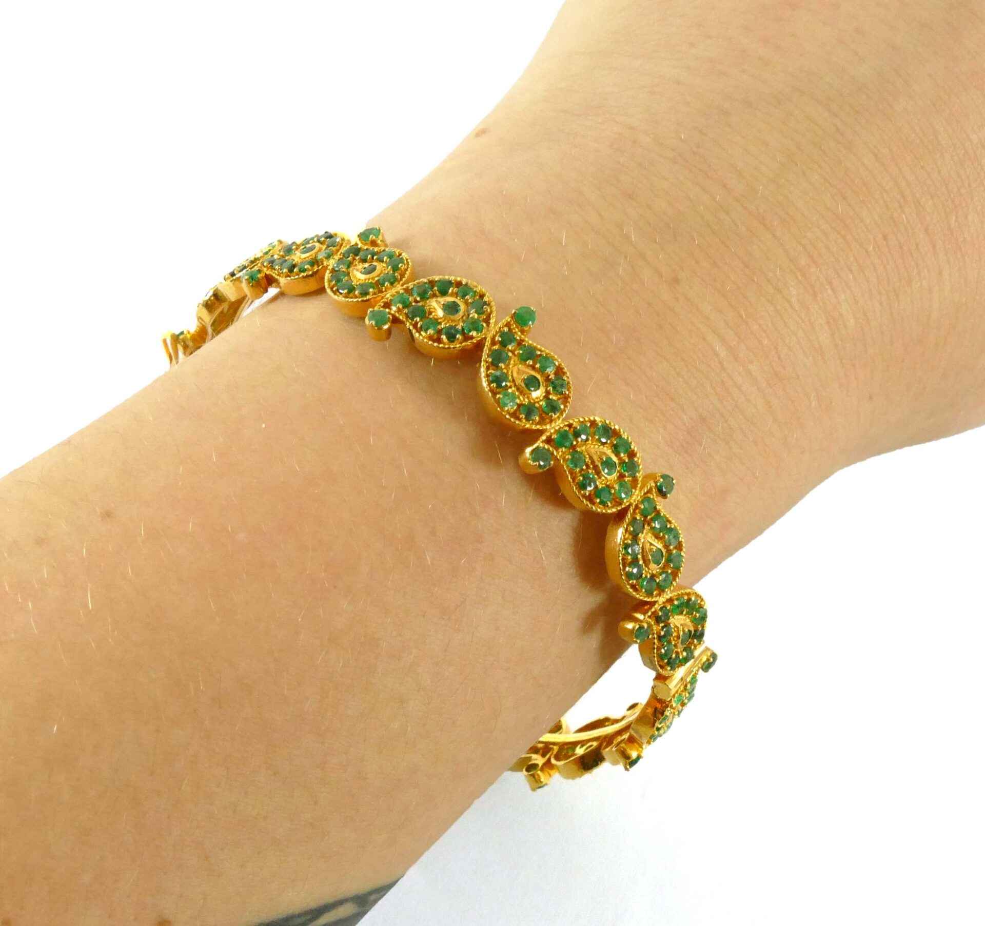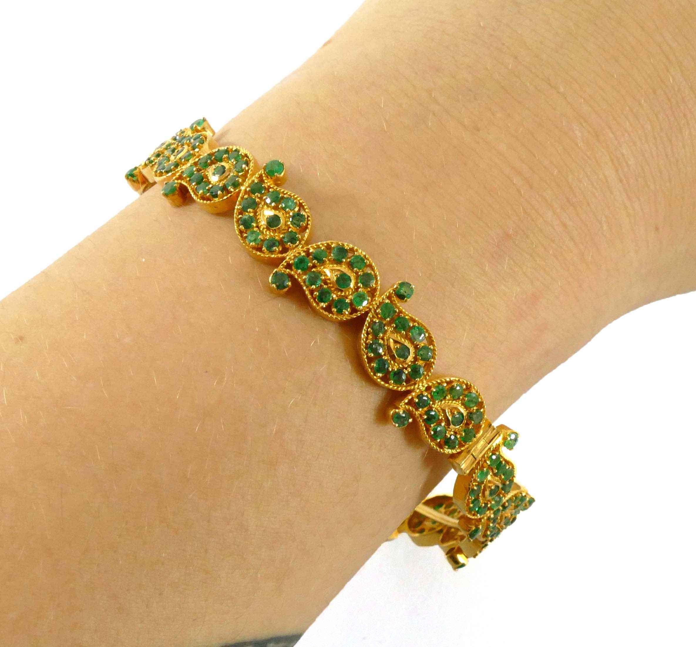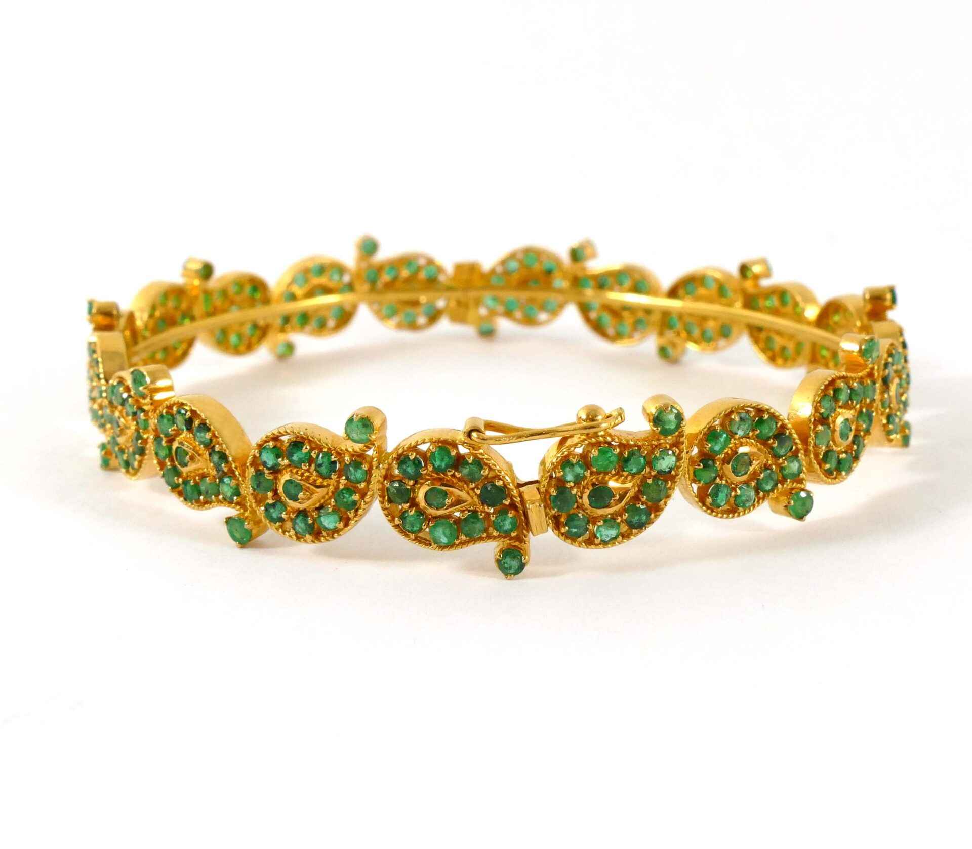 this bangle bracelet is crafted in a hefty 22k yellow gold, and encrusted with bright green emeralds surrounding the entire piece. The bangle is designed in a complete paisley look, giving it elegancy and uniqueness.