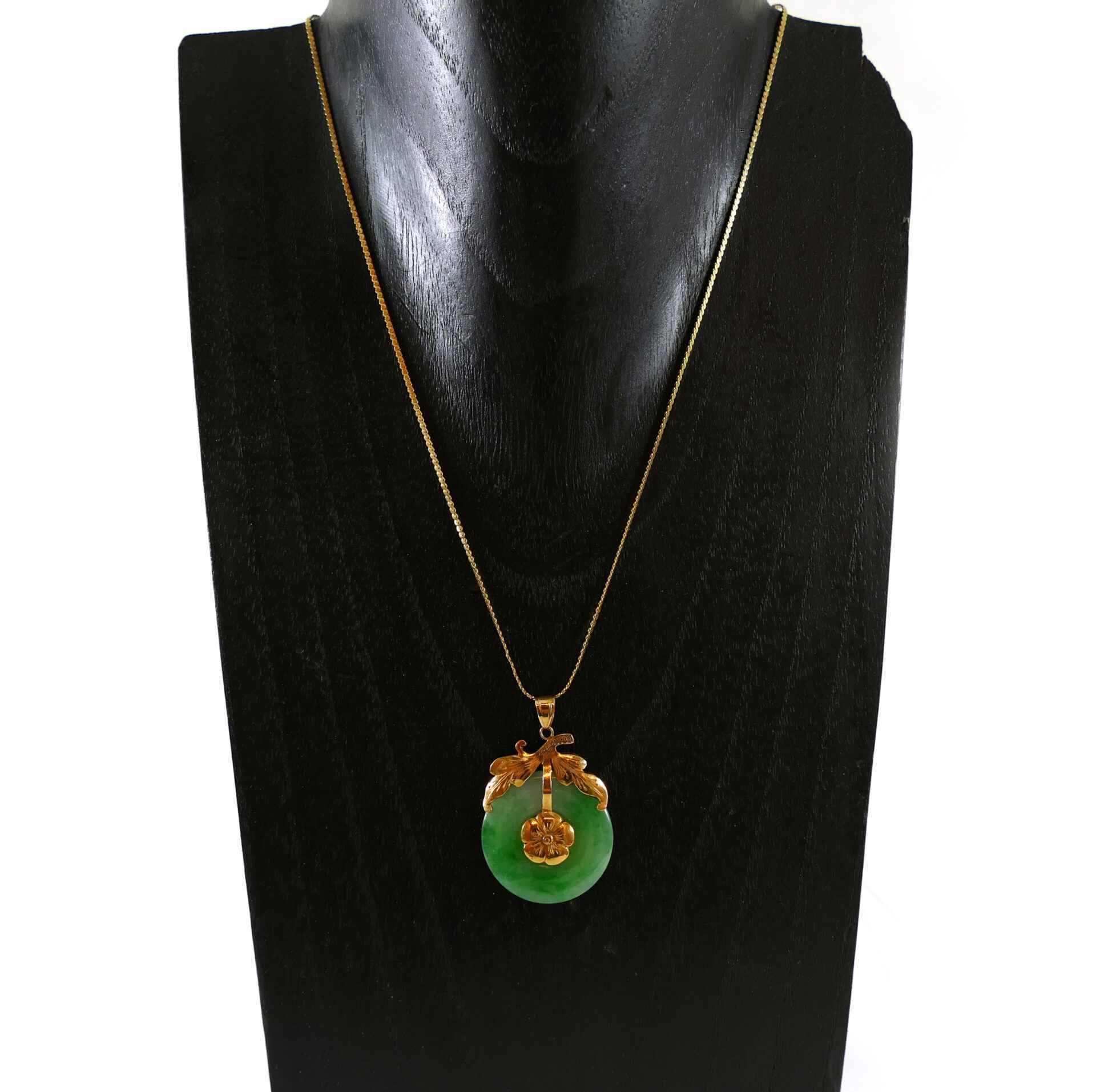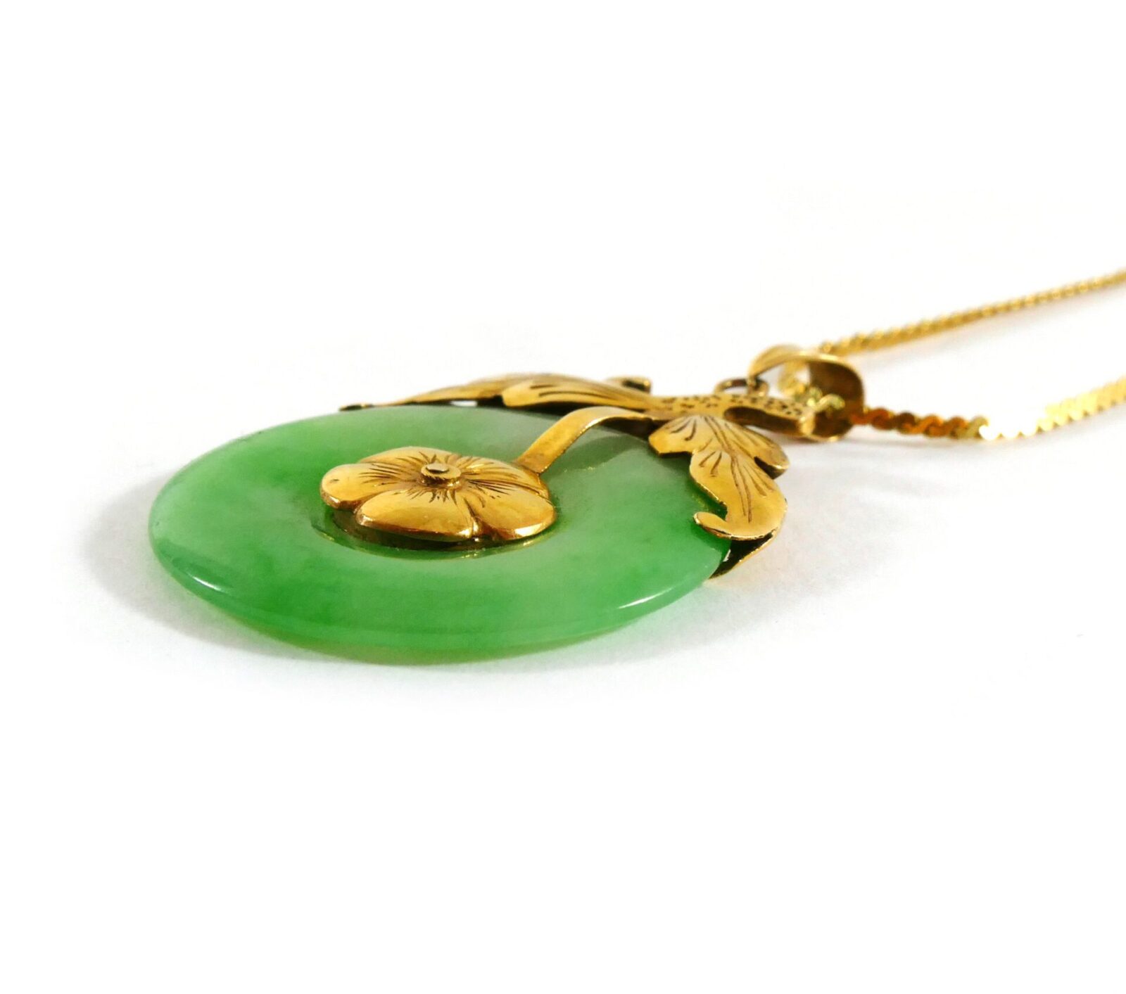 this beautiful necklace features a bright green jade gemstone, set into 14k yellow gold. The gold on the pendant is detailed to have a floral and leaf shape, giving a unique theme to the piece of jewelry.