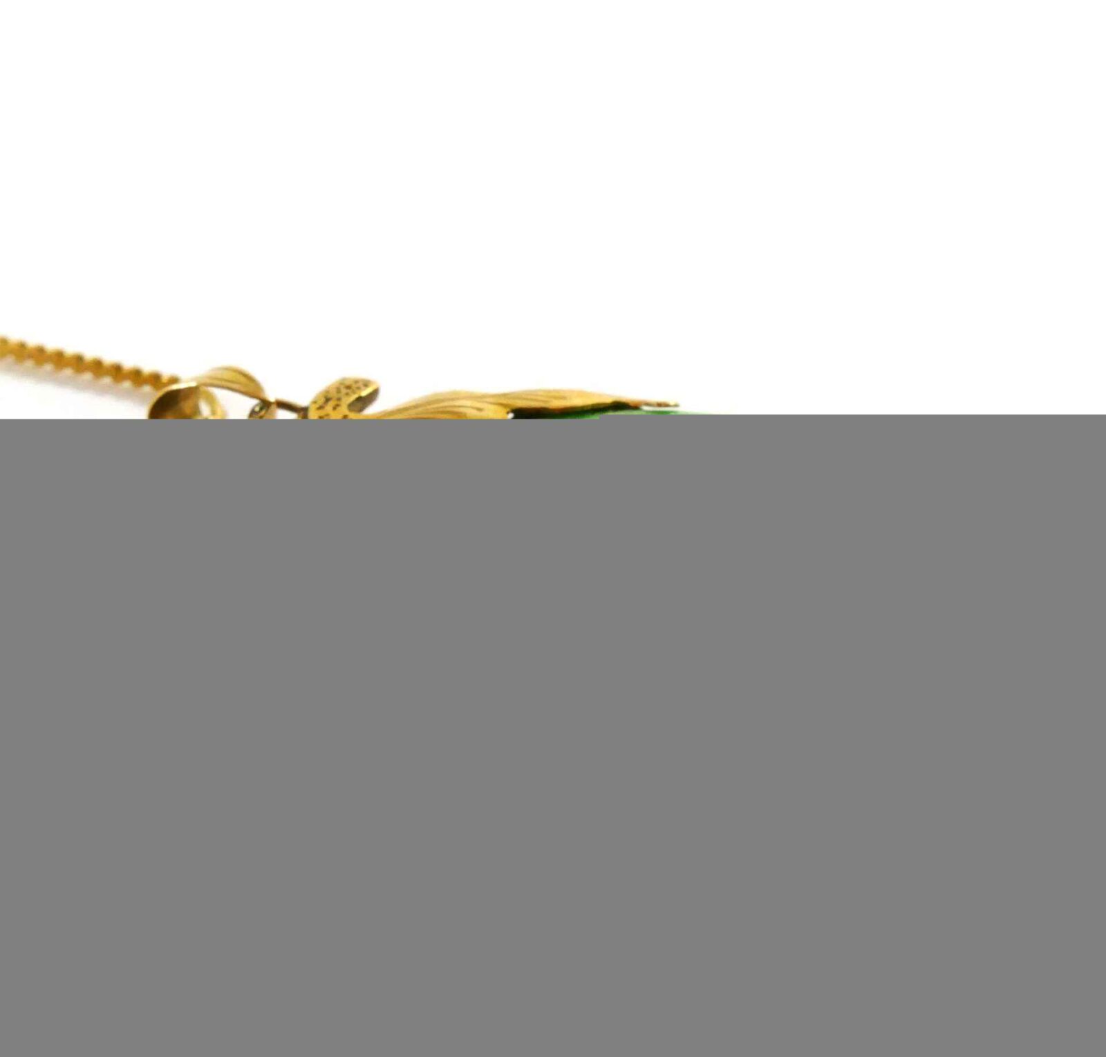 Product Description: This beautiful necklace features a bright green Jade gemstone, set into 14k yellow gold. The gold on the pendant is detailed to have a floral and leaf shape, giving a unique theme to the pie...