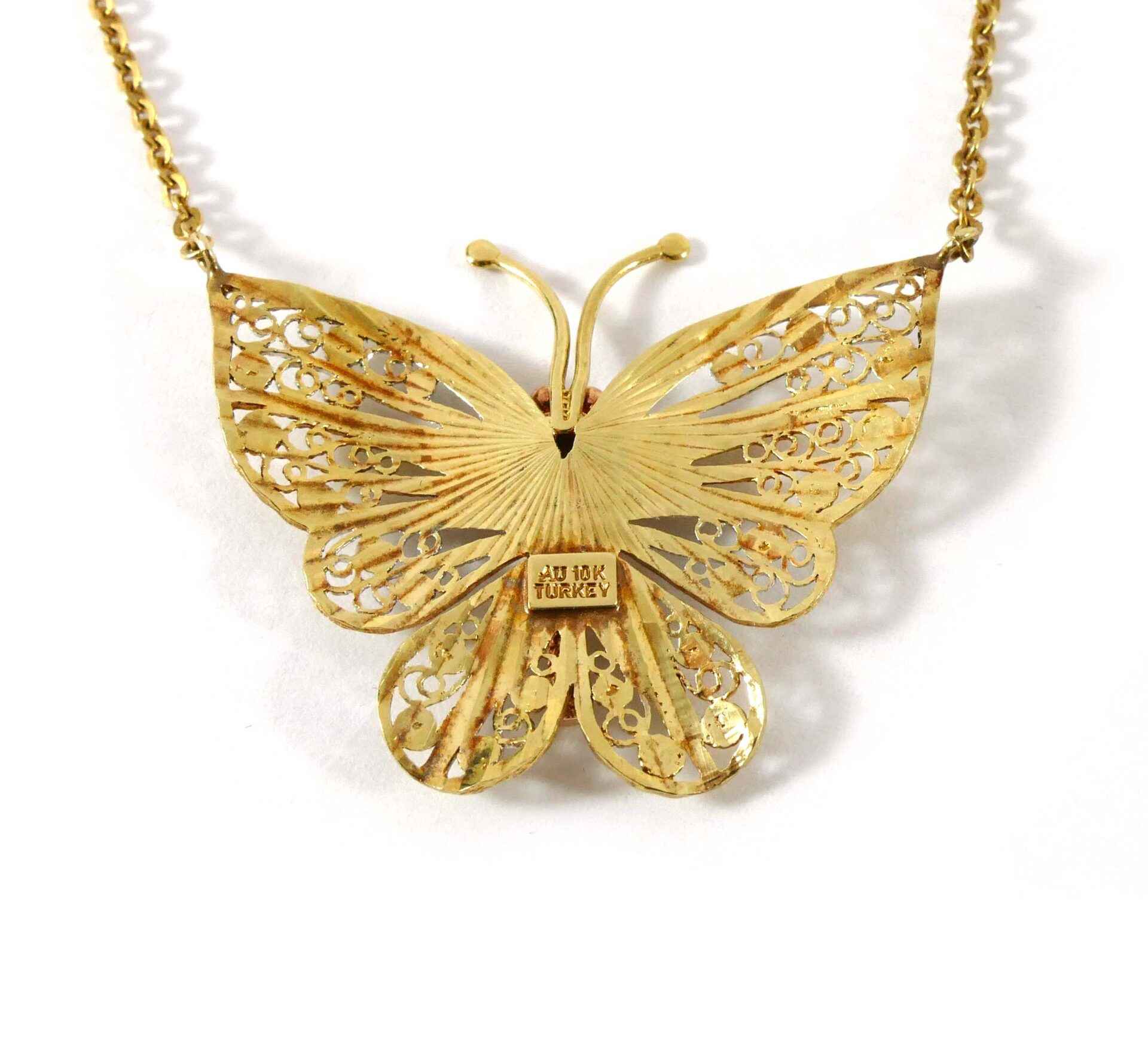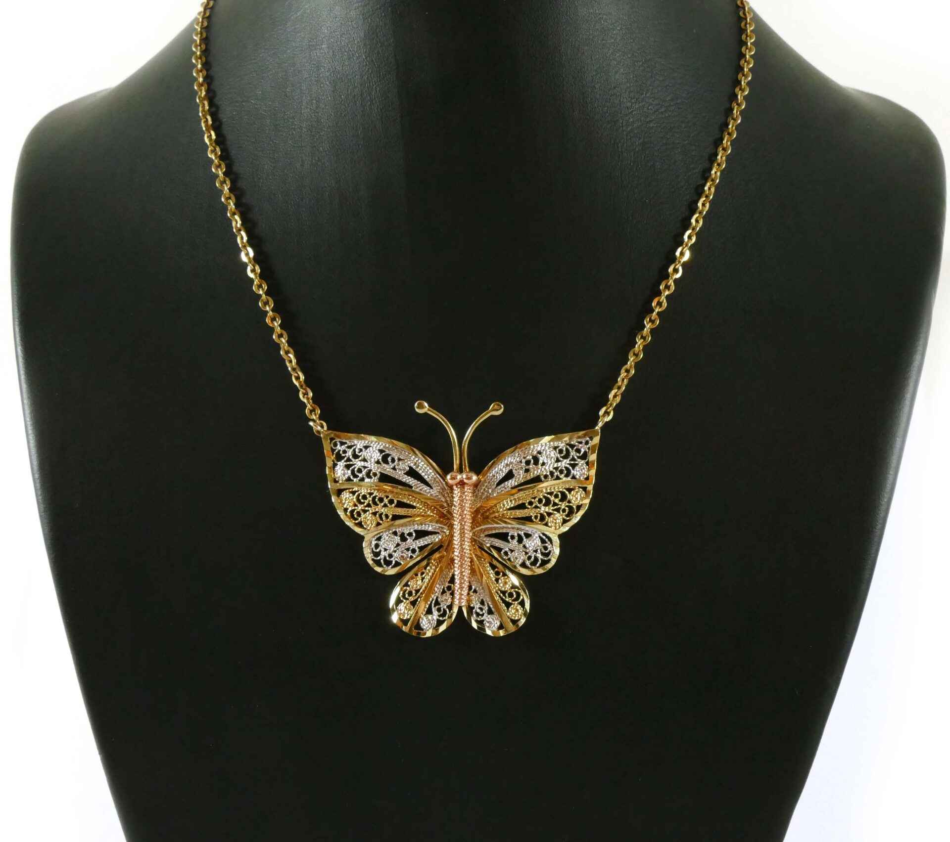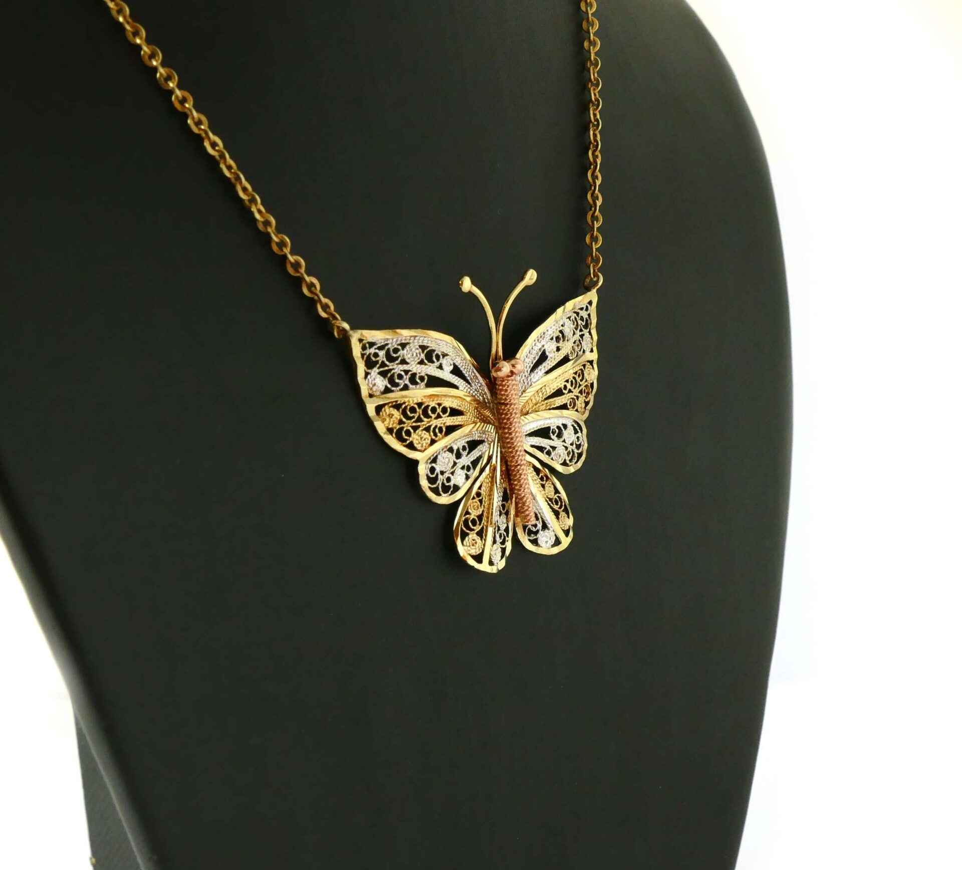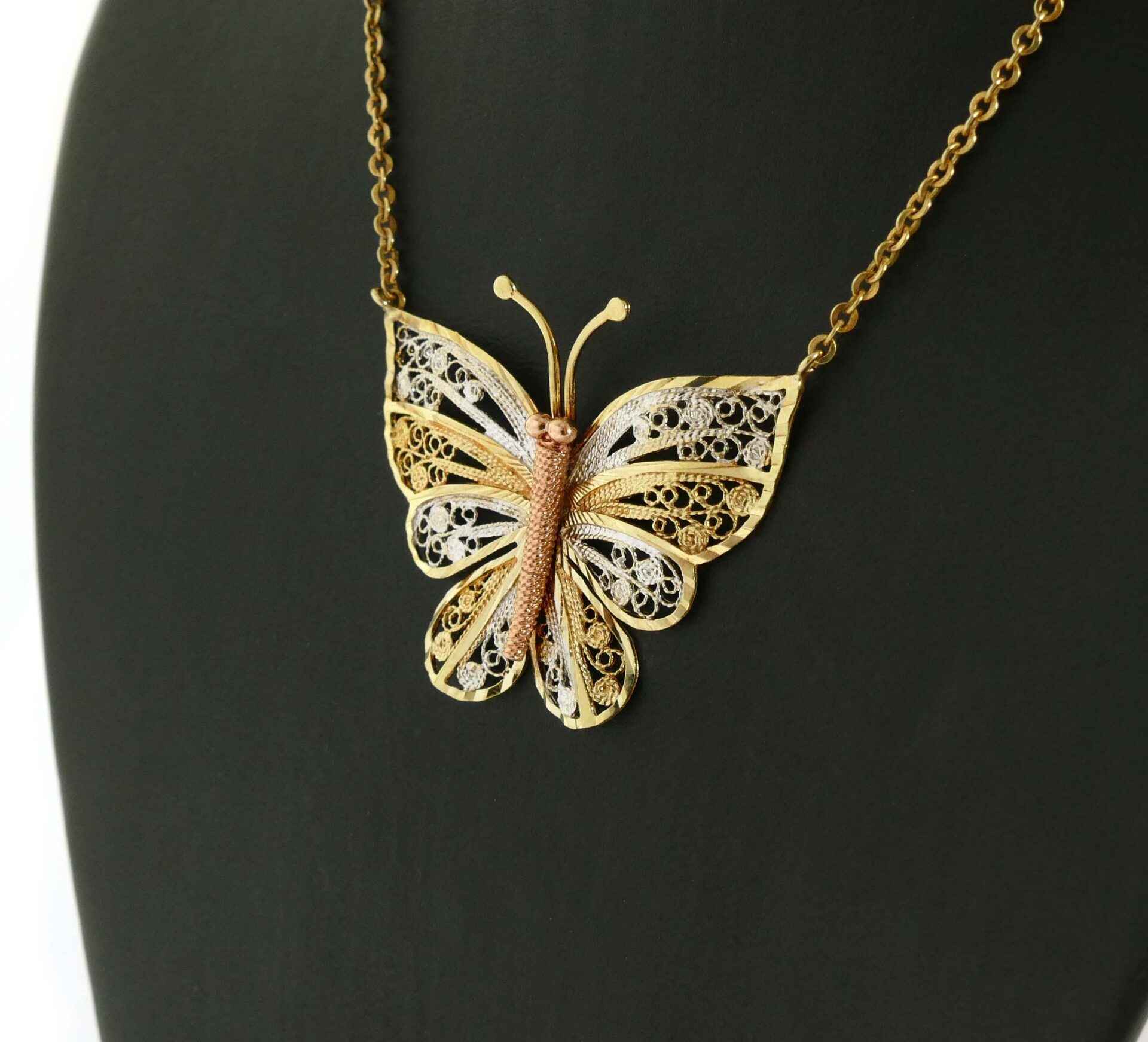 Read Morethis beautiful butterfly pendant is triple-tone, made of 10k white, yellow and rose gold. The body of the butterfly is rose, and the wings and antennas of the butterfly is white and yellow gold intertwined. The colors all compliment each other very well, and make a beautiful put-together piece of jewelry.