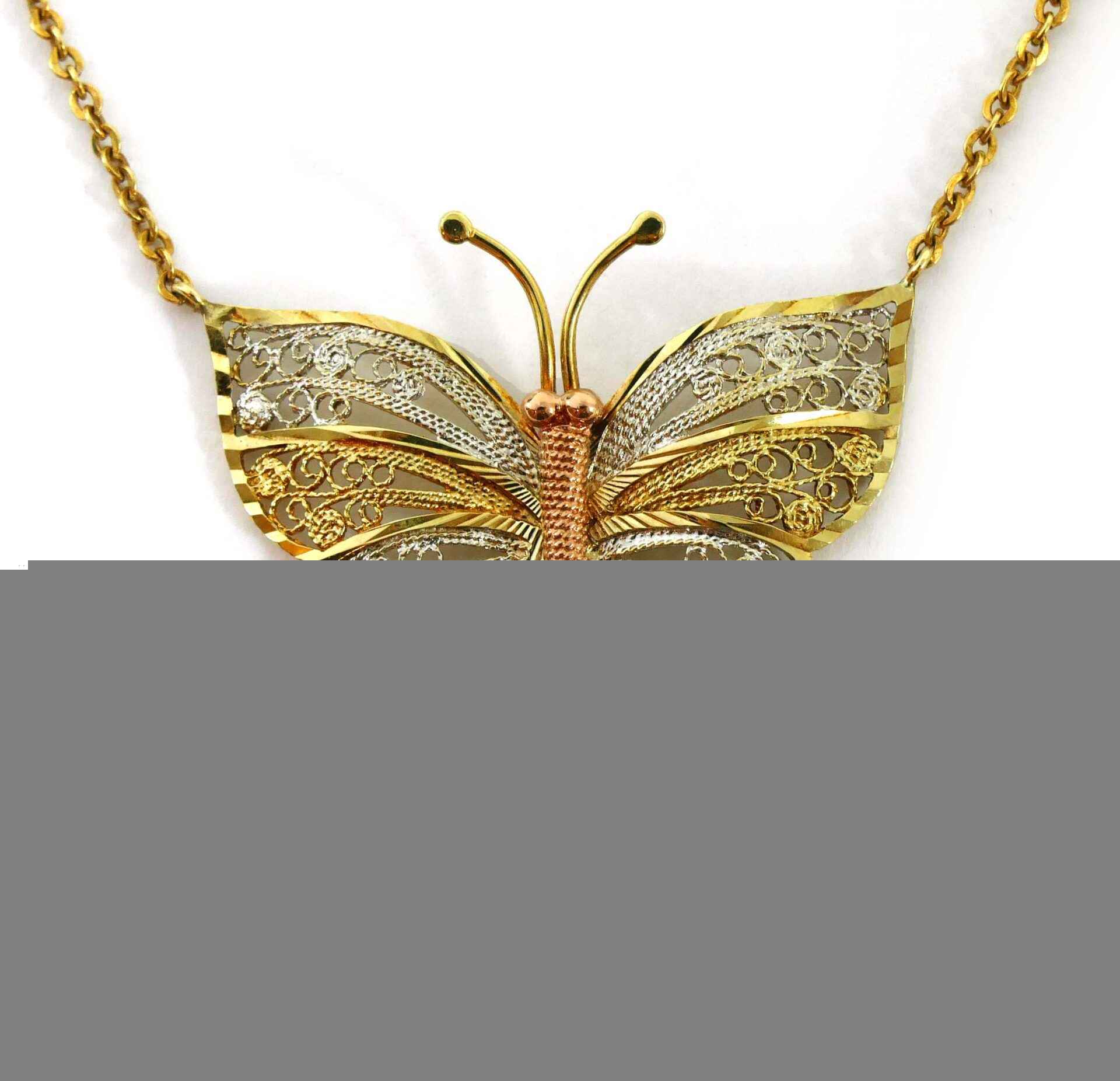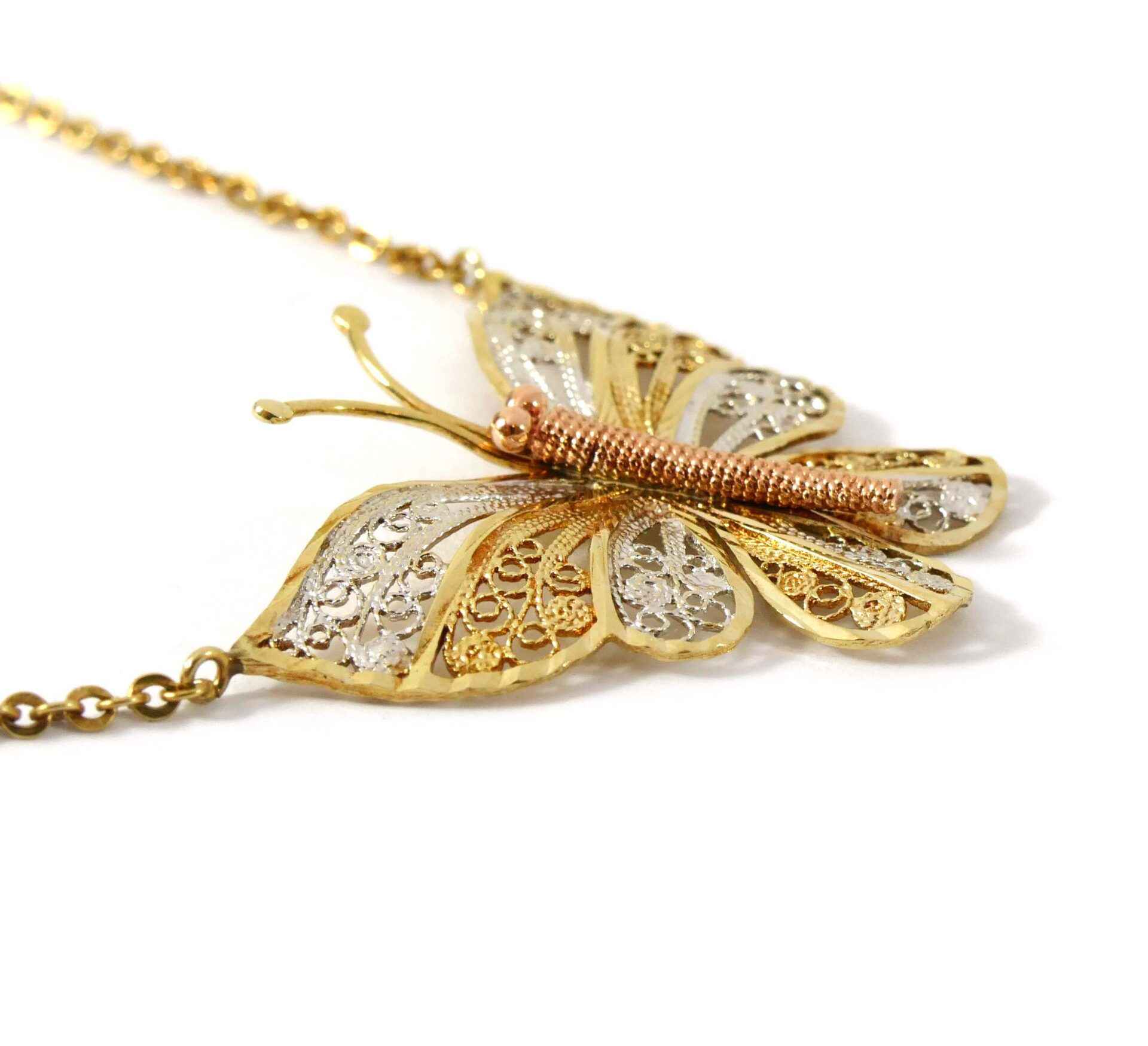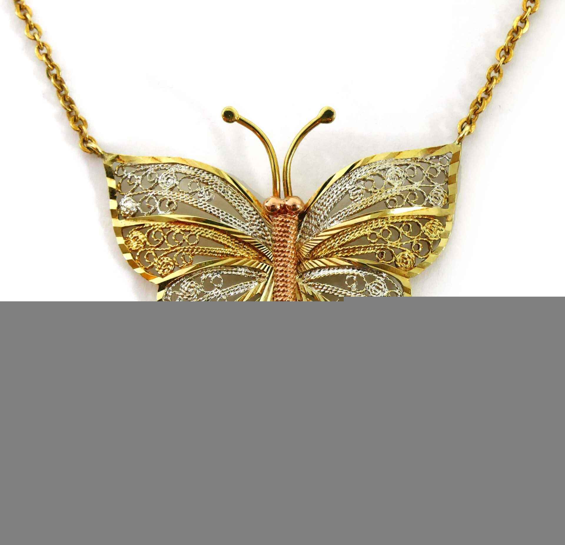 This beautiful butterfly pendant is triple-tone, made of 10k white, yellow and rose gold. The body of the butterfly is rose, and the wings and antennas of the butterfly is white and yellow gold intertwined. The colors all compli...
