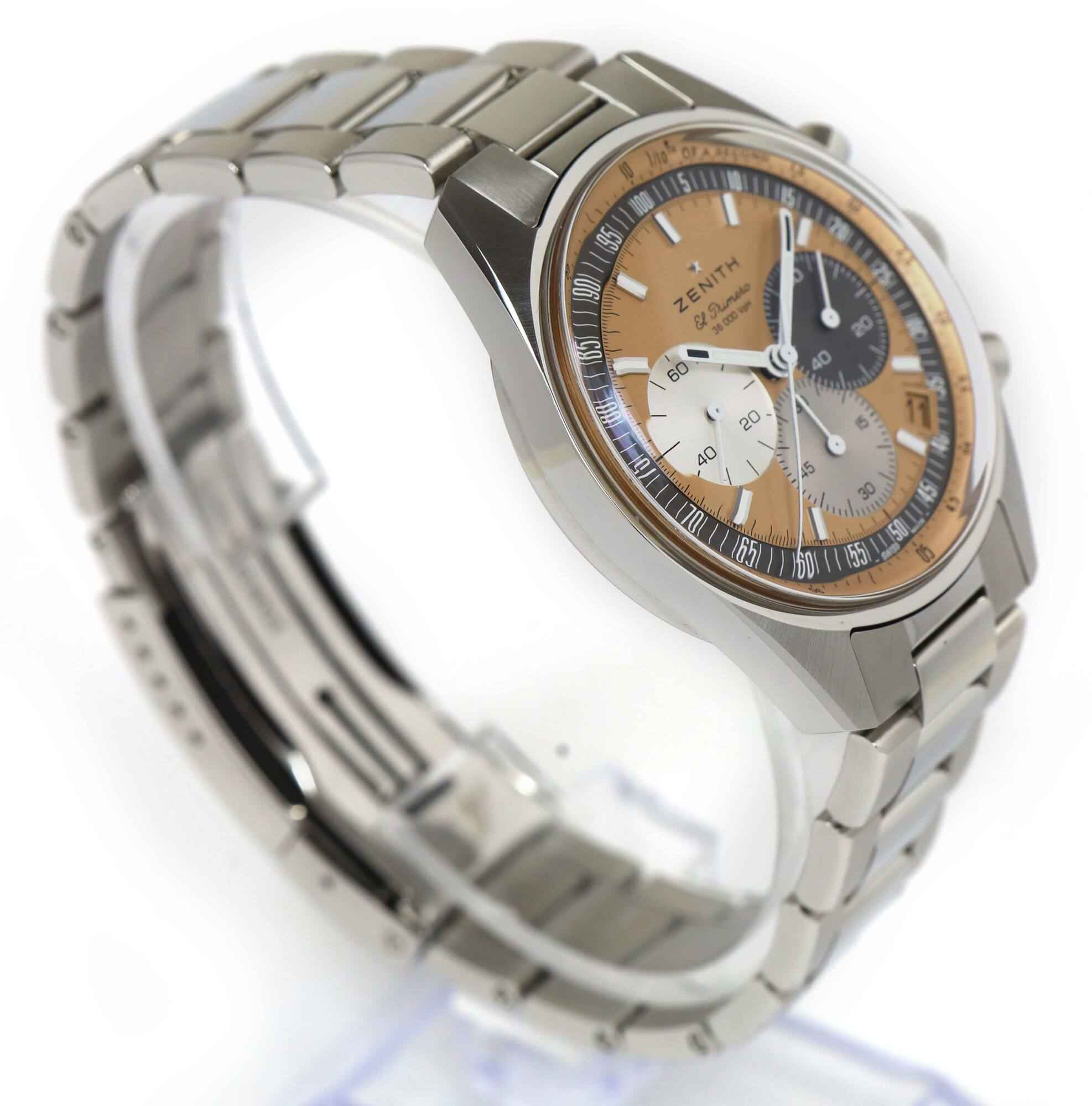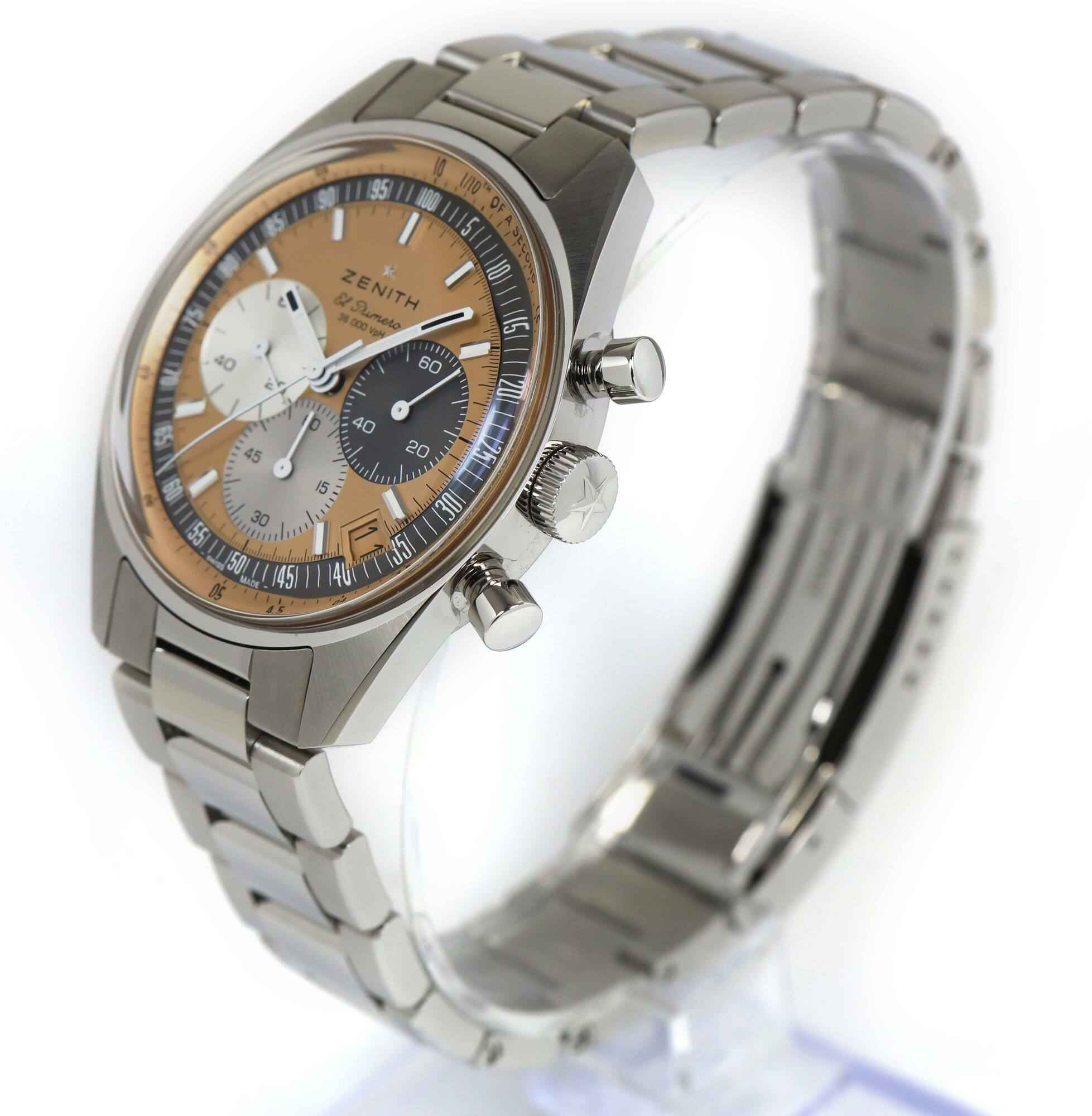 Read Morethis zenith is in super condition and comes with its box, booklet, hang tag, zenith wallet, and warranty card dated august 24th, 2022 as shown in the pictures attached. This watch is part of a limited edition for hodinkee with only 300 total pieces released. This zentih features a 38mm stainless steel case that surrounds a salmon dial and comes on a stainless steel bracelet. The watch functions include hours, minutes, small seconds, date, and chronograph. This watch is in stock and available to ship immediately!
