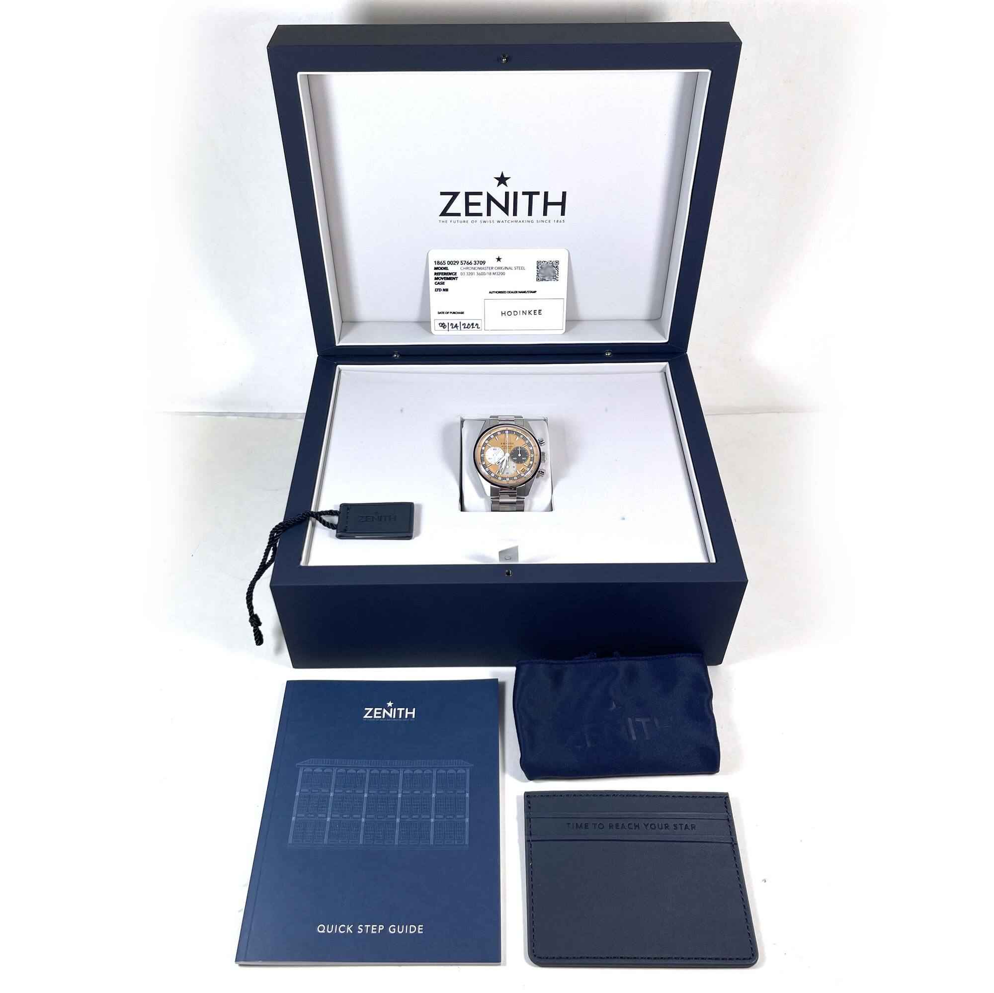 THIS ZENITH IS IN SUPER CONDITION AND COMES WITH ITS BOX, BOOKLET, HANG TAG, ZENITH WALLET, AND WARRANTY CARD DATED AUGUST 24TH, 2022 AS SHOWN IN THE PICTURES ATTACHED. THIS WATCH IS PART OF A LIMITED EDITION FOR HODINKEE WITH ONLY 300 TOTAL PIECES RELEASED...
