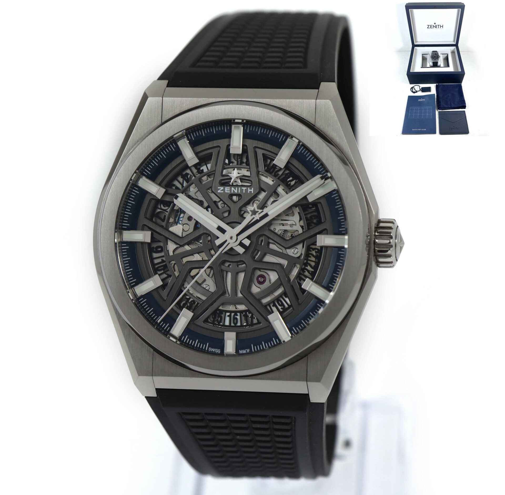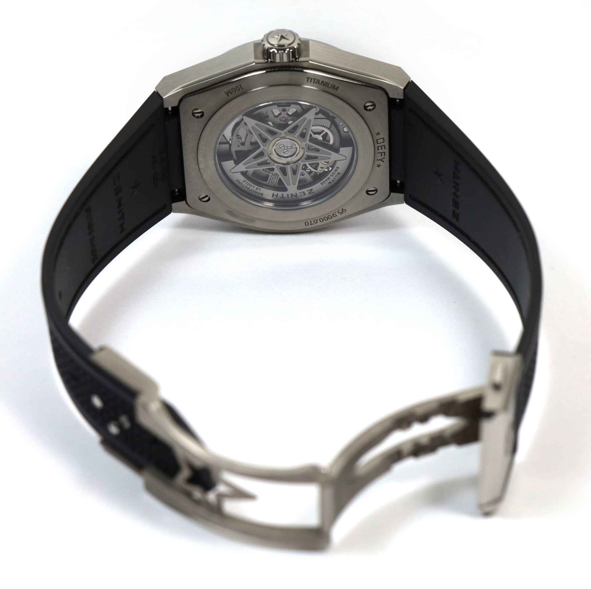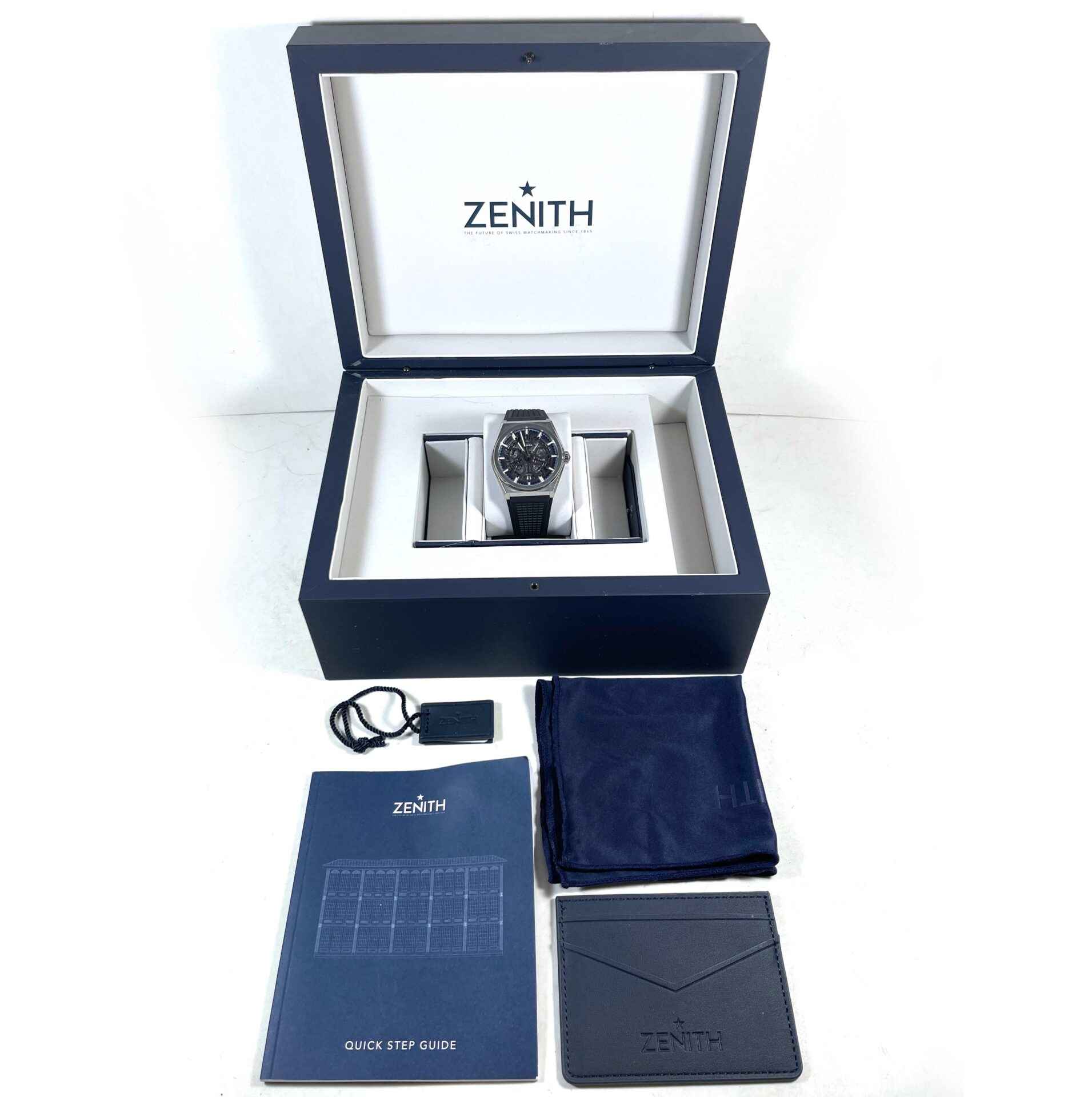 This Zenith is in super condition and comes with its box, booklets, and hang tag only as shown in the photos attached. This watch features a 41mm titanium case that surrounds a skeleton dial and comes on a black rubber s...