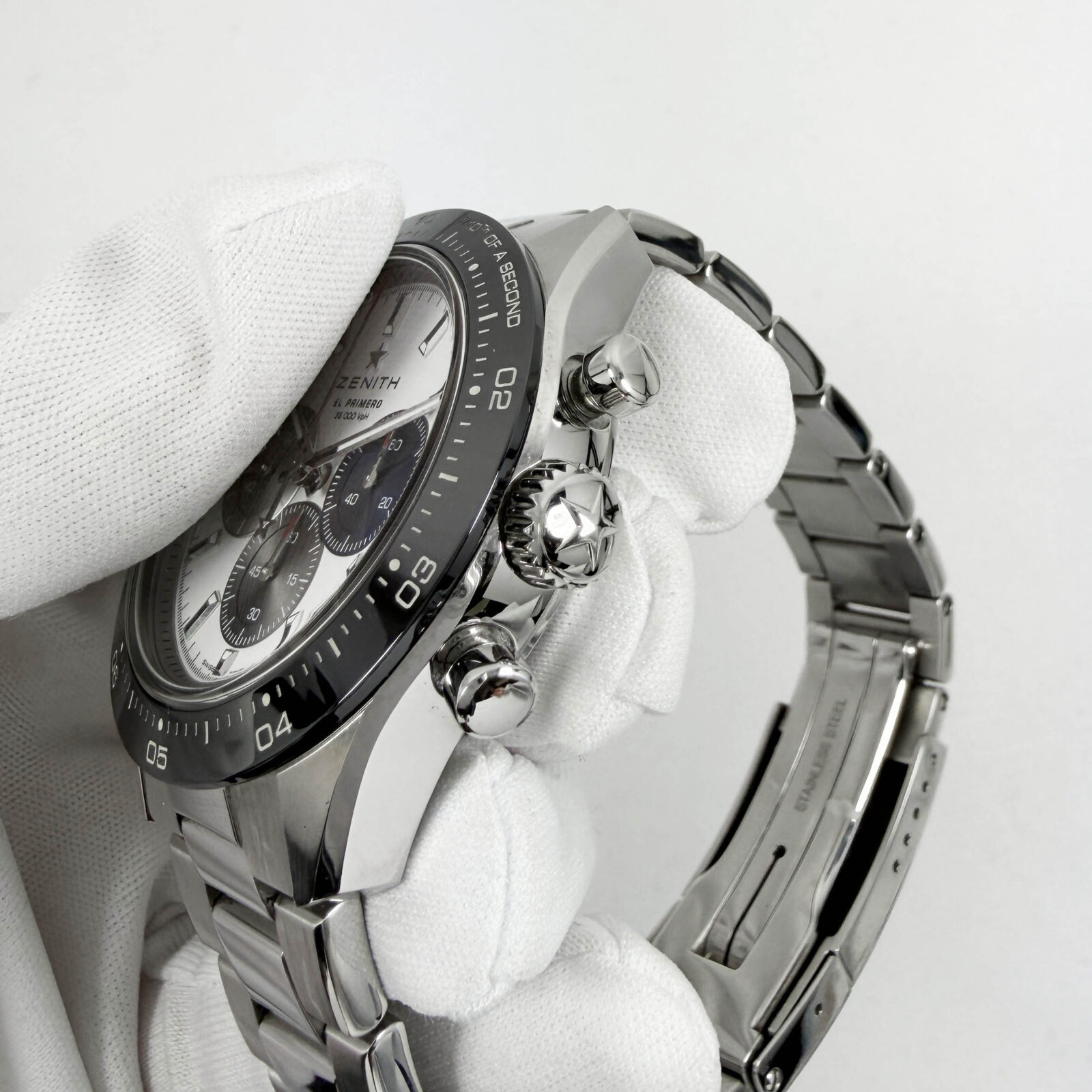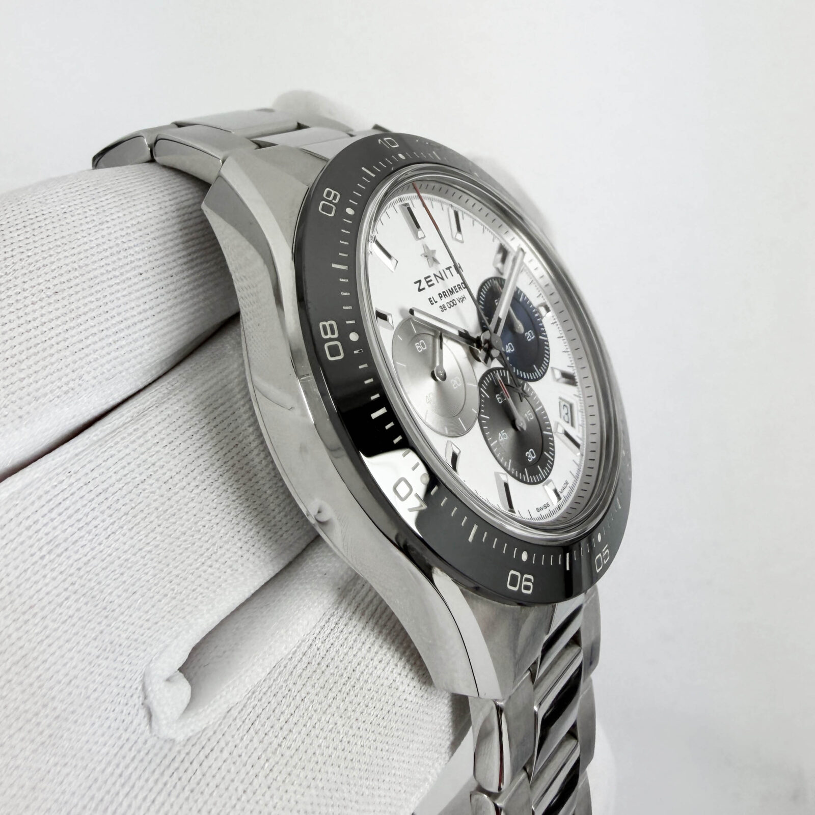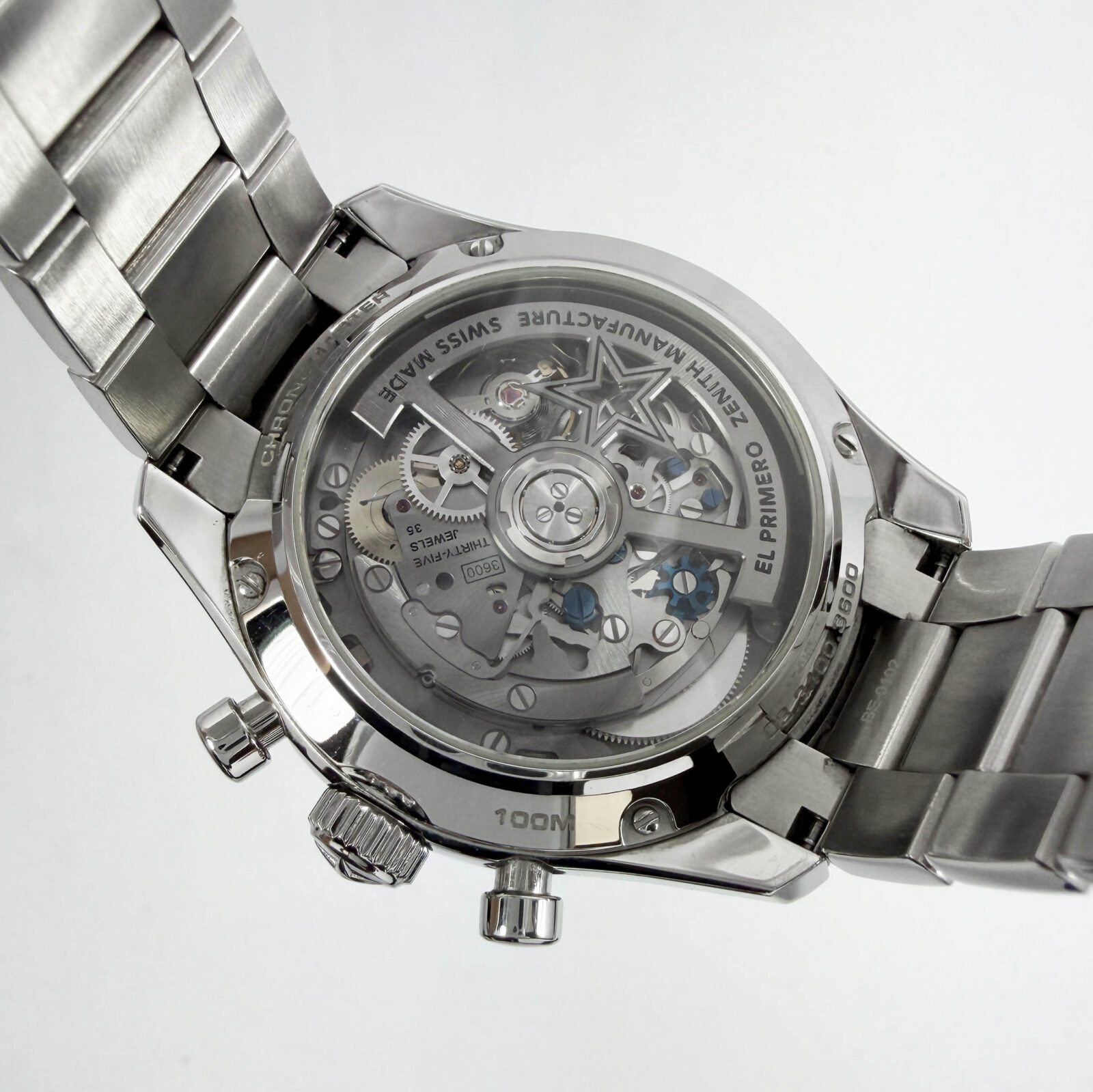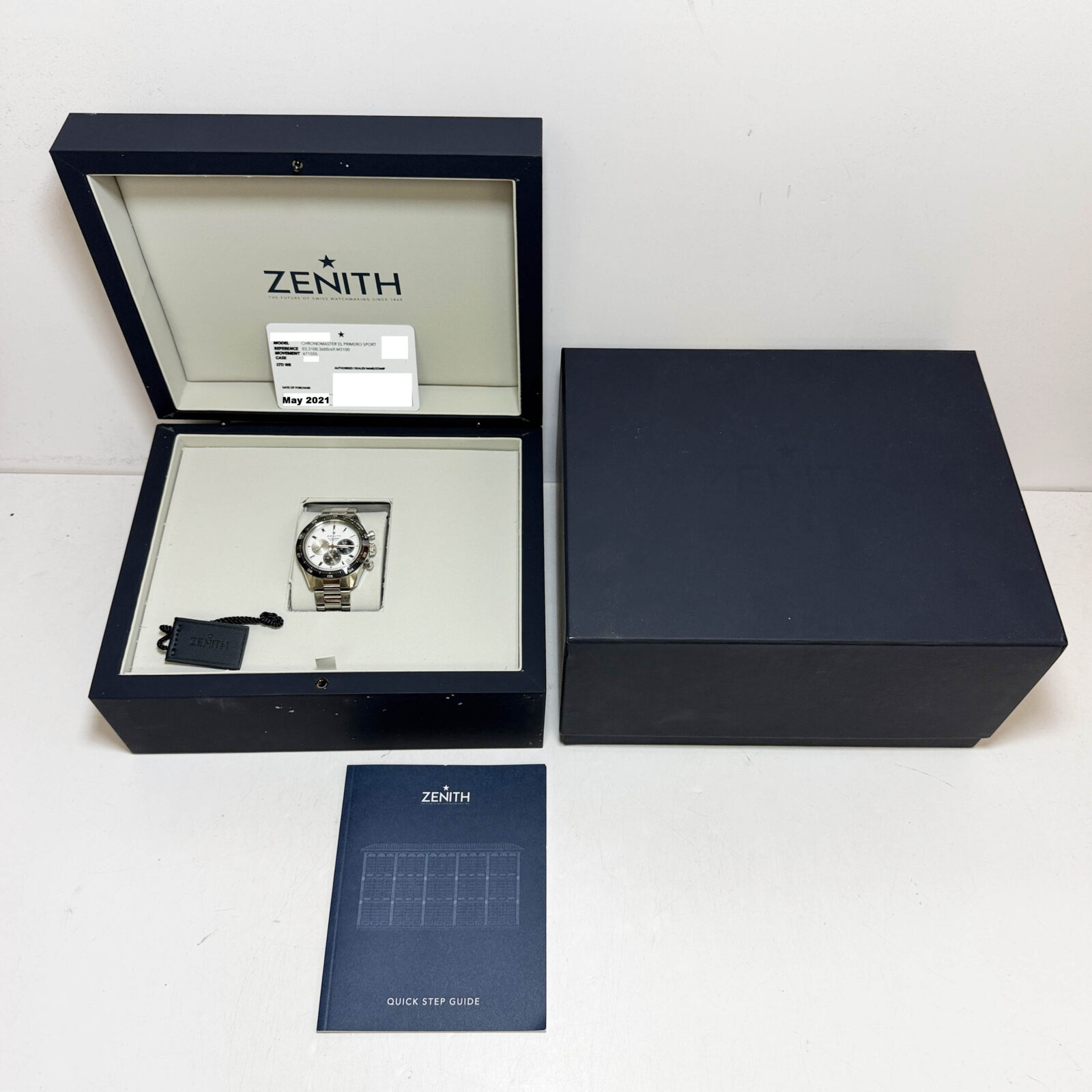 this zenith watch comes with its box, hangtag, booklet, and warranty card dated may 2021. The photos shown are of the exact watch being sold and accurately represent its condition. This watch is in stock and ready to ship immediately!